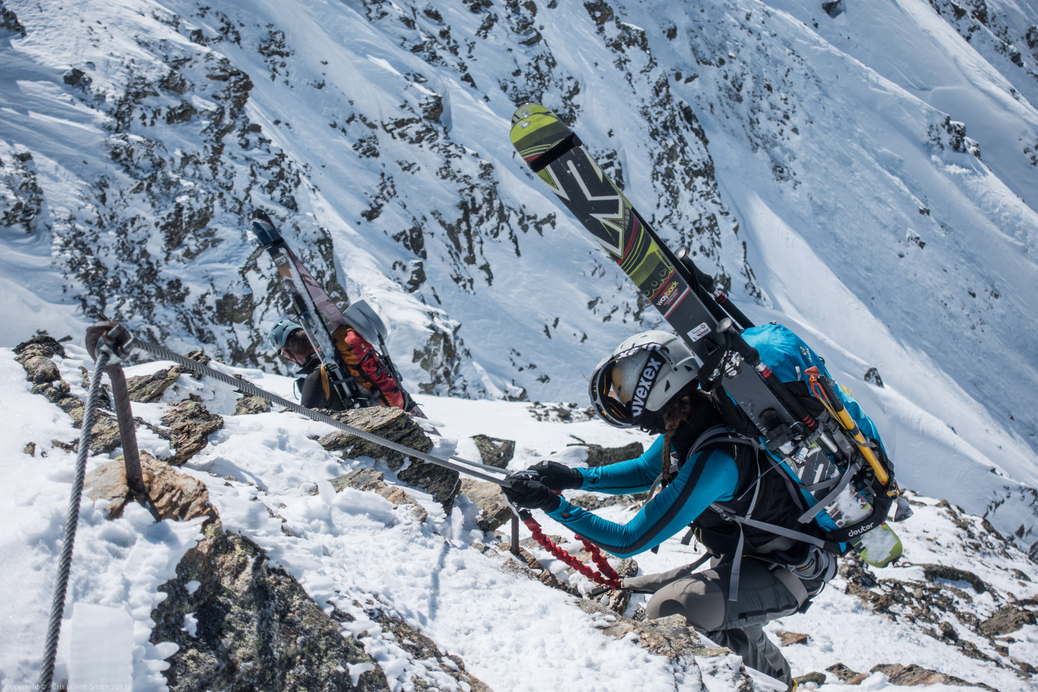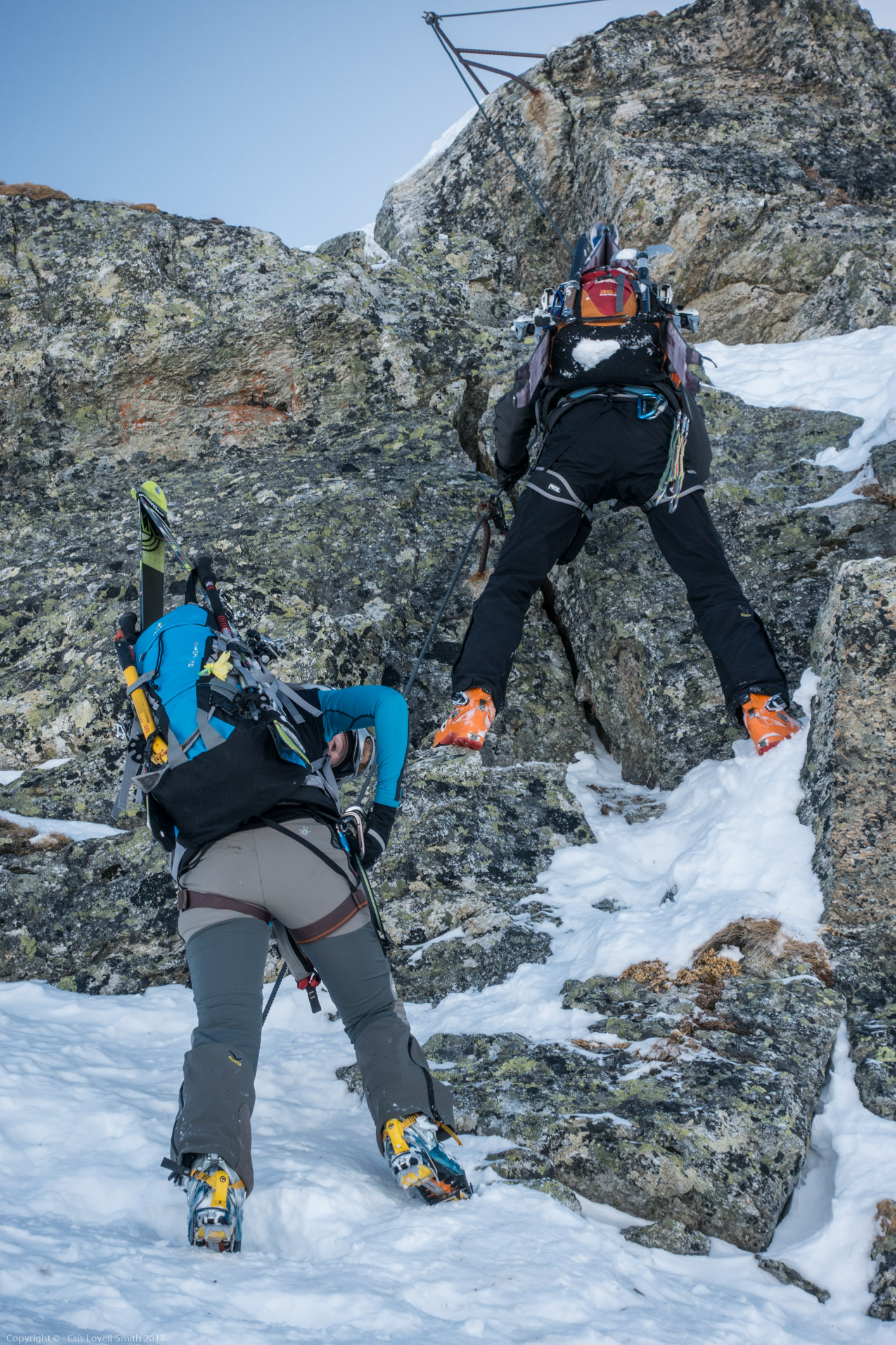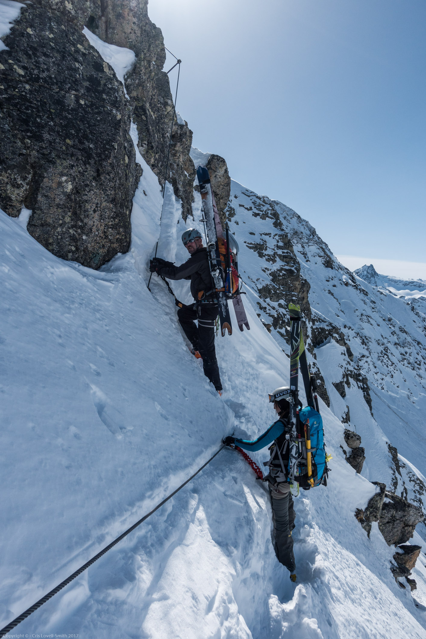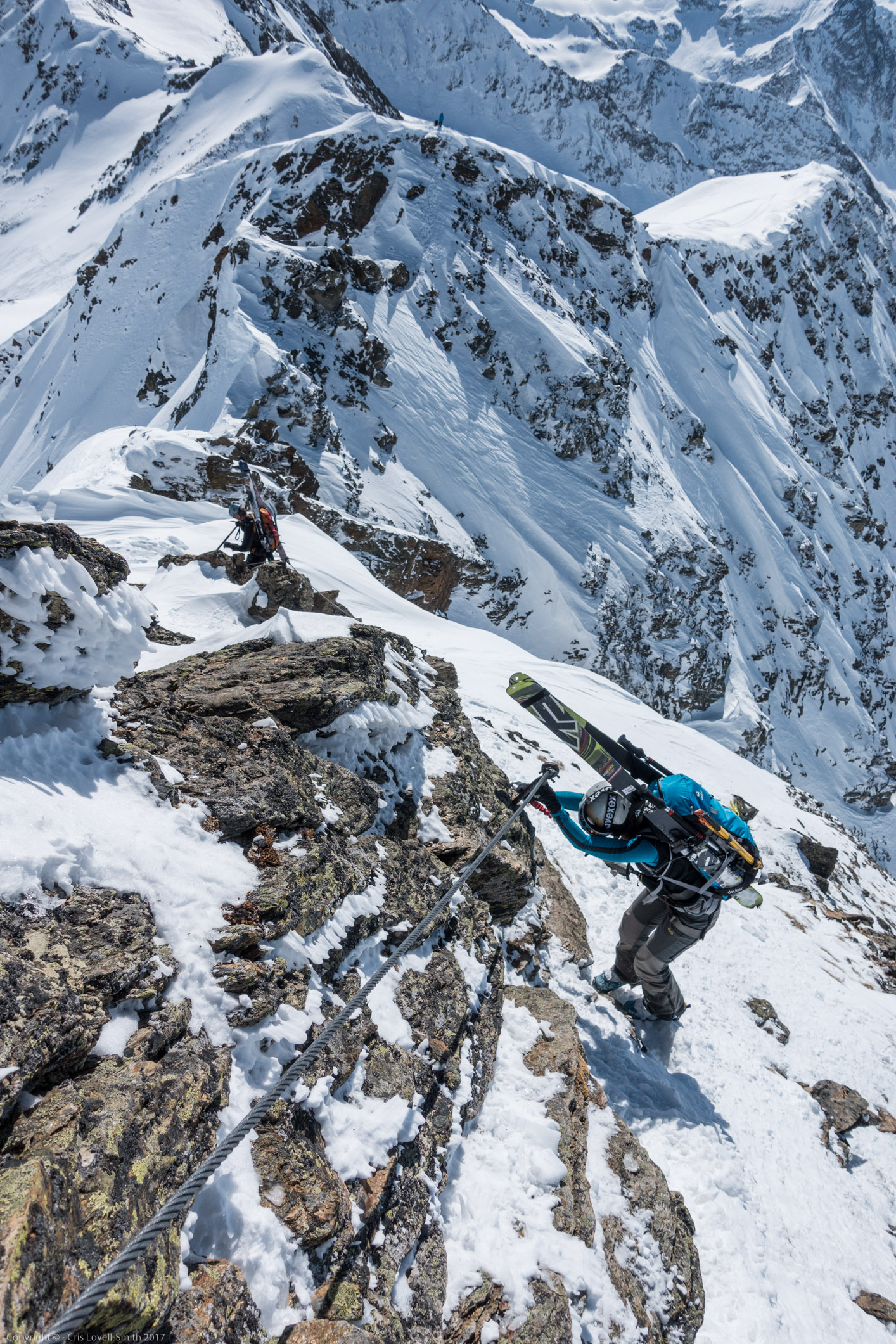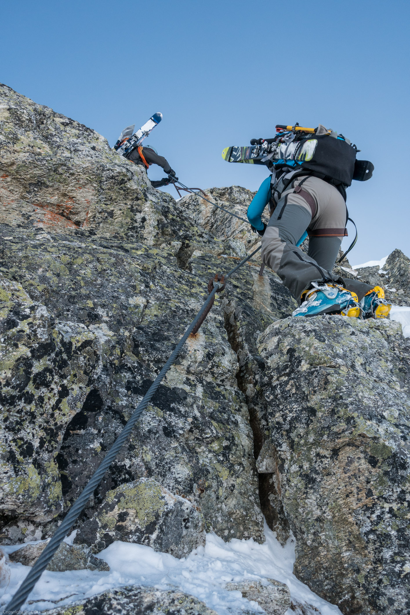 At the top of the Riffelbahn II ski lift we put on our harnesses, strapped our skis to our packs and walked the minute to the start of the fixed route. The via ferrata is a mix between grades A to D. It ascends about 200 vertical metres gently and the guide says it should take 2.5 hours including getting back down. Hmmm… Here’s all the info. you might want in this handy pdf.