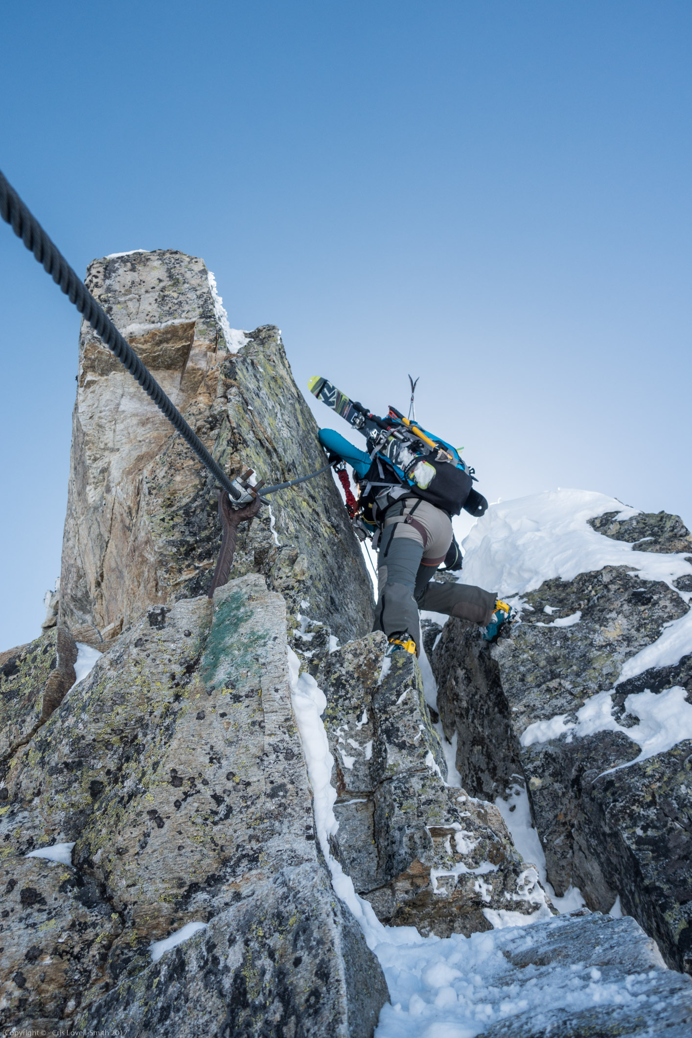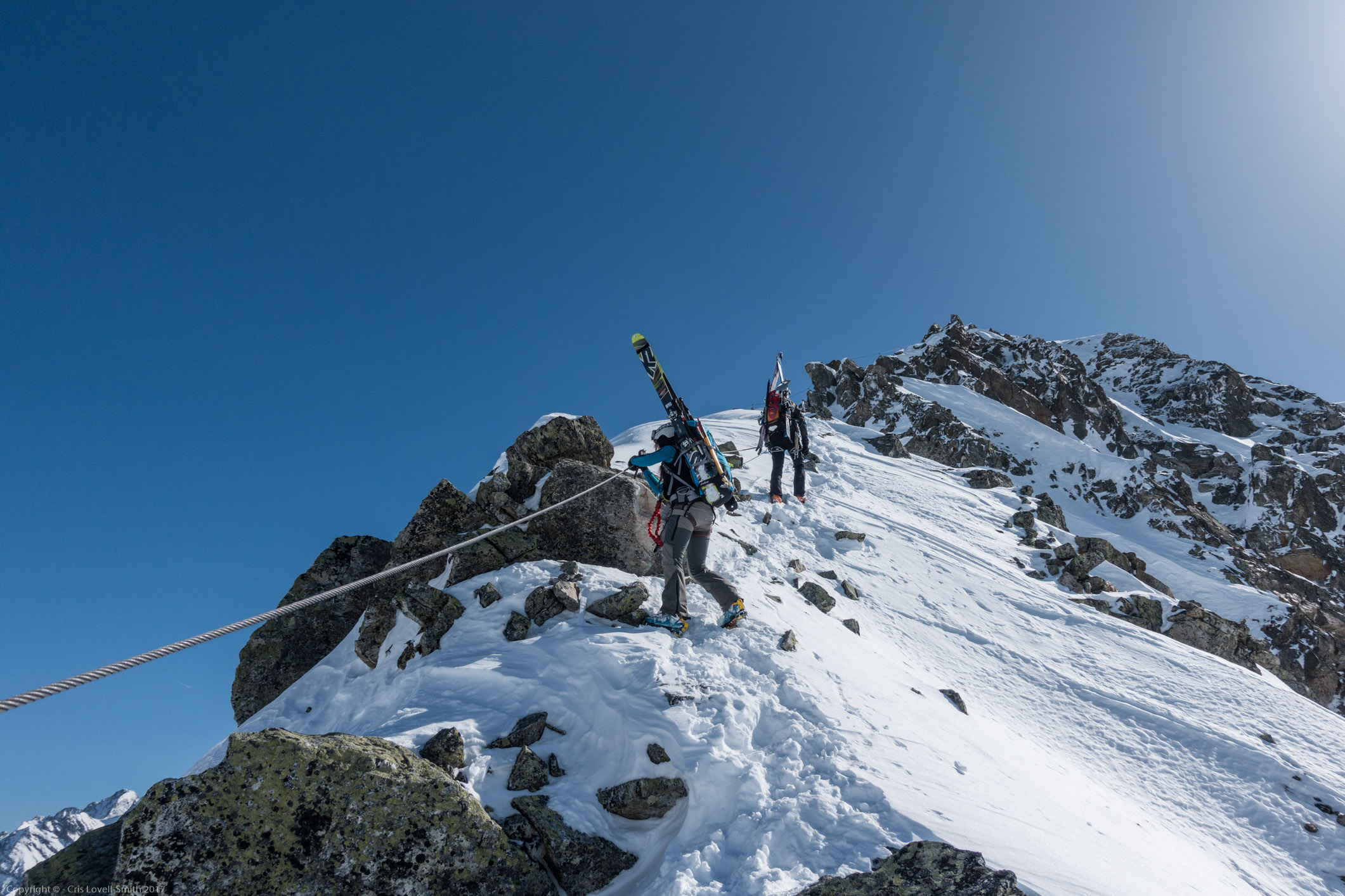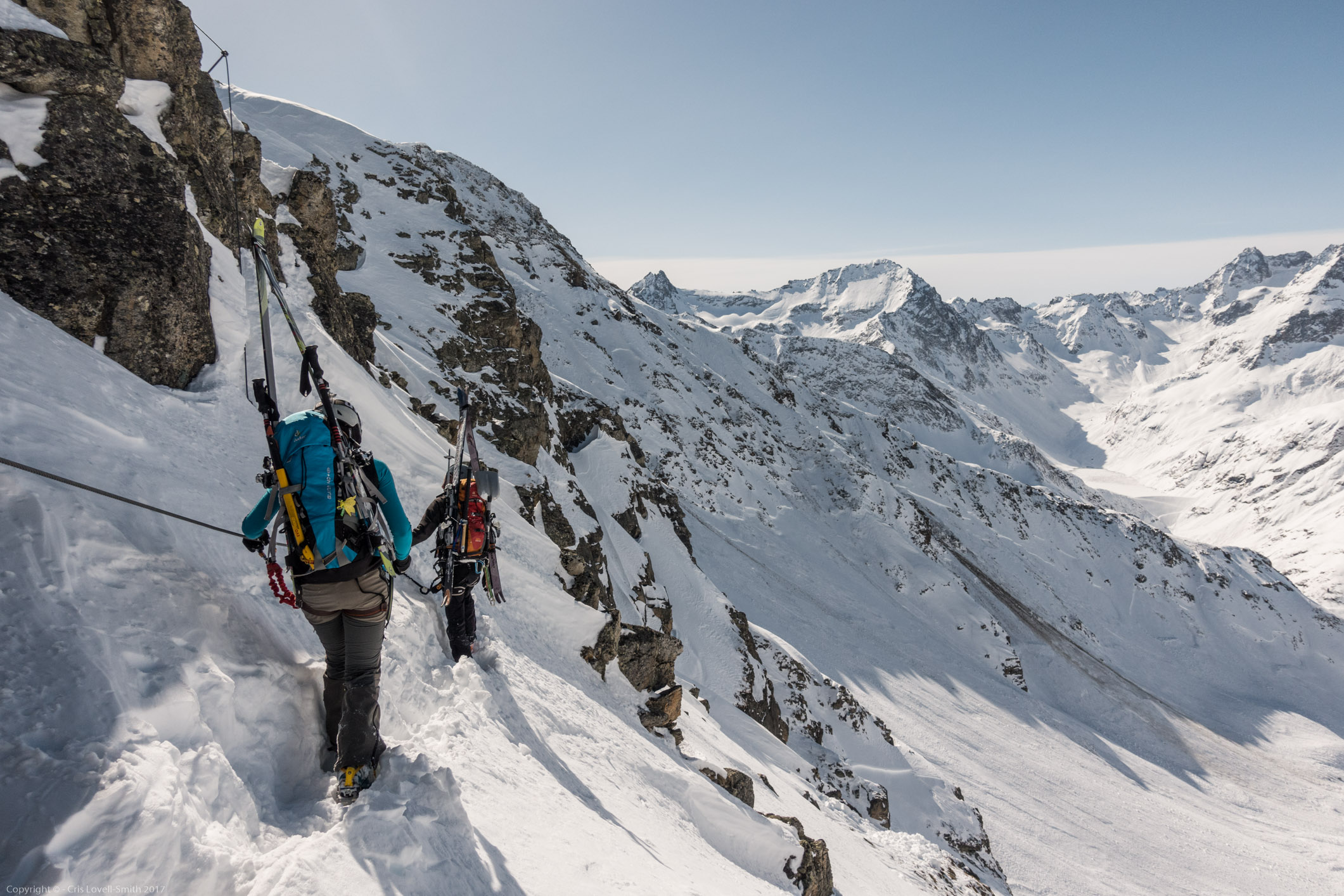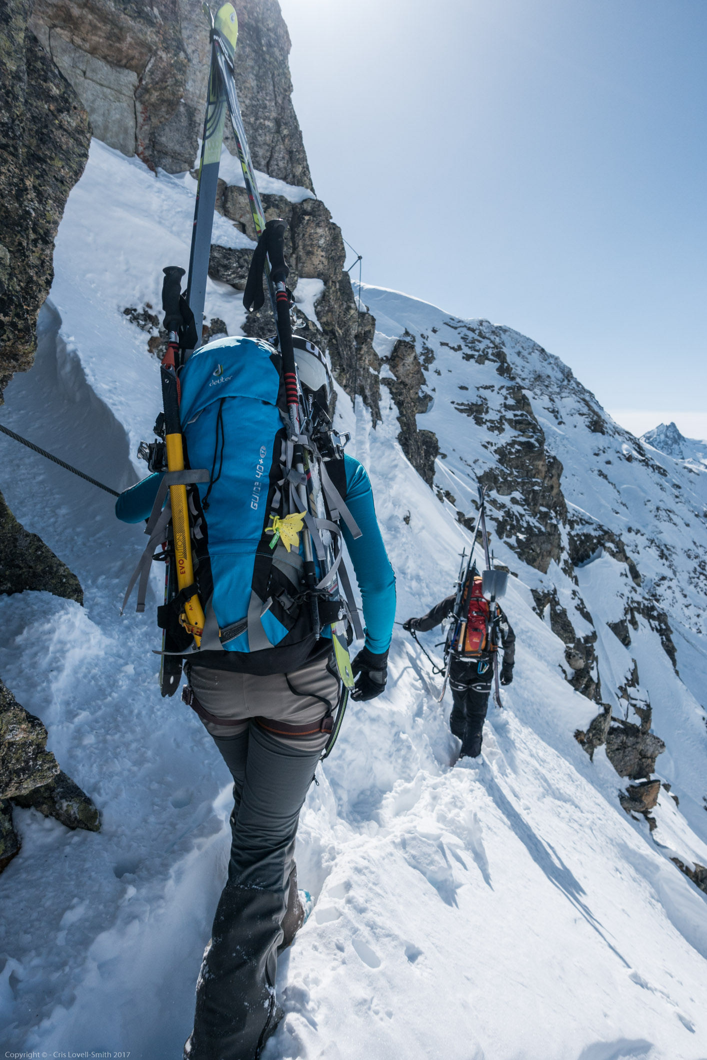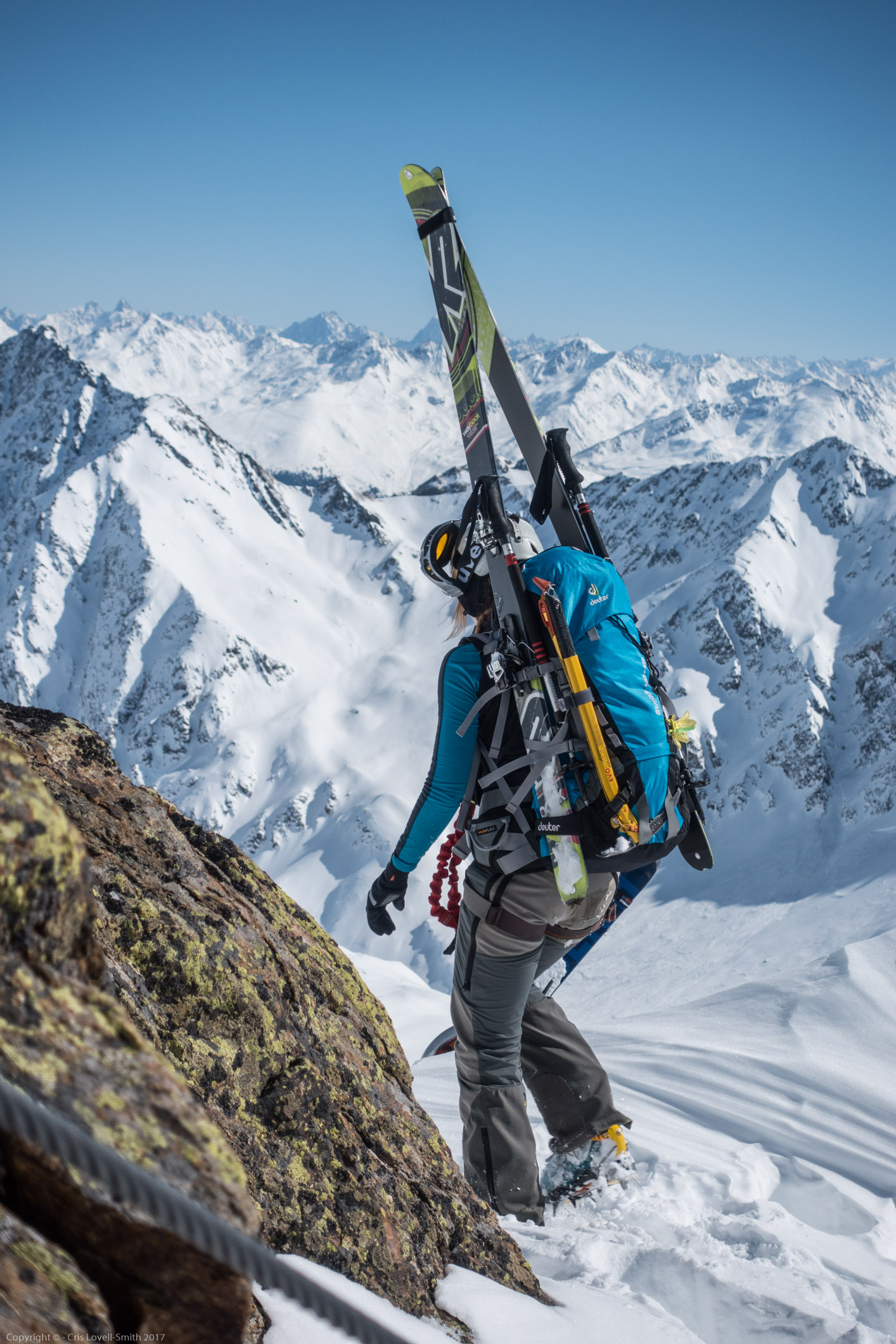 At the top of the Riffelbahn II ski lift we put on our harnesses, strapped our skis to our packs and walked the minute to the start of the fixed route. The via ferrata is a mix between grades A to D. It ascends about 200 vertical metres gently and the guide says it should take 2.5 hours including getting back down. Hmmm… Here’s all the info. you might want in this handy pdf.