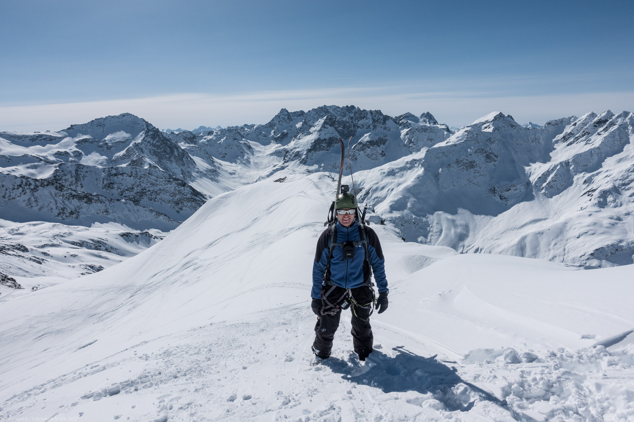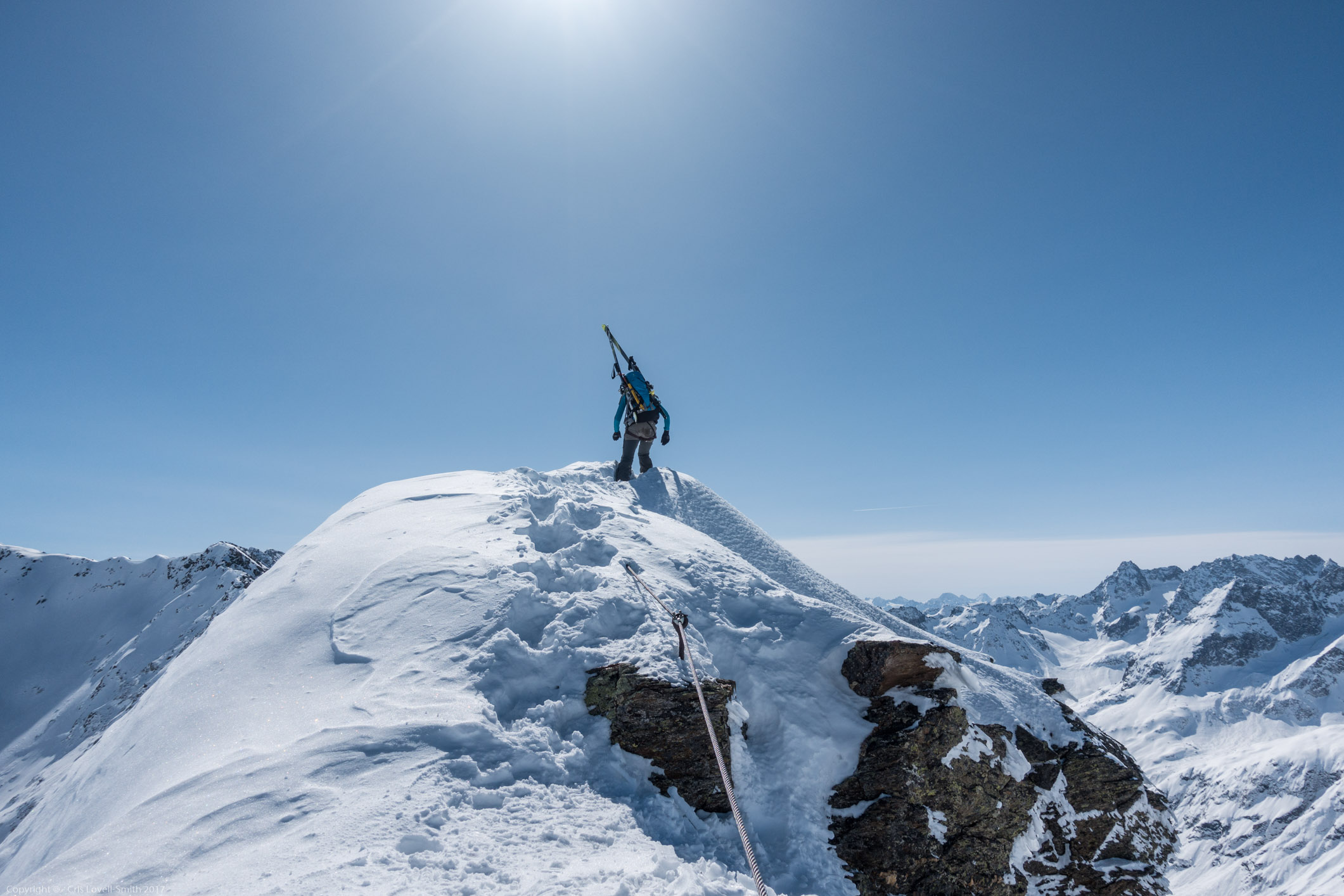 It was beautiful spring weather. Jörg picked Leonie and I up from Lindau and we drove to Sankt Anton. The plan was to do the Arlberger Winterklettersteig. It’s a via ferrata route that starts at 2650 m above sea level and heads along a ridgeline to the Vordere-Rendlespitze before dropping down to the Mitterkarspitze and continuing without rope (there’s no need for one) to the Roßfallscharte. It can be reached either by taking the ski lifts (Rendlbahn + Riffelbahn I + Riffelbahn II) to the start or by ascending the 1200 odd metres from Sankt Anton am Arlberg. We paid the 17.50 EUR for the one way lift pass and took the lazy way up.
