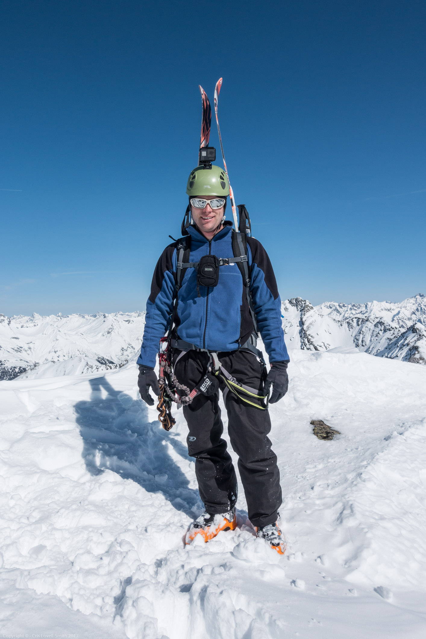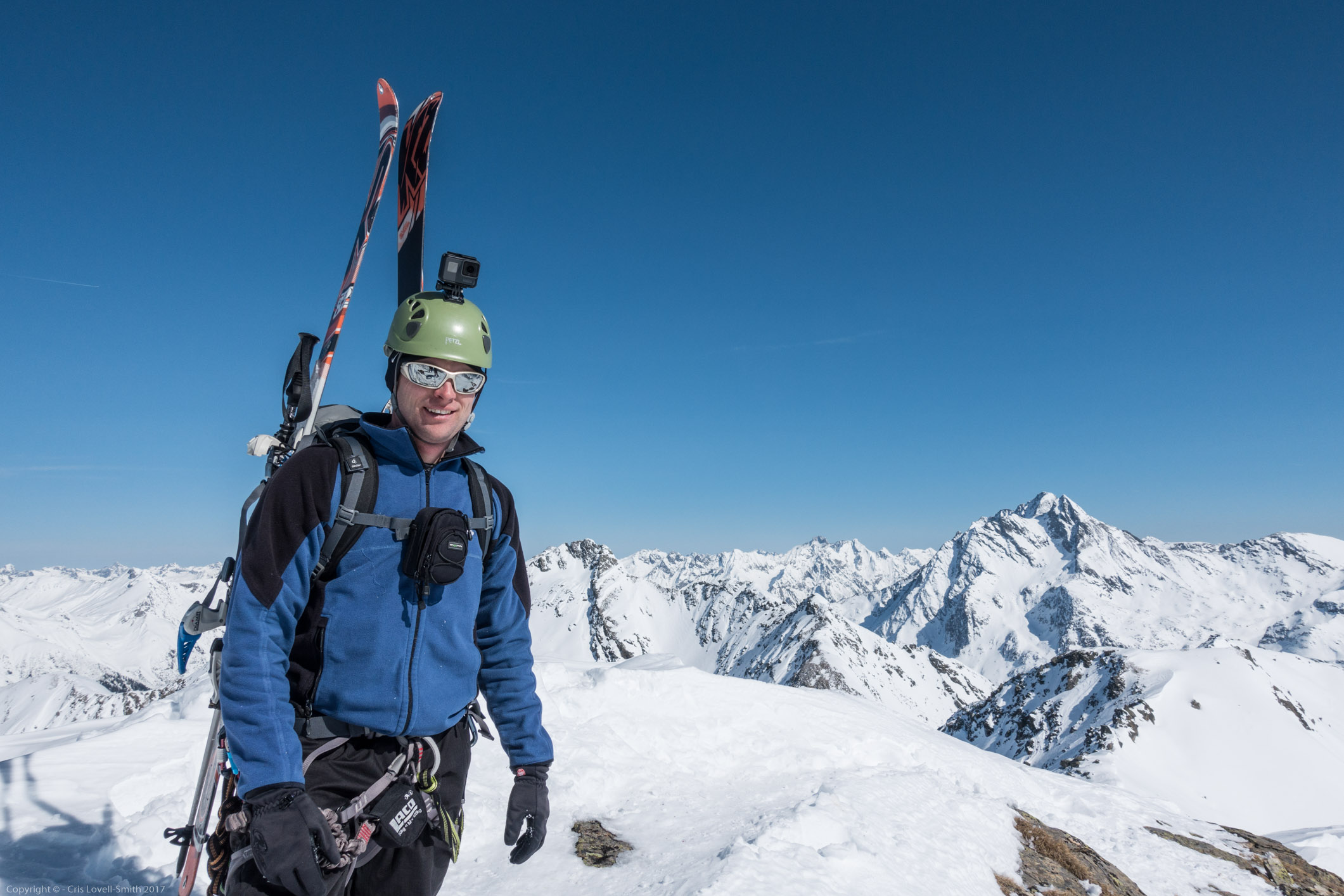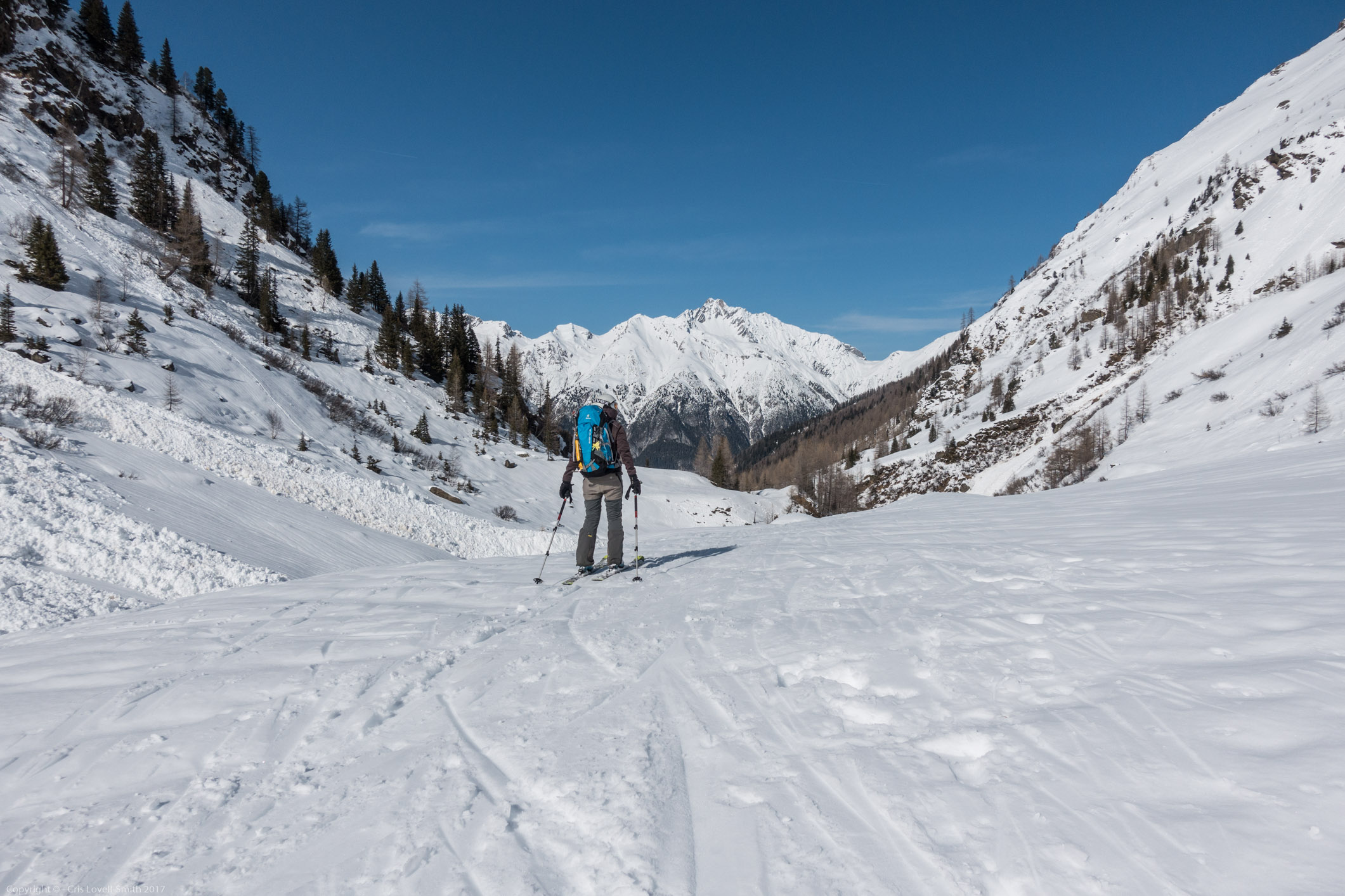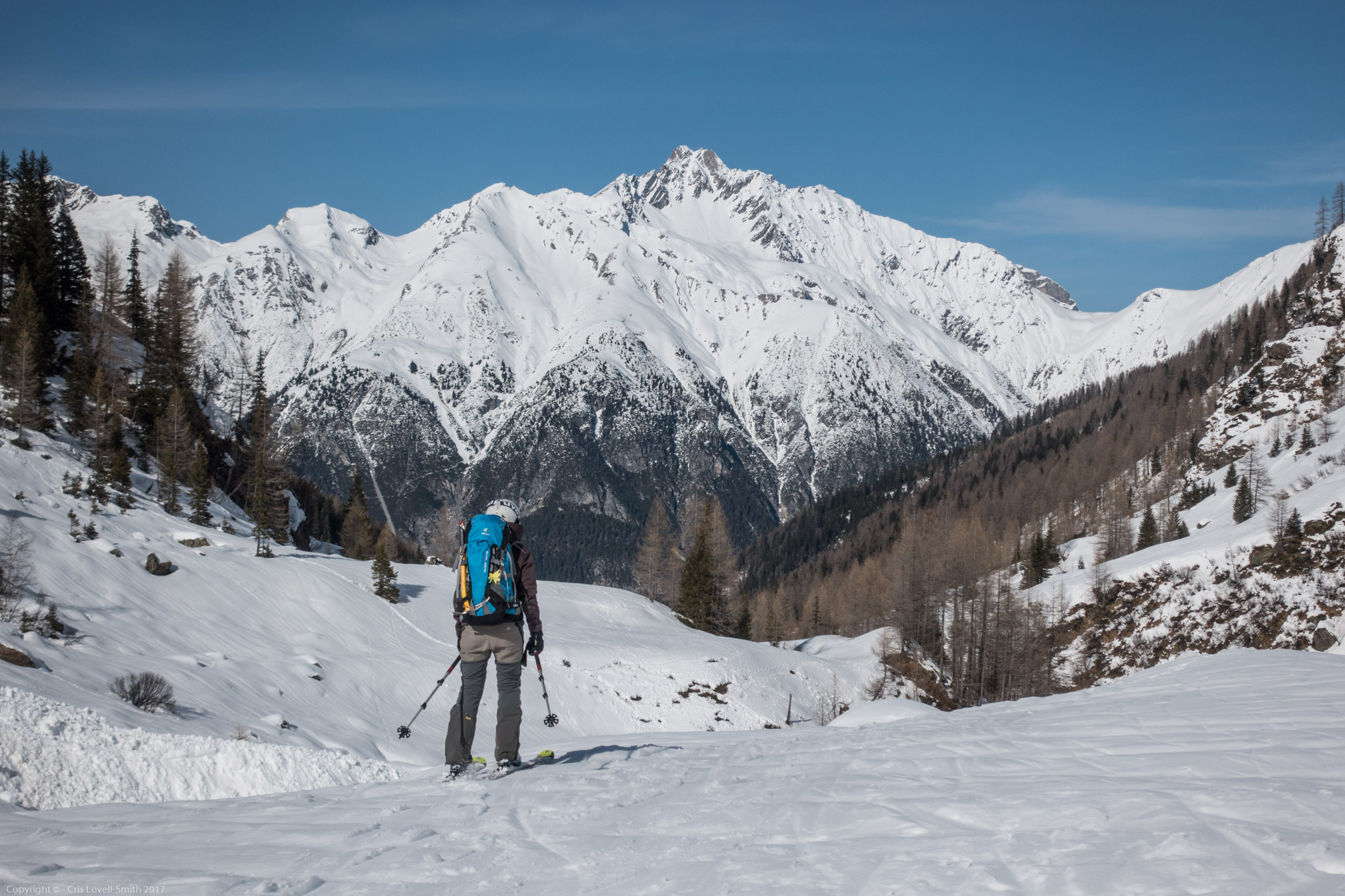 We stopped for a break at the Mitterkarspitze before unstrapping our skis, switching our boots to ski mode and heading down to the East by snowy slopes to the Malfonbach. The snow was heavier than I had hoped and a bit difficult at times to turn in. Later I encountered a very small 20 m patch of delicious powder before we descended enough to have spring conditions. We skied all the way out the Malfonbach down to Pettneu. The last part of the 1500 vertical metre descent was down a very narrow ski track on which we could do nothing but snow plough.