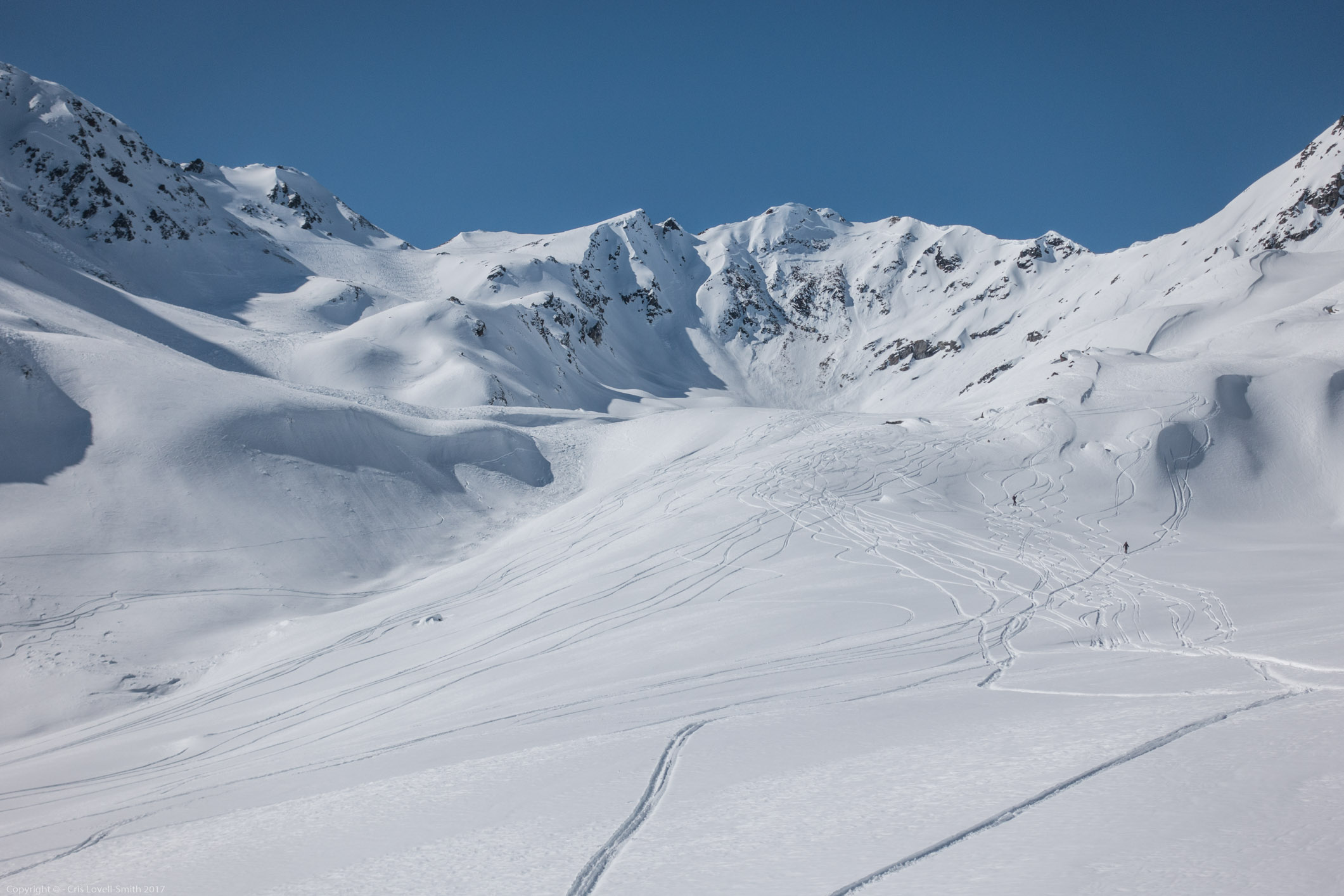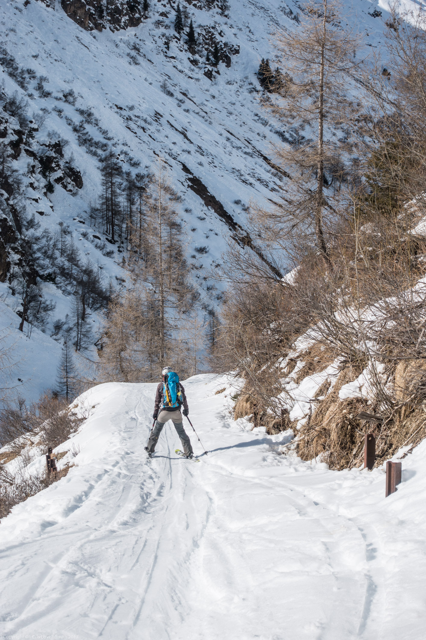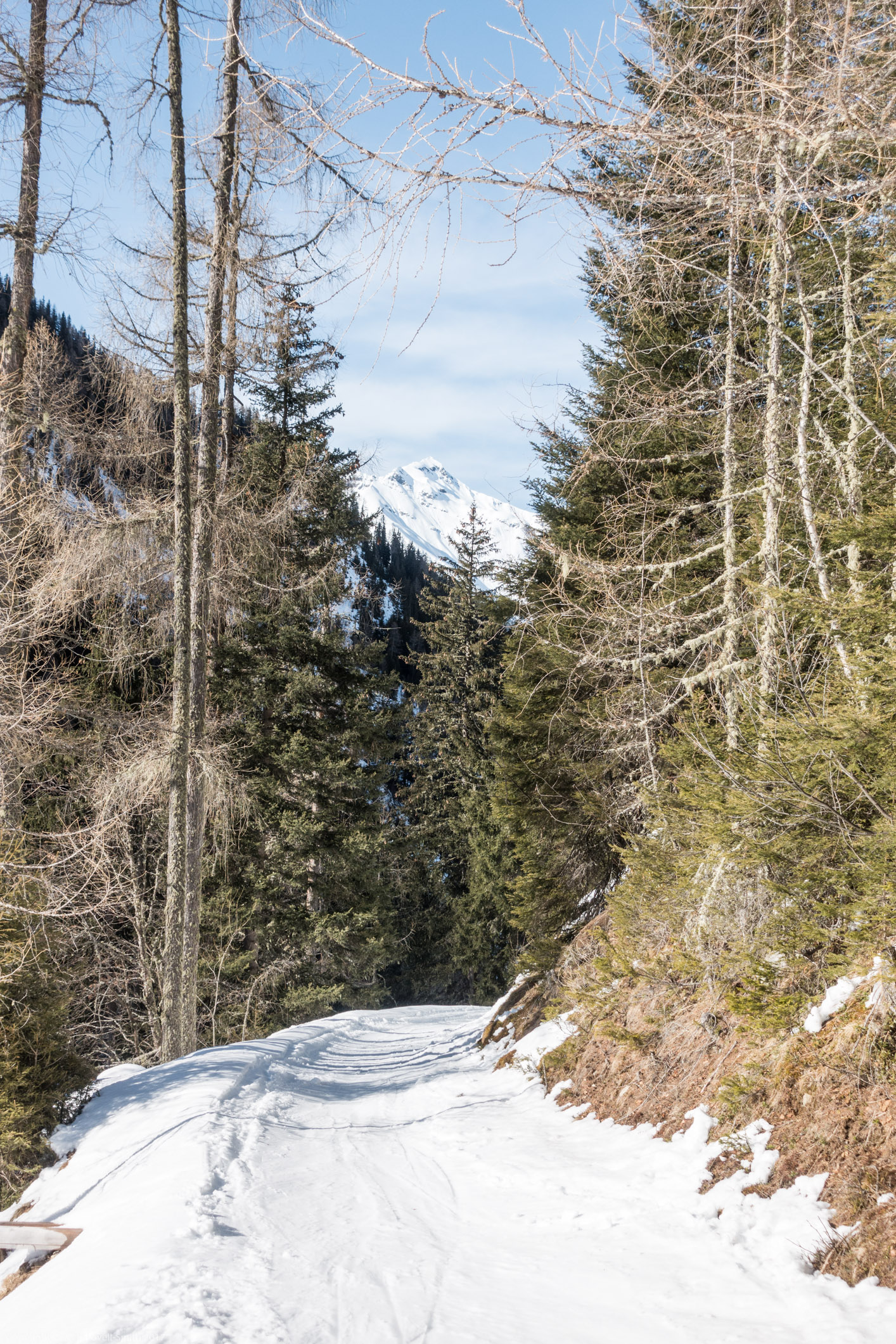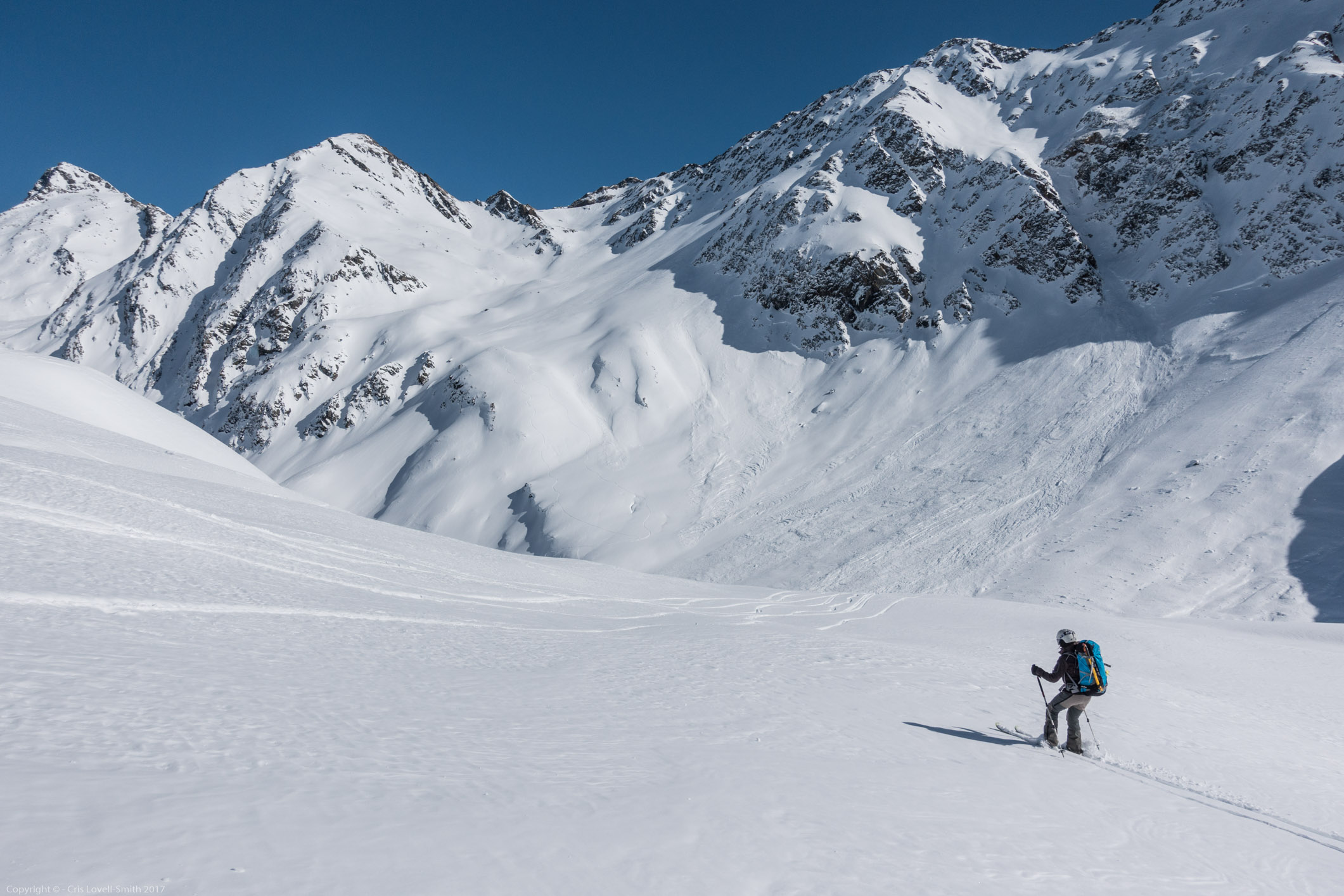 We stopped for a break at the Mitterkarspitze before unstrapping our skis, switching our boots to ski mode and heading down to the East by snowy slopes to the Malfonbach. The snow was heavier than I had hoped and a bit difficult at times to turn in. Later I encountered a very small 20 m patch of delicious powder before we descended enough to have spring conditions. We skied all the way out the Malfonbach down to Pettneu. The last part of the 1500 vertical metre descent was down a very narrow ski track on which we could do nothing but snow plough.