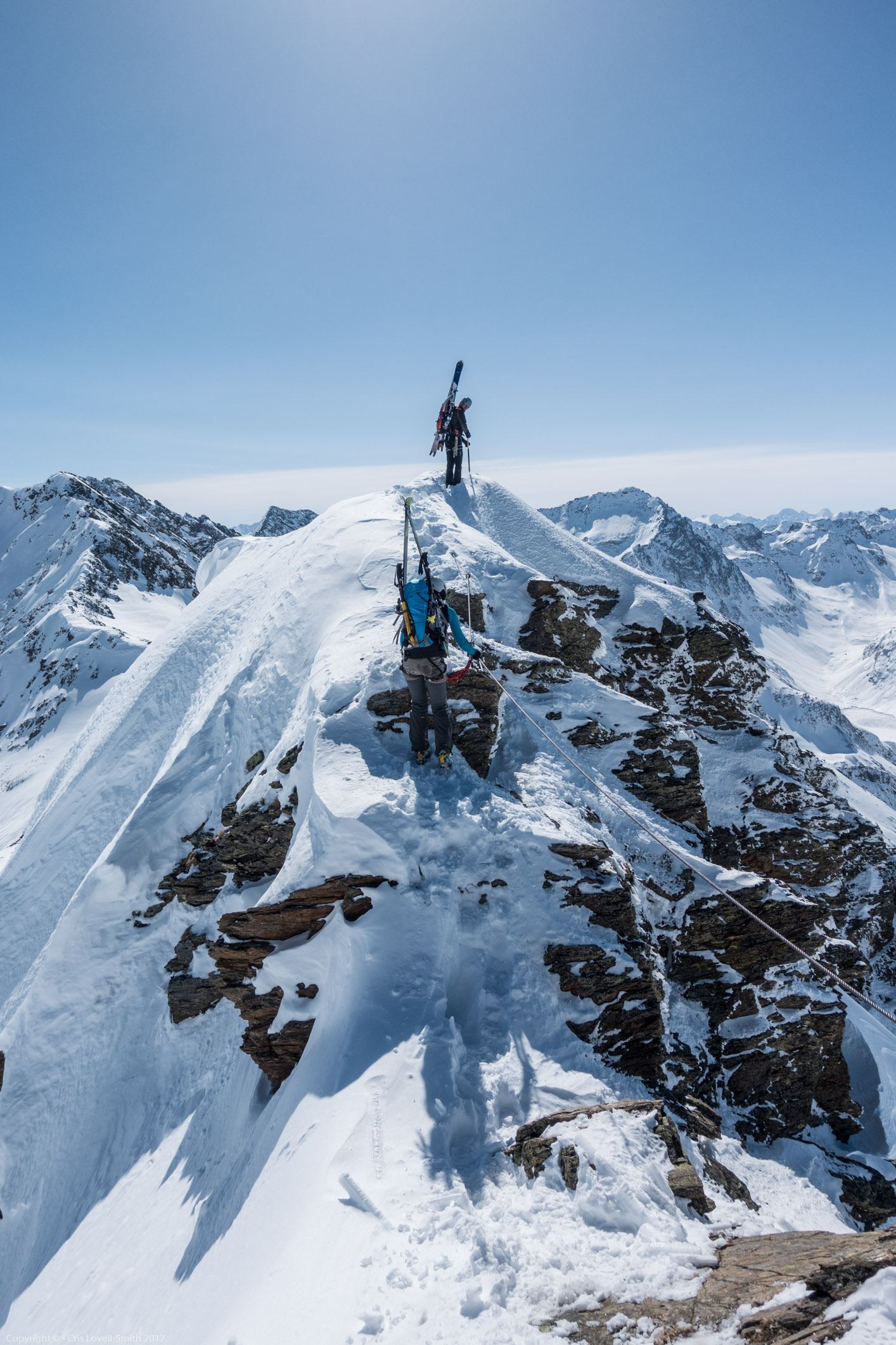 Above left: We set off from the top of the Riffelbahn II after taking a collection of lifts up to 2650 m. It was warm, there wasn’t any wind and it was sunny and blue. Perfect. Above middle: Ascending to the Vordere-Rendlspitze. Above right: It was scrambly in parts.