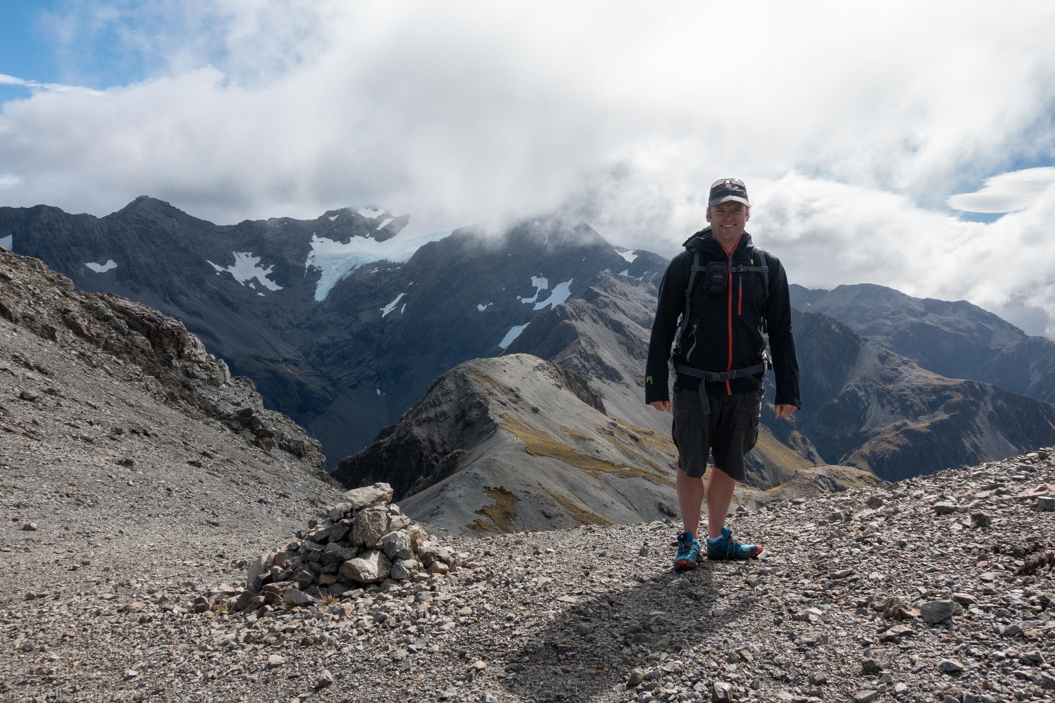 We started walking up the avalanche peak track. Katie told us to go ahead as she wanted to walk her pace. We walked ahead and took a break at the bush line. It was sunny but fresh but it looked like the weather might pack in later. We kept going. It was warm in the sun but then the cloud rolled in as we reached the last climb to the summit ridge. The cloud vanished again as we reached the ridge and we had great views and almost no wind at the top.