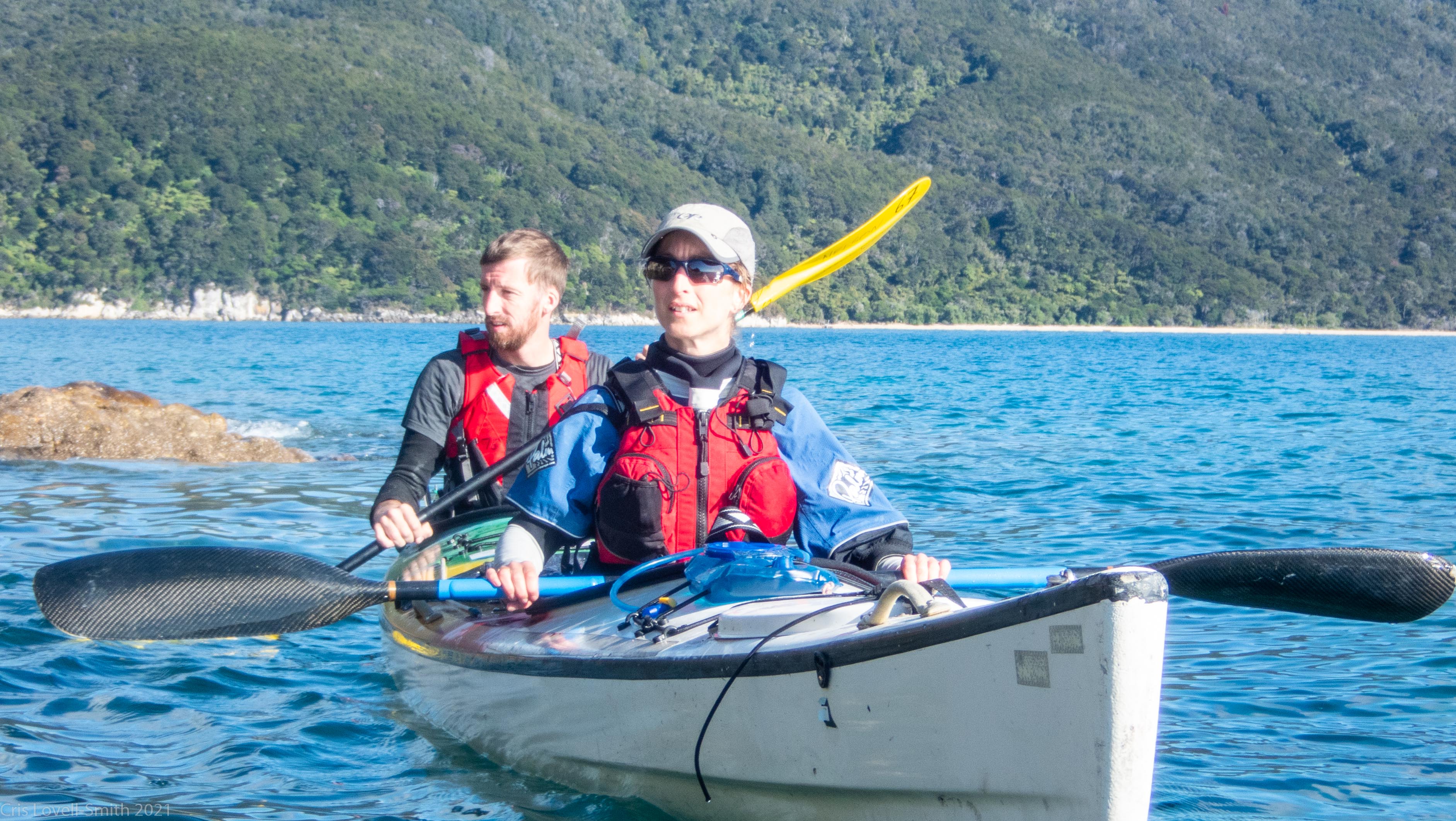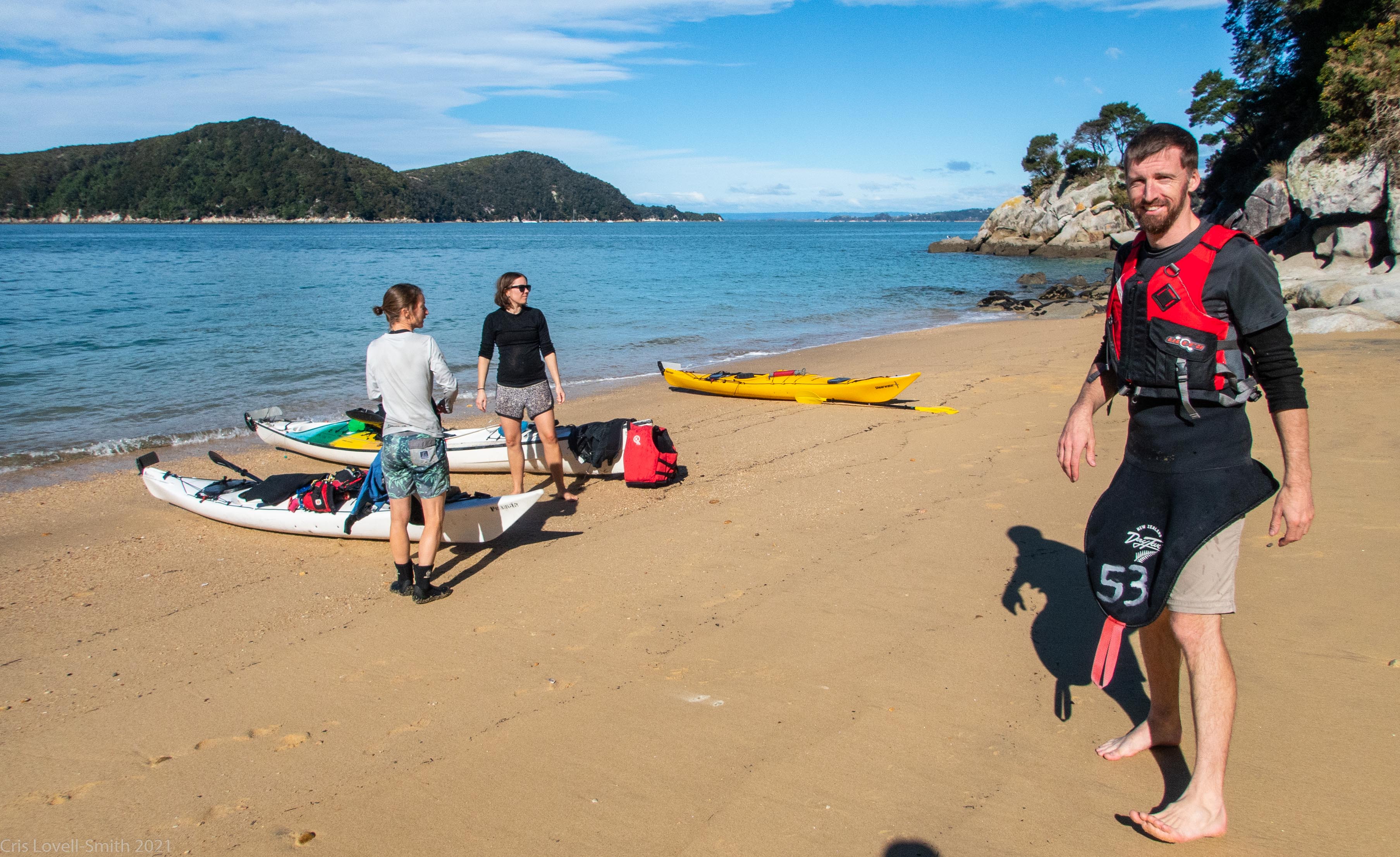 We left early-ish in great weather from Marahau after packing more than enough food and random stuff into the kayaks. We had the huge sea bear, my single sea kayak and another one from the club that I had rented. I kayaked with Annu in the sea bear and Craig and Ellen tried to keep up in the singles. We stopped at Watering Cove for a snack. Ellen had baked some delicious fruit bread yesterday and it was just what we needed. We swapped boats. It was all sunshine and lollipops. Continuing we kayaked around the coast and up to Mosquito Bay where we came ashore and set up our camp. We’d thrown out Craig’s tent at the last minute as I’d not been sure we’d had enough space. Amusingly we’d had a communication breakdown and Ellen had brought both her tents meaning we still had one each. Oh the luxury.