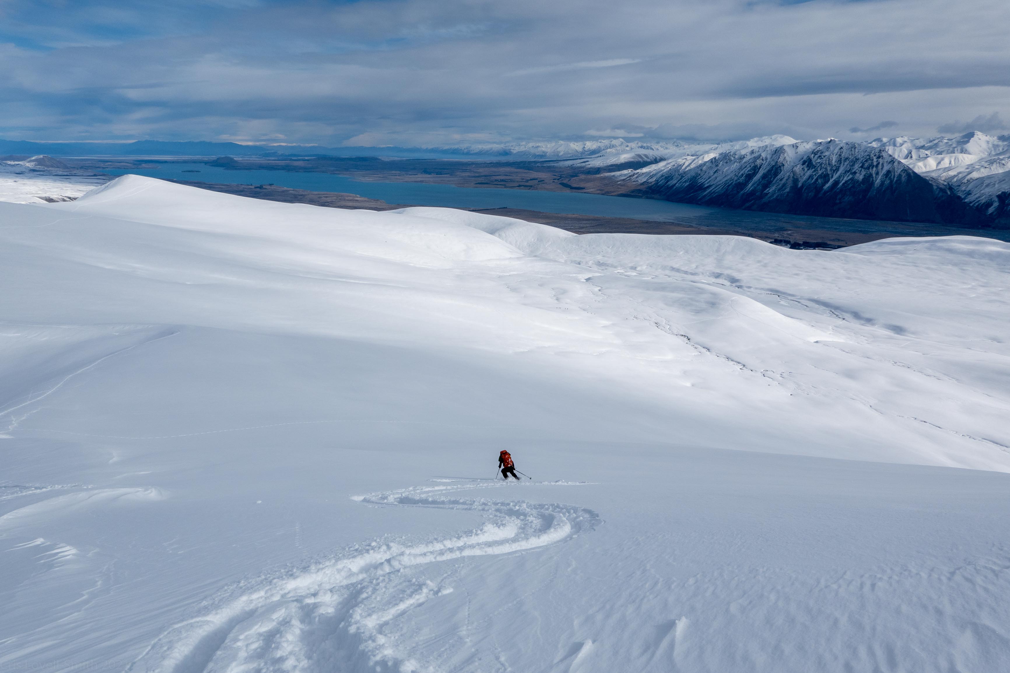 Finally we got high enough that we only had delicious snow. And what a lot of snow. There was ooodles of new powder. My skis kept getting lost under the white and it was an effort to create a skin track. We reached the saddle that we were aiming for as the sun was setting. There was a nice but cold view back across Lake Tekapo.
