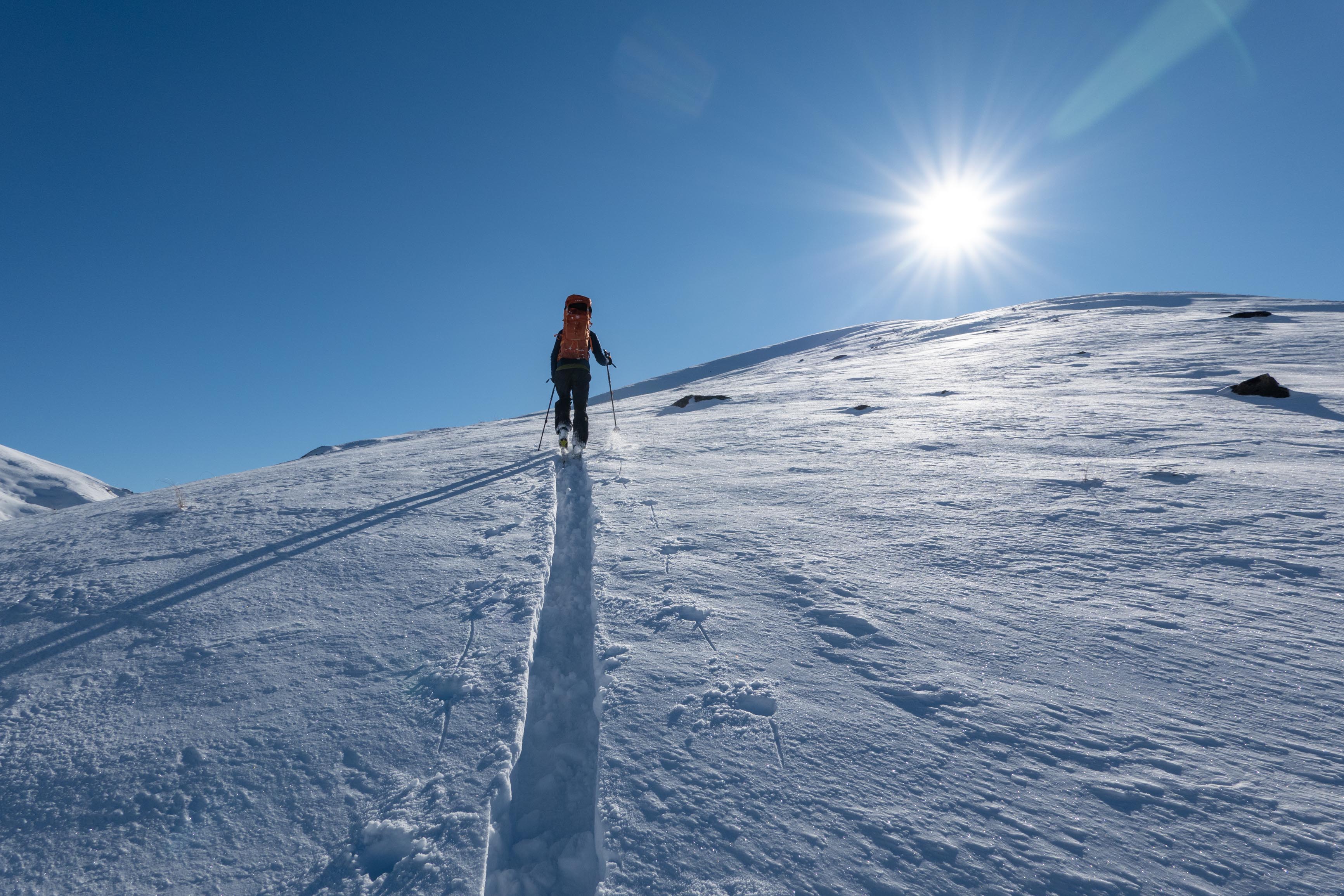 It was sunny and wind-still the following day, perfect for ski touring. We decided to take all of our gear with us rather than leaving it at the hut with the plan to do a day’s touring and then head out to the car. The snow was still good and we trudged back along the path towards the river until we could take a right and head up the ridge further into the mountains. The couple we’d stayed with in the hut were already out and we saw them skiing down towards us in the powder whooping.