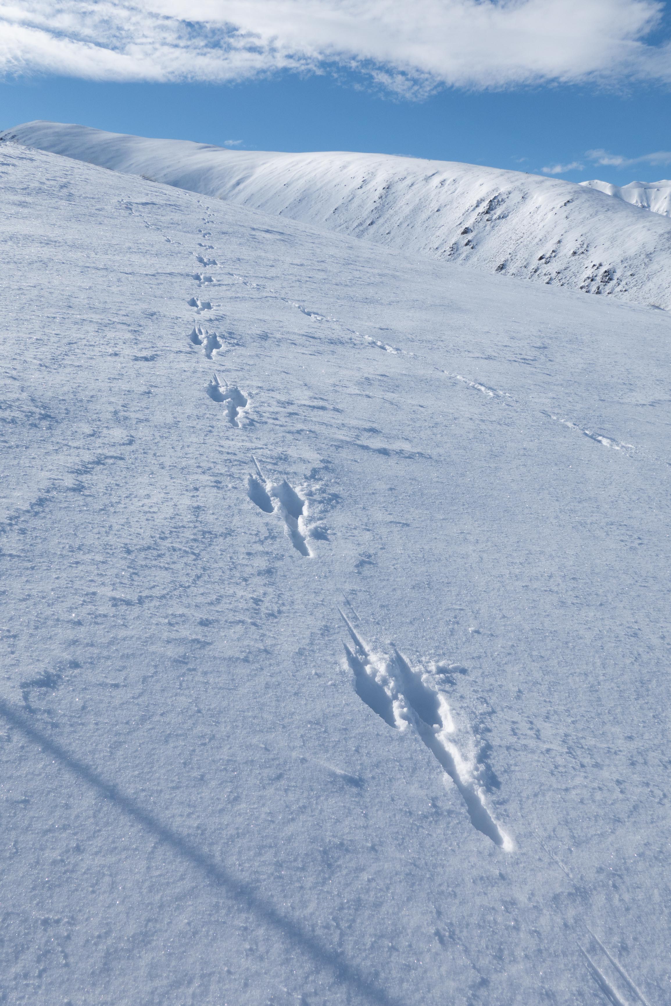 We began skinning up the hill cursing the tussock and matagouri bushes sticking out from under the snow.