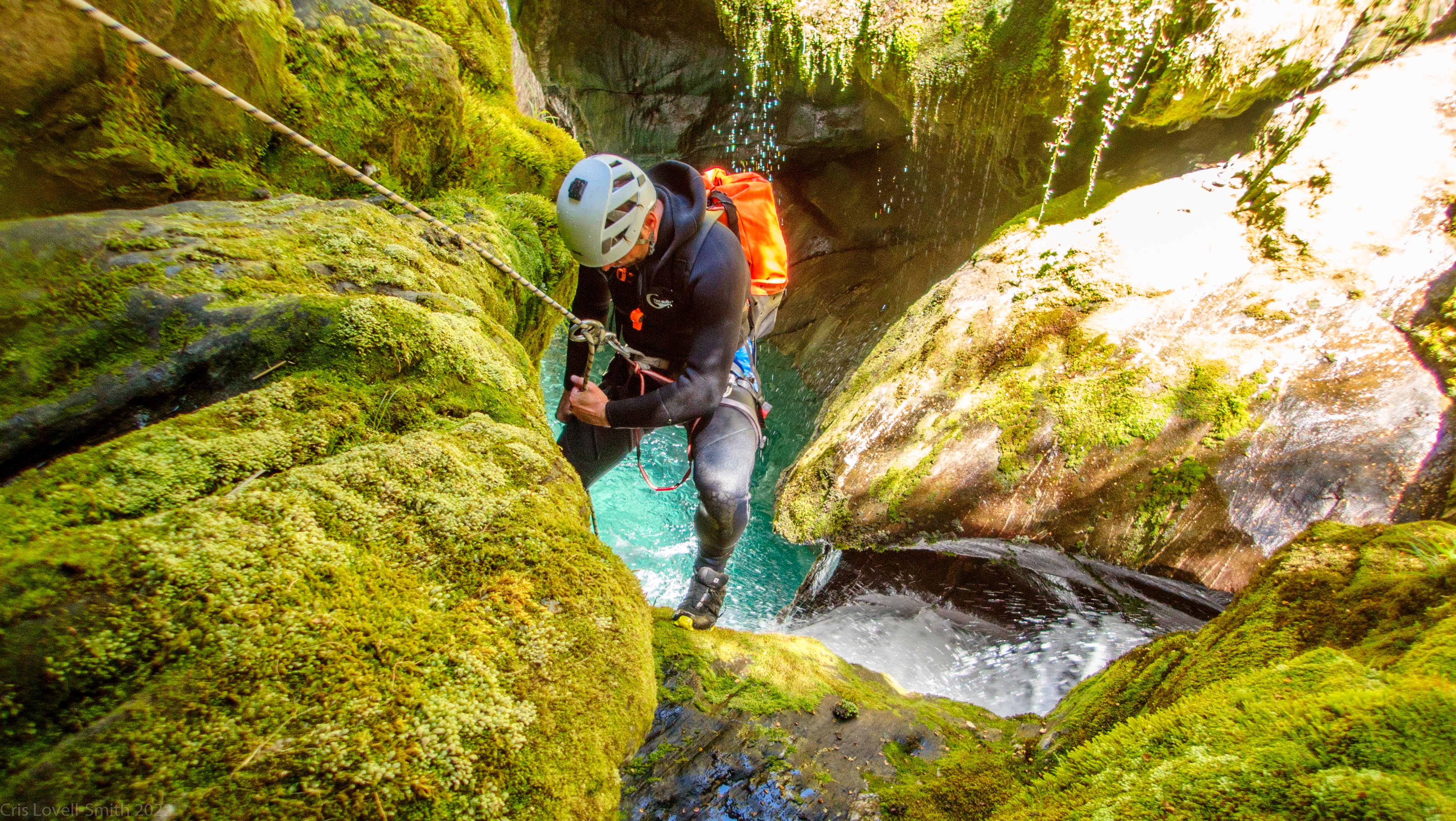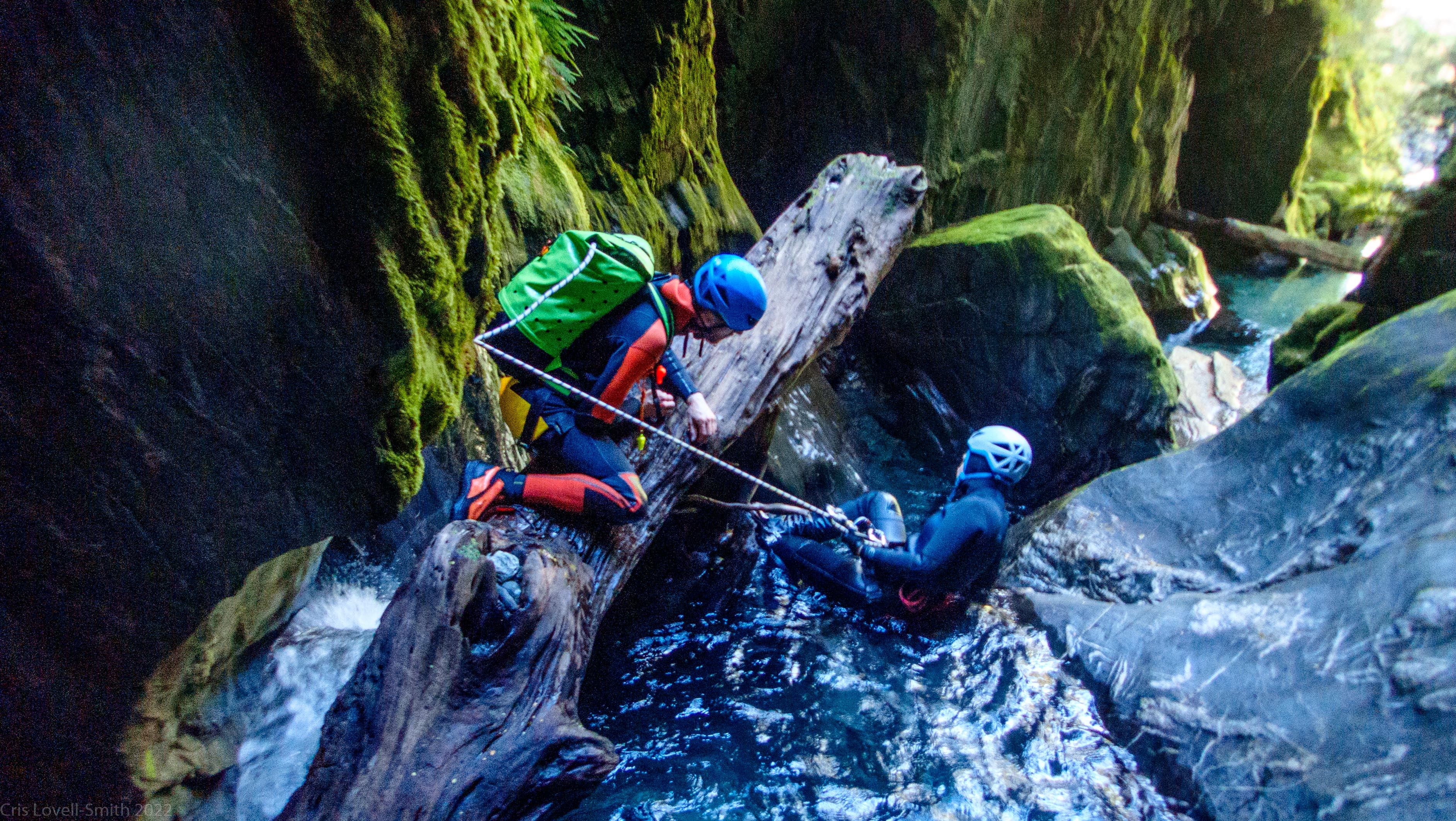 We started with a few small abseils. It’s a very pretty river and the features weren’t too difficult. We descended and the sides became steeper until it was no longer possible to escape. We came to a section where the guide had warned us about an unprotected traverse out to the anchor bolts. Craig went first and I watched as he abseiled, then walked down a narrow slot and climbed over to the bolts. He set up the anchor there and Rachel headed down the rope next. Craig belayed Rachel across to the anchor using my climbing rope that we’d brought with us to use as a puller. I abseiled, pulled down the static rope and then headed over. Craig belayed me across to the anchor and started setting up the next abseil. Everything going to plan.