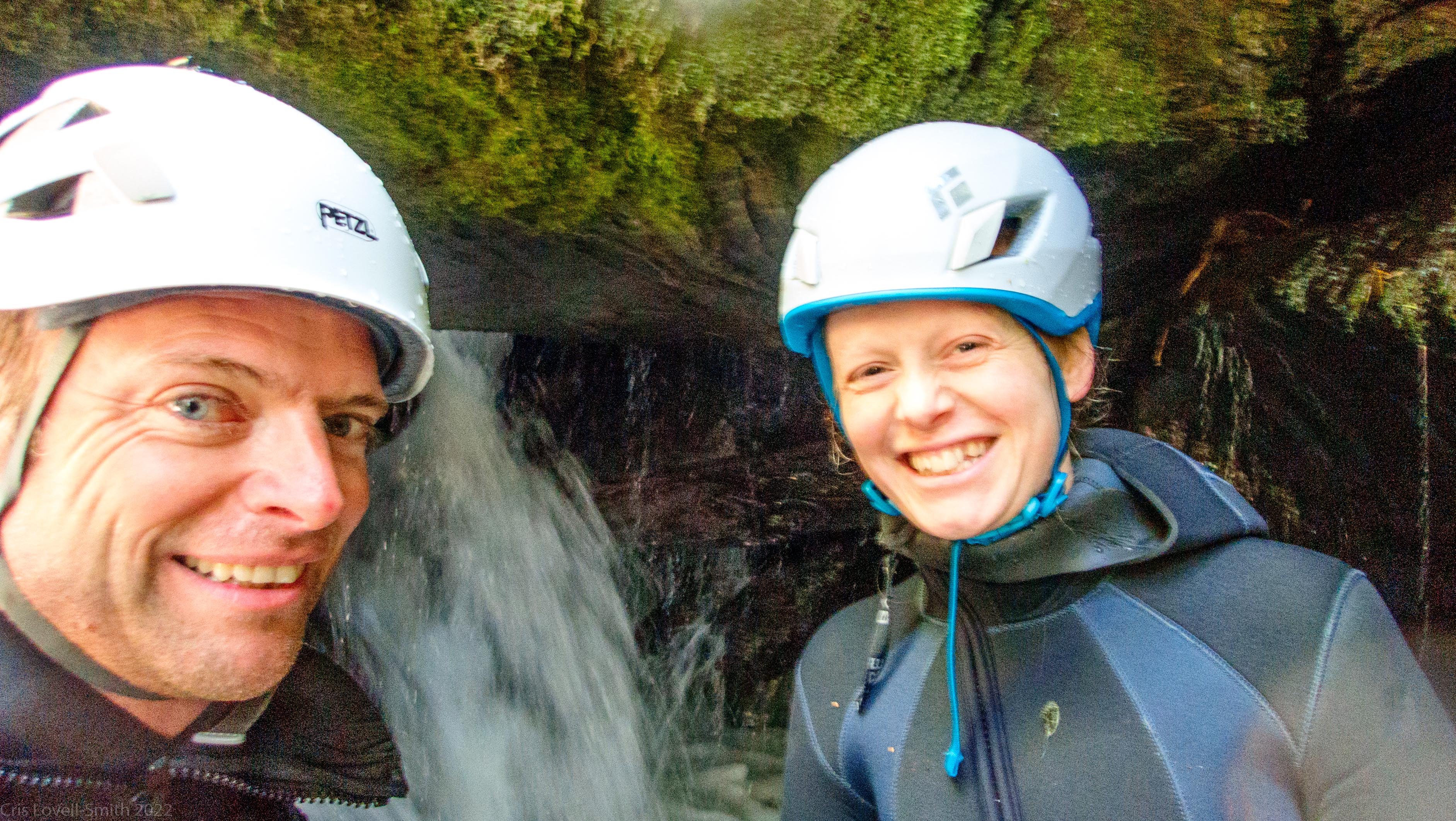 I went first and abseiled into a huge cavern. The water tumbled past me on my right and I got a little caught in the flow for a while. It hit my helmet with some weight but I slid down the rope into the water without a problem. Rachel and Craig did a better job, more or less keeping out of the flow. It was amazing looking back up to the top of the abseil and to the light coming in from the river above. It really was a huge cavern. Once the others were down we took happy snaps and then walked out to the next feature.