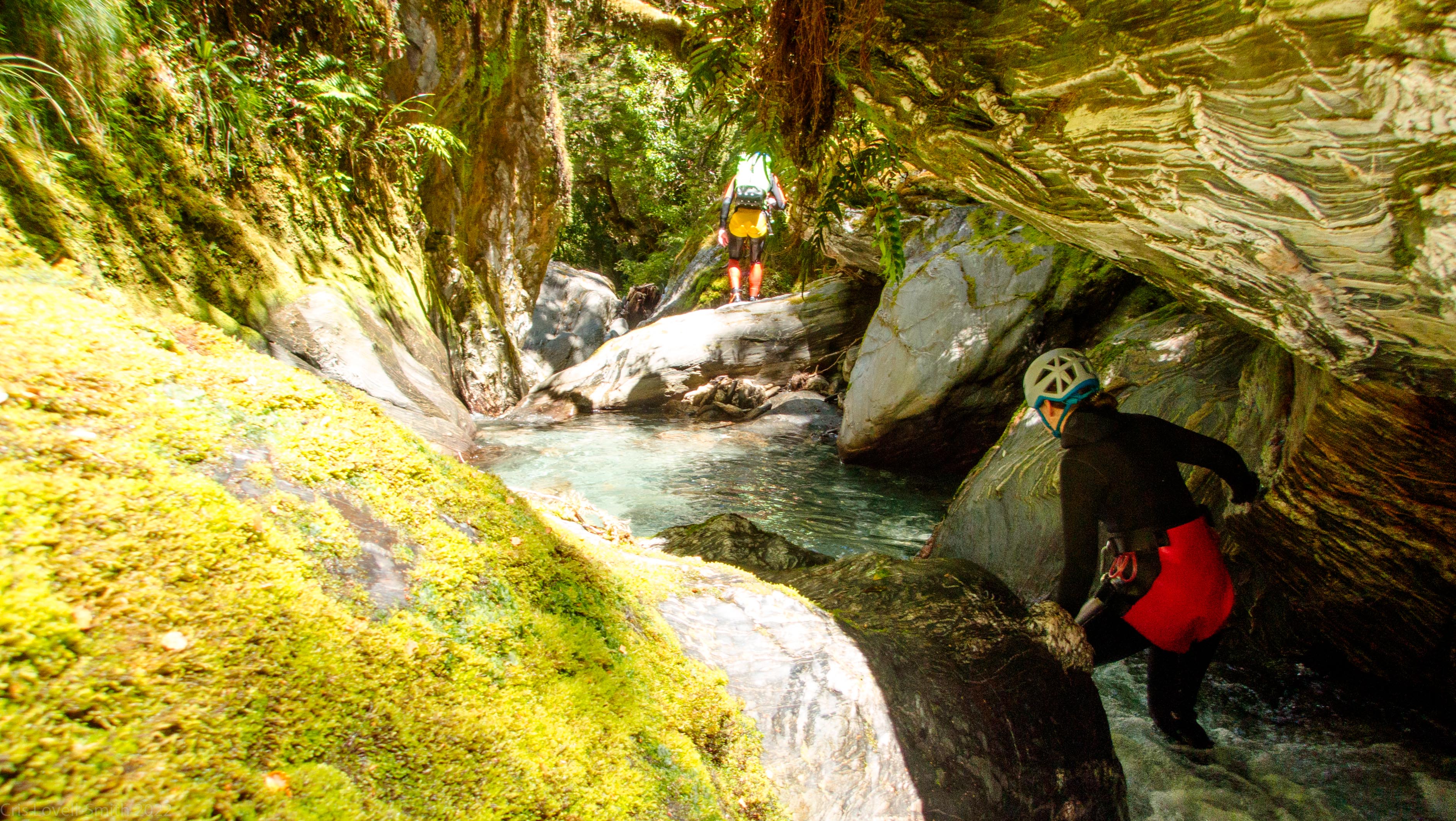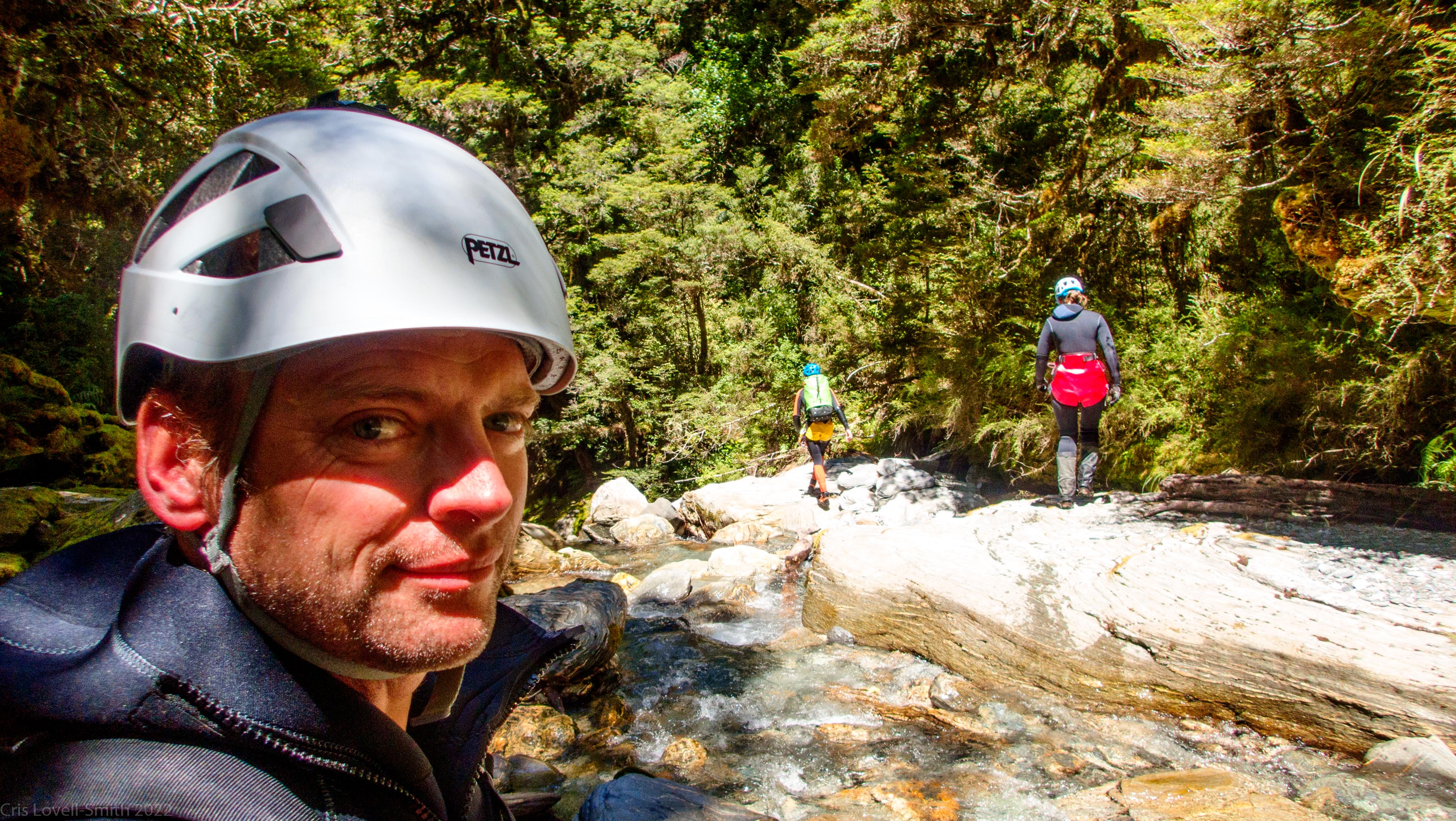 After our French Ridge tramp we drove to the Haast Pass on a very sunny day and went canyoning. Craig had picked Robinson Creek, which he’d done before. We had a bit of a gear faff in the sun at the side of the road and then set off walking up into the forest ascending for 15-20 minutes to the top of the canyon. I had my new 5 mm wetsuit which I was hoping would keep me warmer than I usually am in a canyon. Rachel squeezed into her, somewhat too small, Trademe wetsuit. This involved Craig and I lifting her up by the waist of the wetsuit and trying to shake her down into the suit.