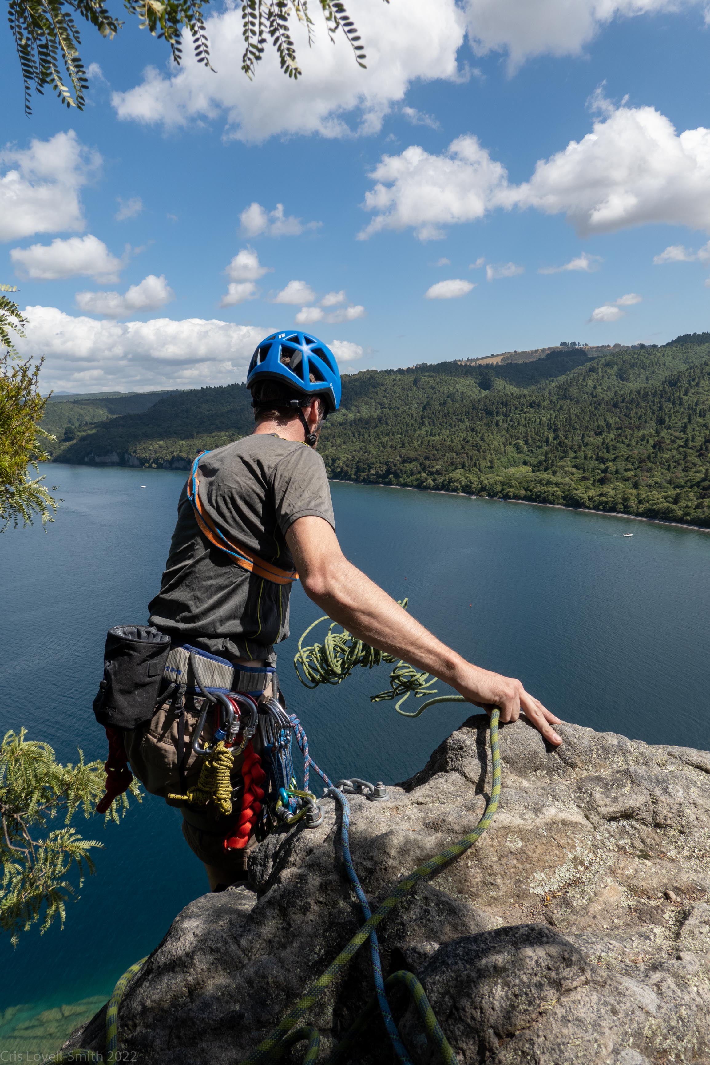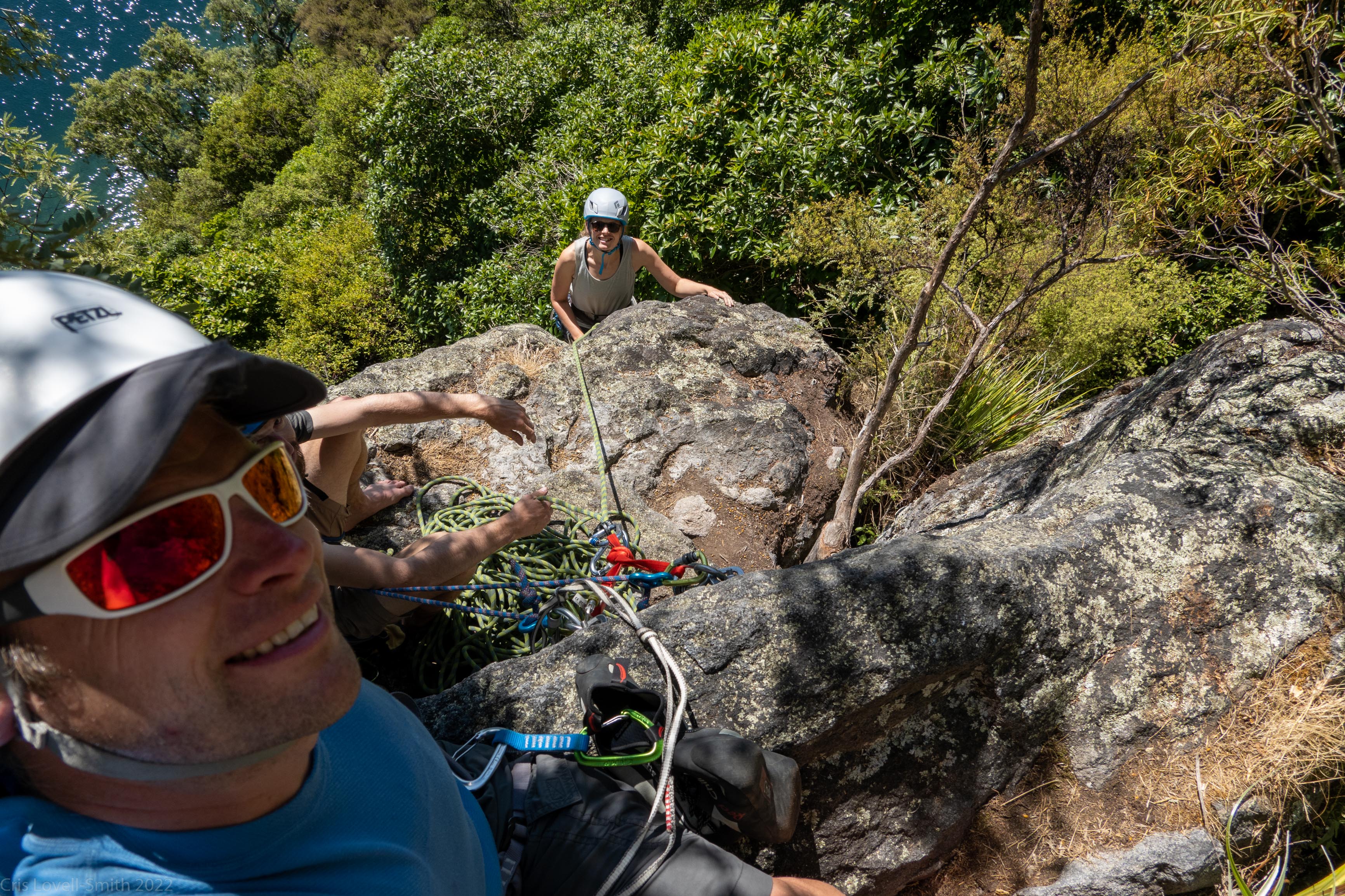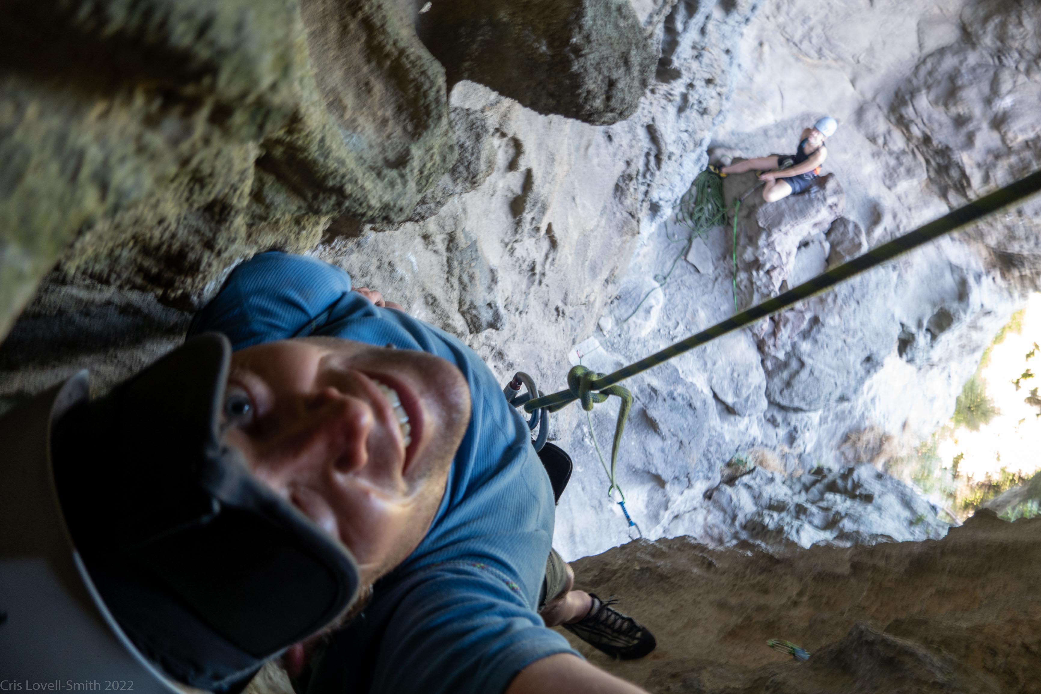 The following day we started early beginning with Captain Caveman, a great three pitch climb with a funky cave a the end of the first pitch. Craig lead all pitches (because he’s our rope gun) and we seconded. The second pitch ascended through the cave and out a small window in the rock. There were good views back down to the lake below. We waited for Rachel (a common theme in any trip involving Plod) to emerge through the top of the cave. From the anchor at the last pitch we abseiled all the way down to the ground on Craig’s 70m rope using a Bina blocker, canyoning style, and pulled the 60 m half rope from the bottom to retrieve both ropes.