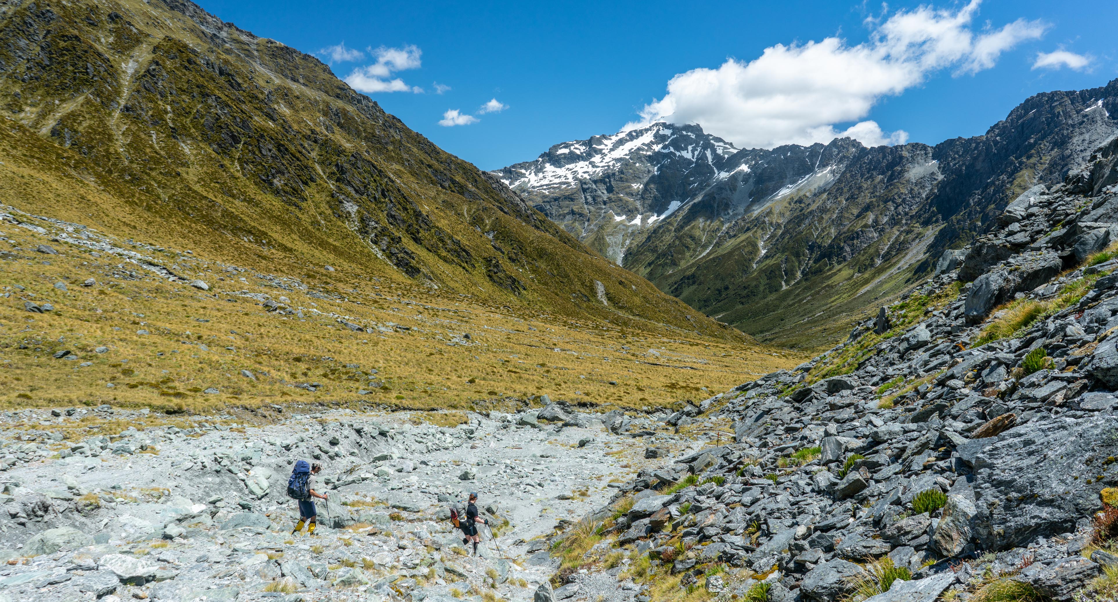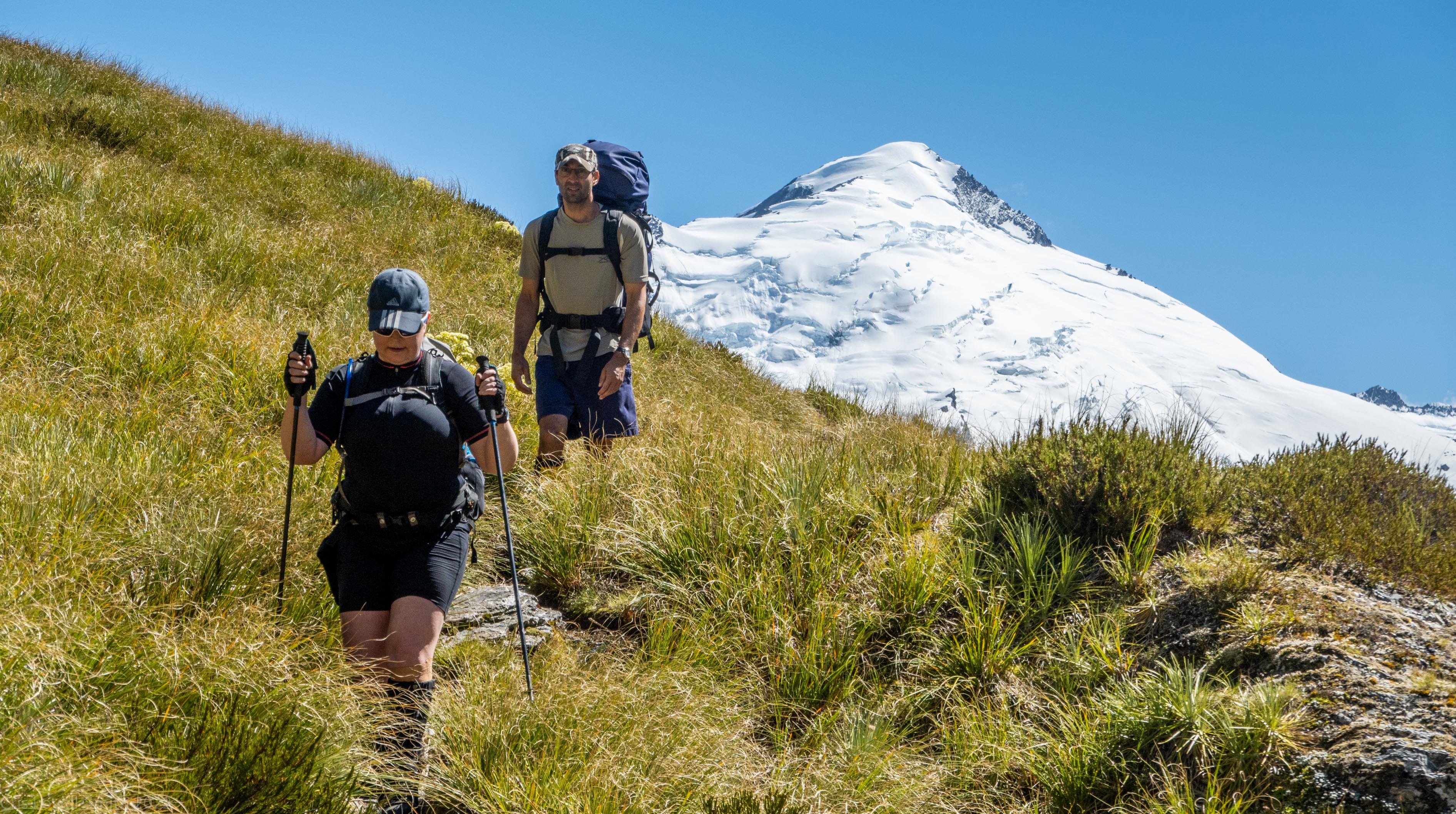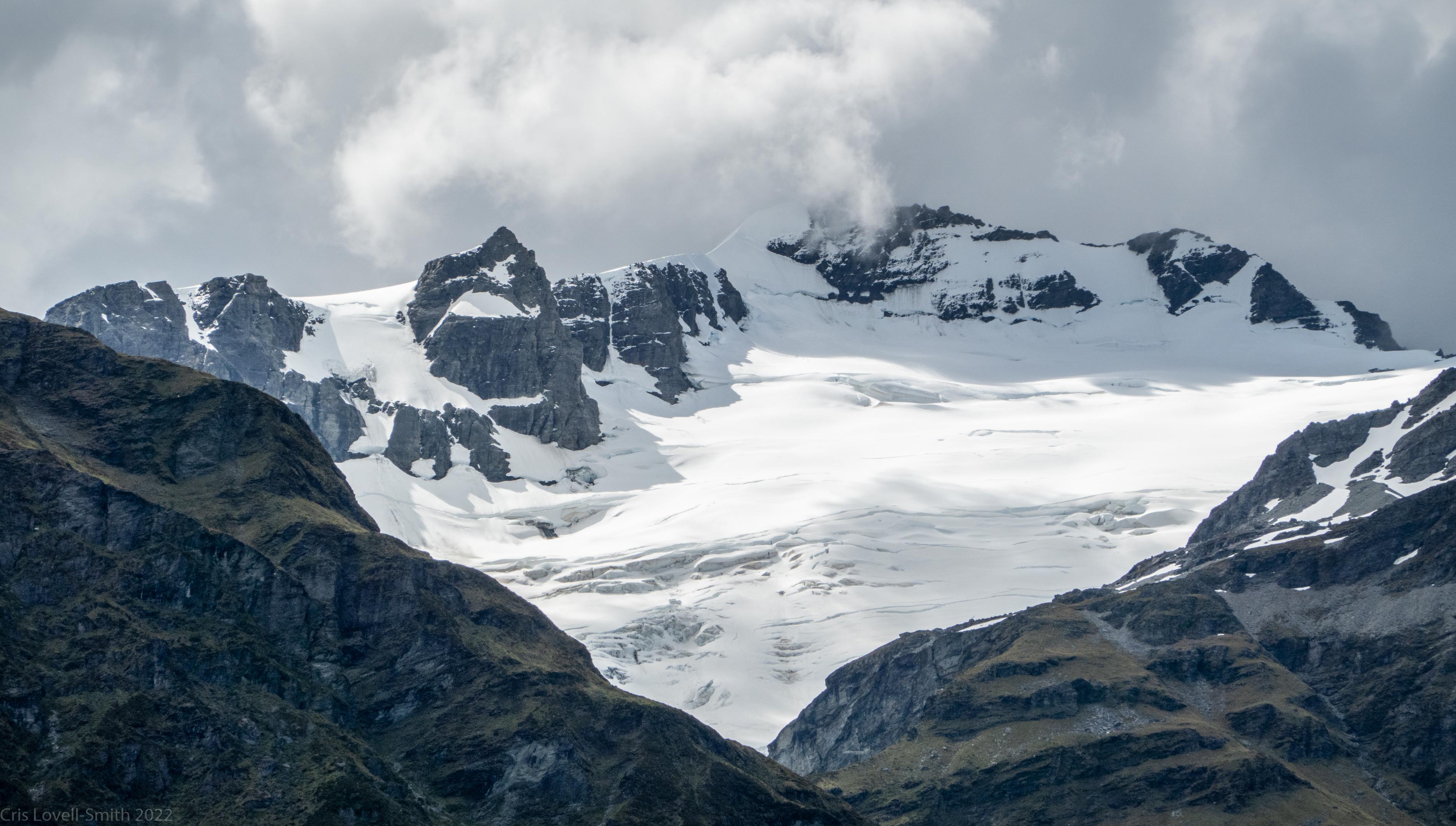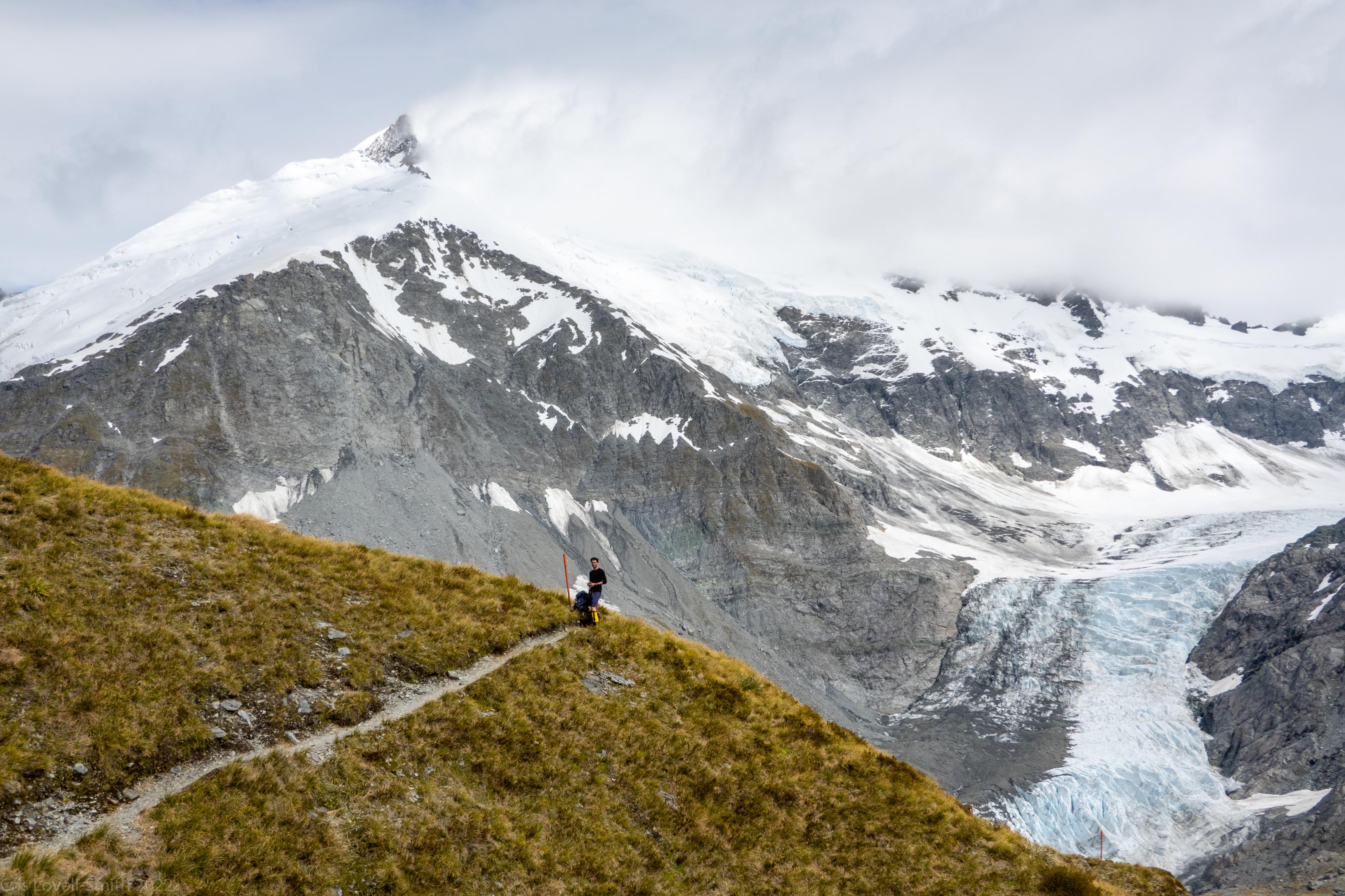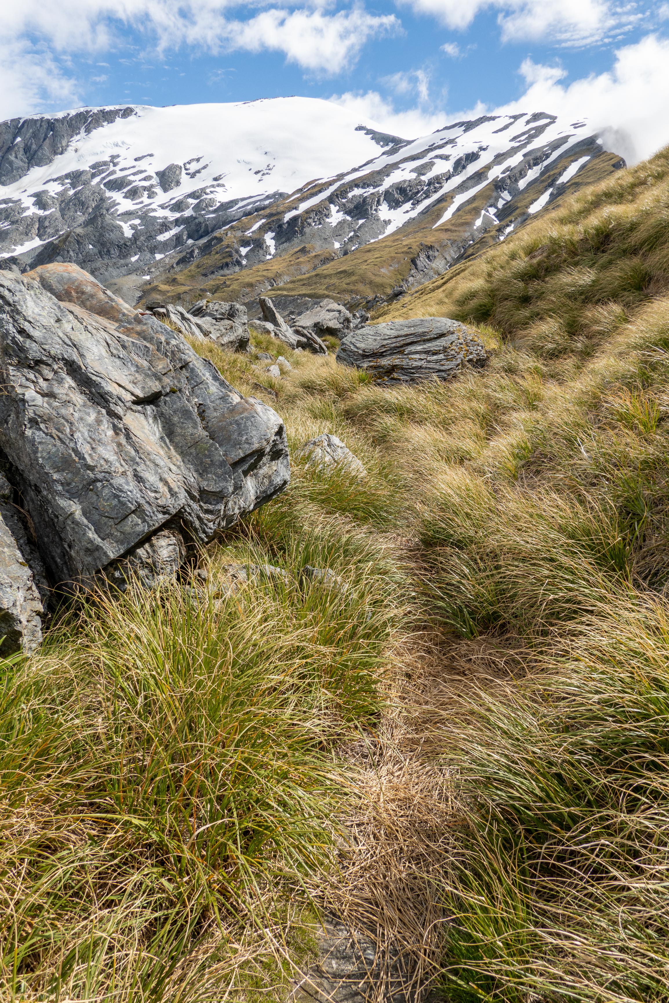 Once the climb started properly, we ascended quickly with our light day packs. There were some scrambly bits and a section where the orange poles vanished entirely but there were plenty of cairns to stay on course. The weather which had been a sulky grey was improving and the sun shone down on the much cleaner upper sections of the Dart Glacier, which looked great across the valley. The track continued up through the tussock and grass and we arrived at the saddle.