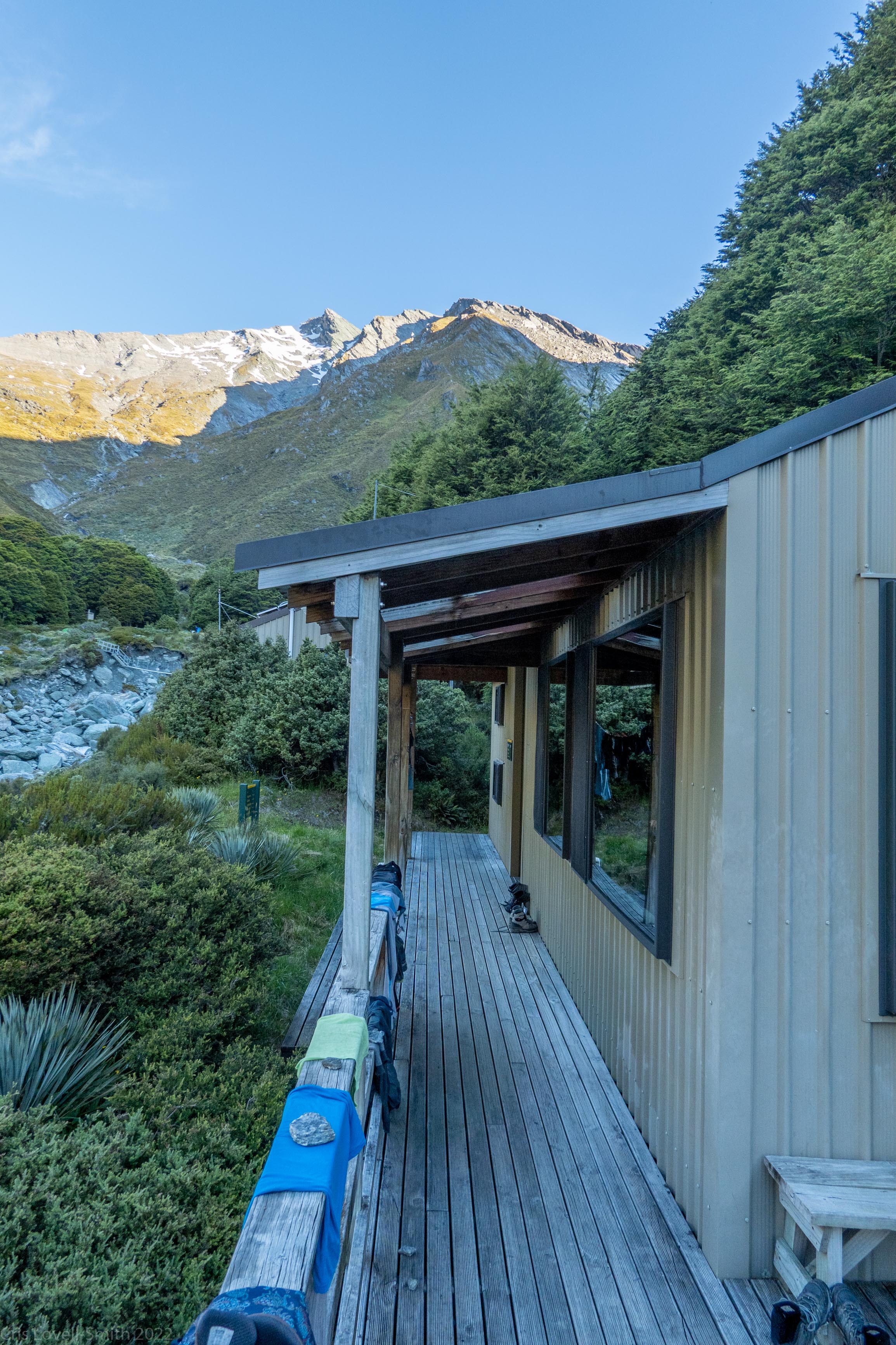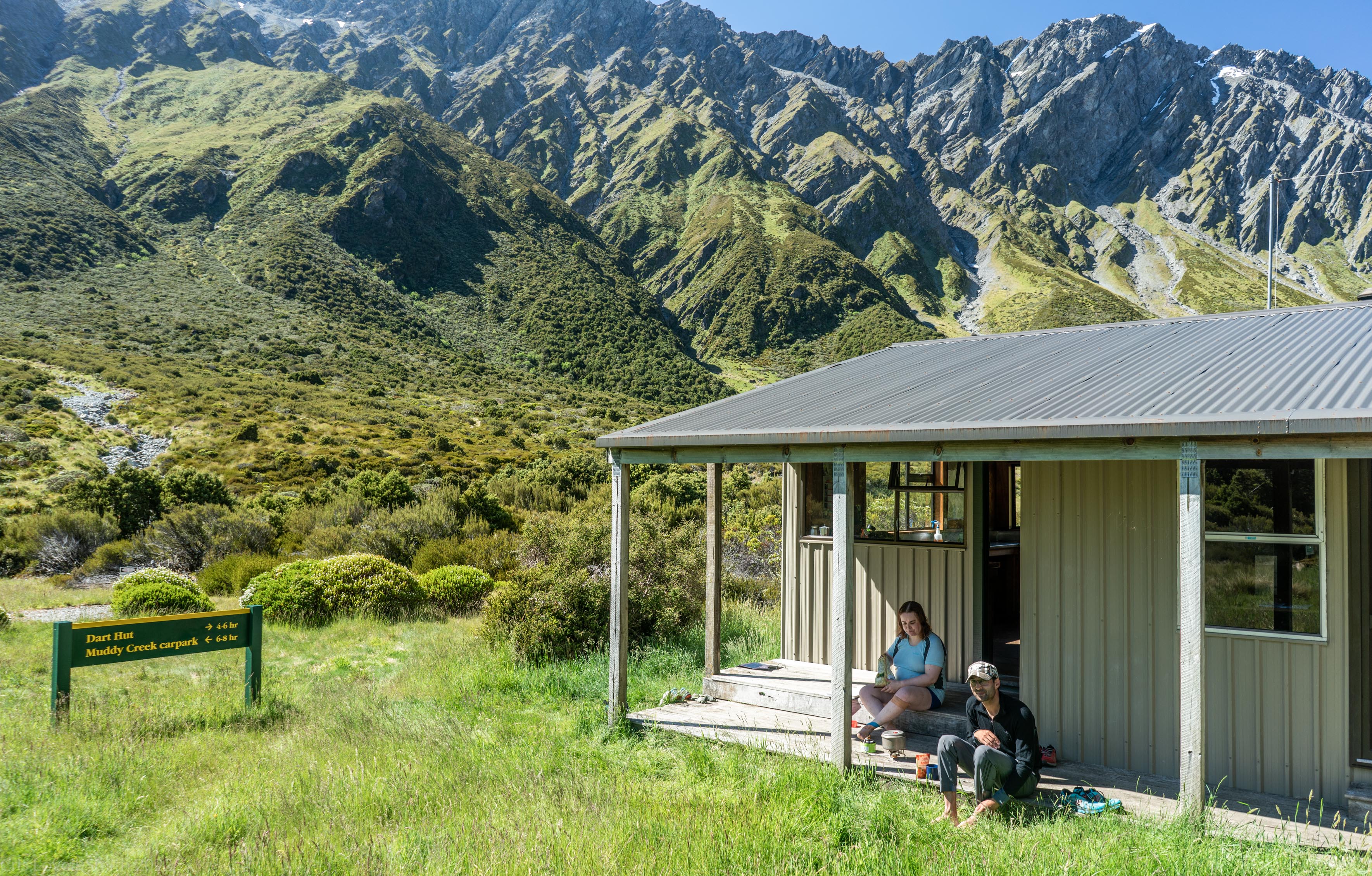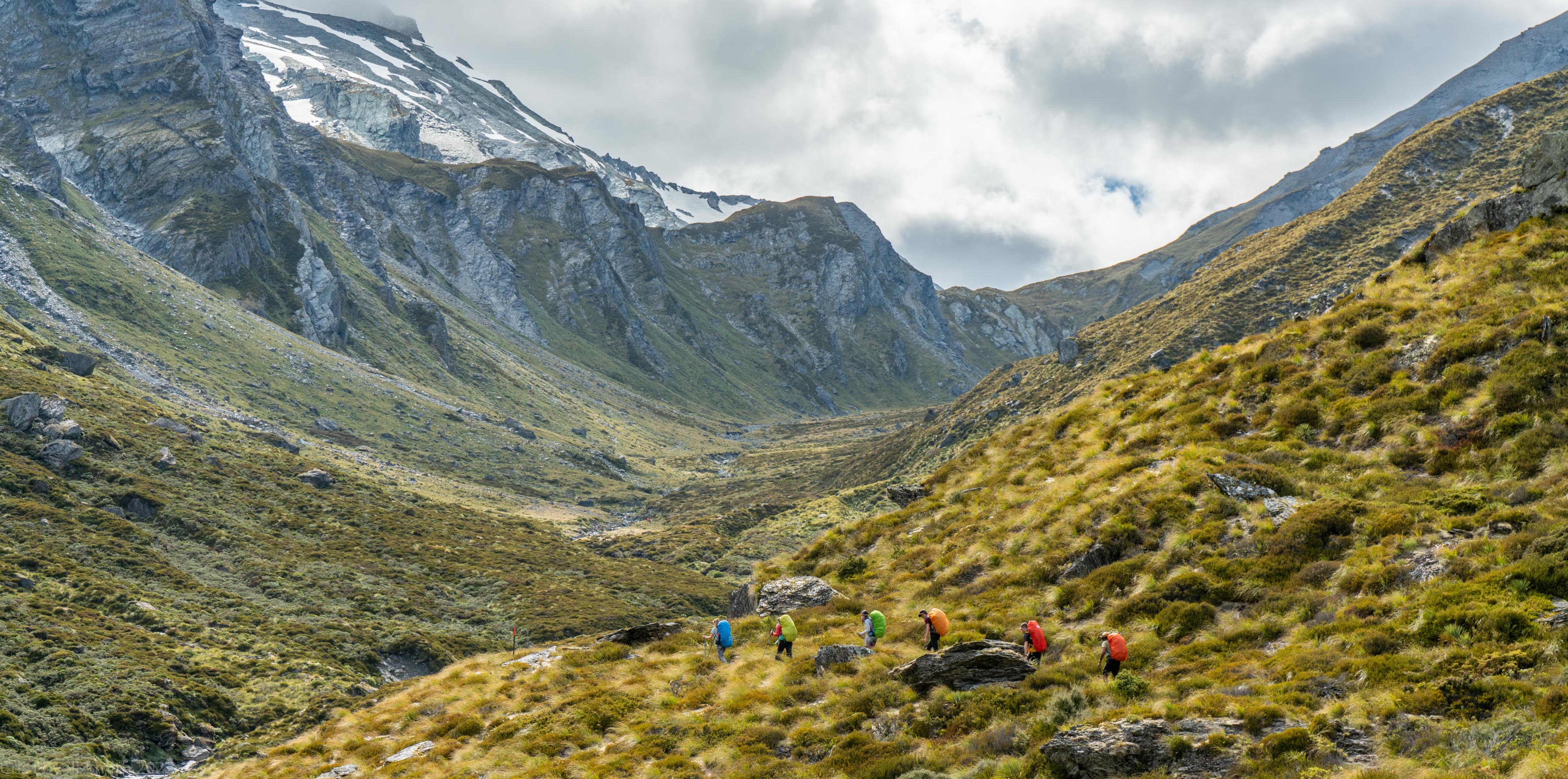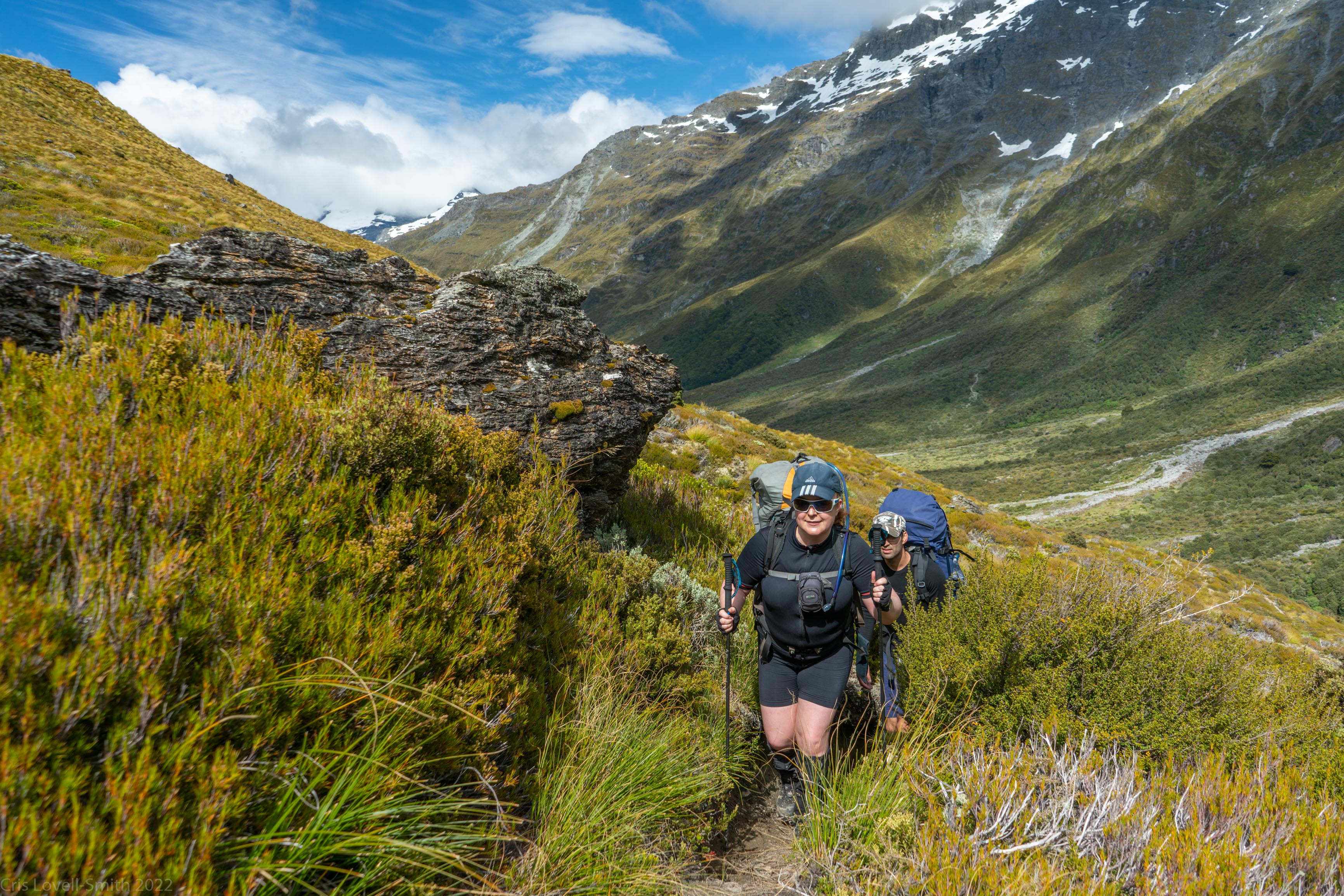 We left Shelter Rock Hut and walked up the valley playing leap frog with a group of six on the way. They had a multitude of colourful packs that looked nice amongst the scrub. We ascended to Rees Saddle and then followed the river down on the other side all the way down to Dart Hut.