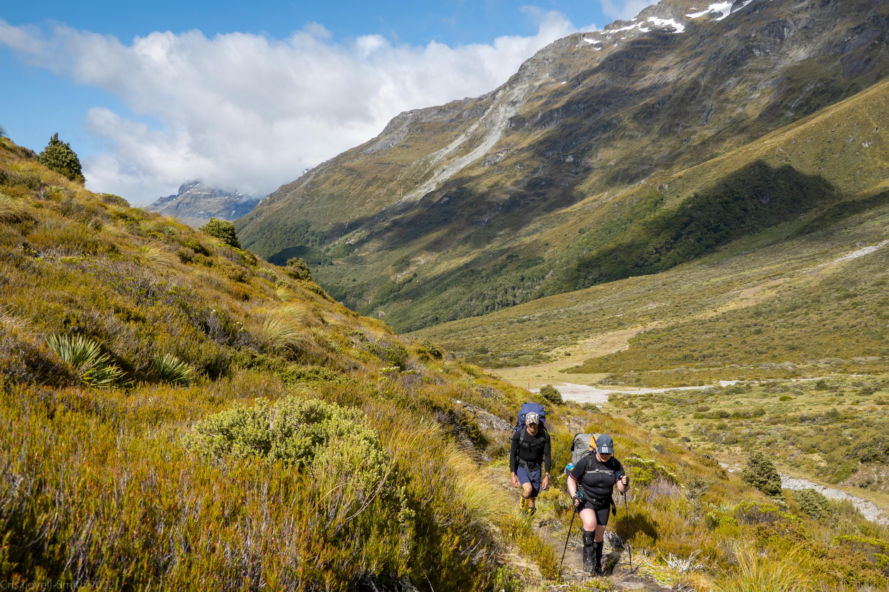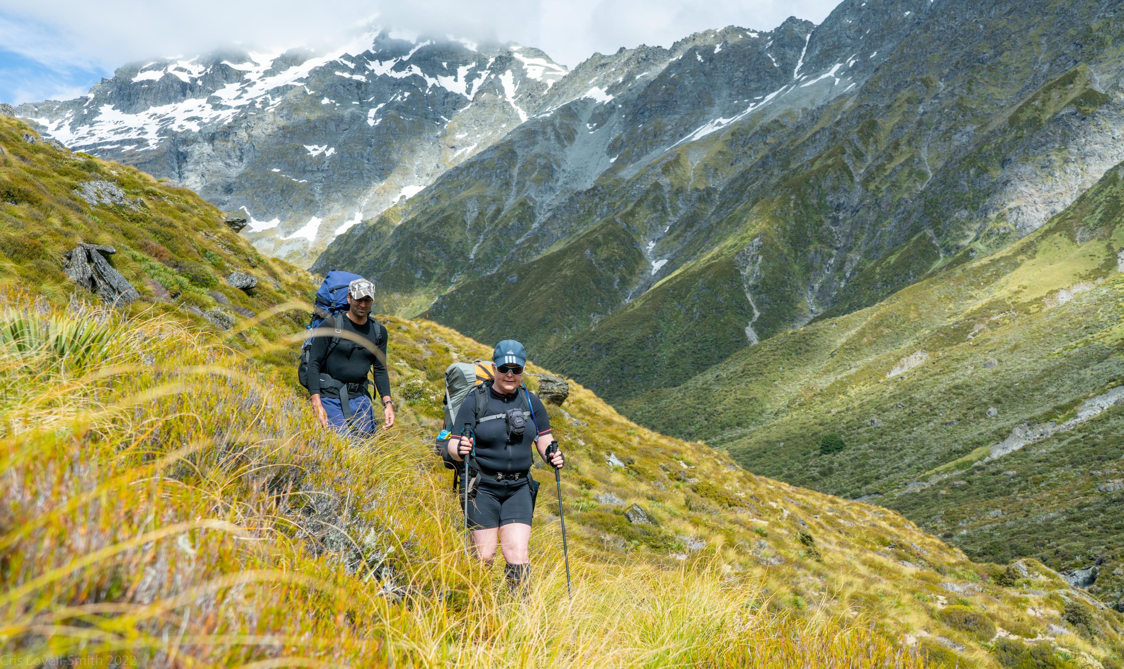 We had a very not-alpine start, leaving the muddy creek car park in the Rees valley at 12:30pm. Our packs were fairly heavy and Katie had all sorts of bits and pieces hanging off her, although not nearly enough to warrant the name Gypsy Wagon.