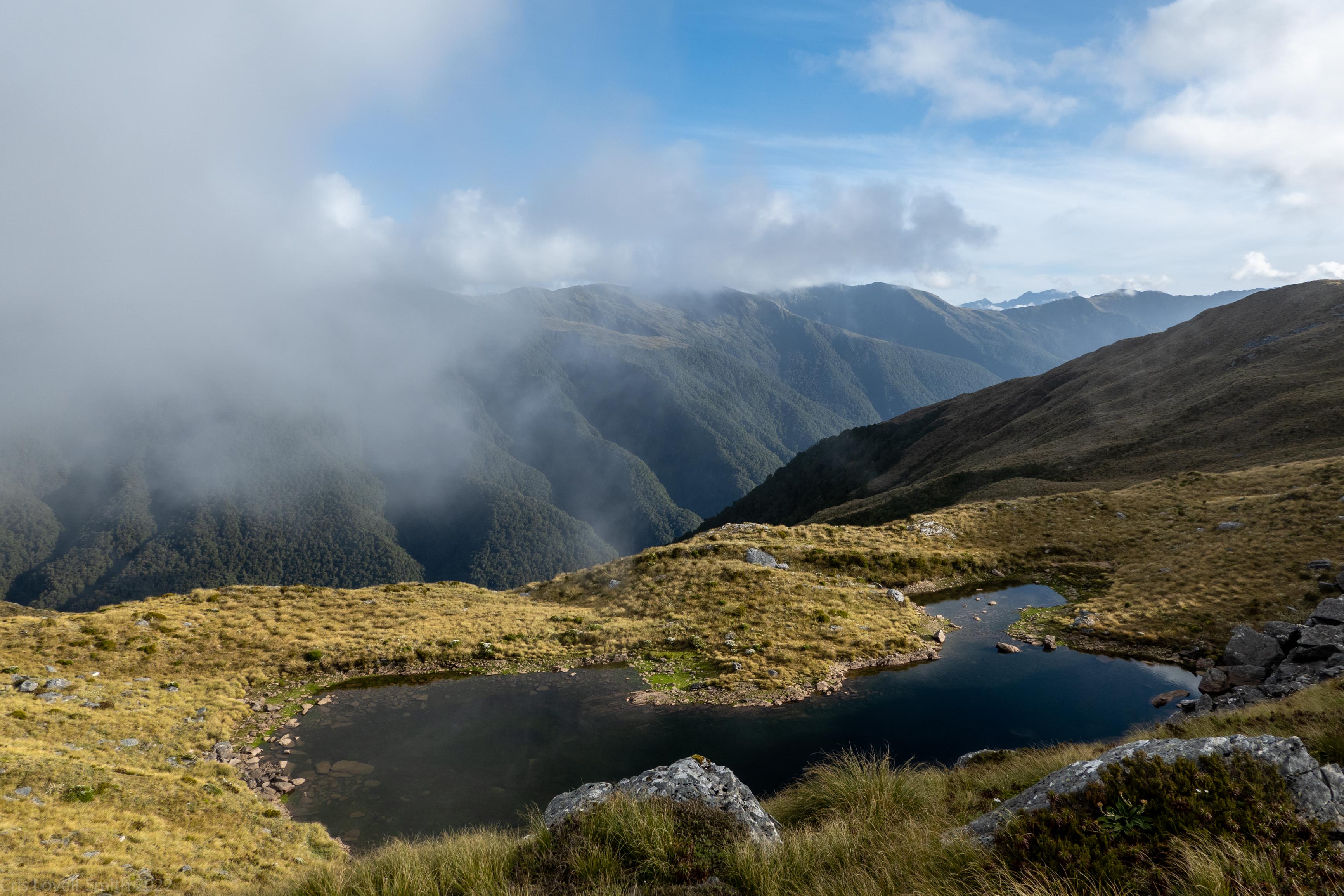 After canyoning in Robinson Creek, we drove North up the West Coast in uncharacteristic sunshine. We stopped at the car park to Blow Fly Hut and after much faffing walked into the hut for lunch. Well kind of lunch. We consumed a tub of yoghurt by the river and then continued walking. We climbed up to the tops which was a bit of a slog. Unfortunately the cloud had come in and pushed the sun away. Along the tops we walked. Sometimes the cloud would clear briefly and we’d get a view out towards the valleys below. We reached the new Mataketake Hut, which is bookable. It was cosy and full of girls so we didn’t stick around (it had also been booked out) preferring just one female and lumpy ground. We continued on towards Dime Lake where we planned to pitch our tents.
