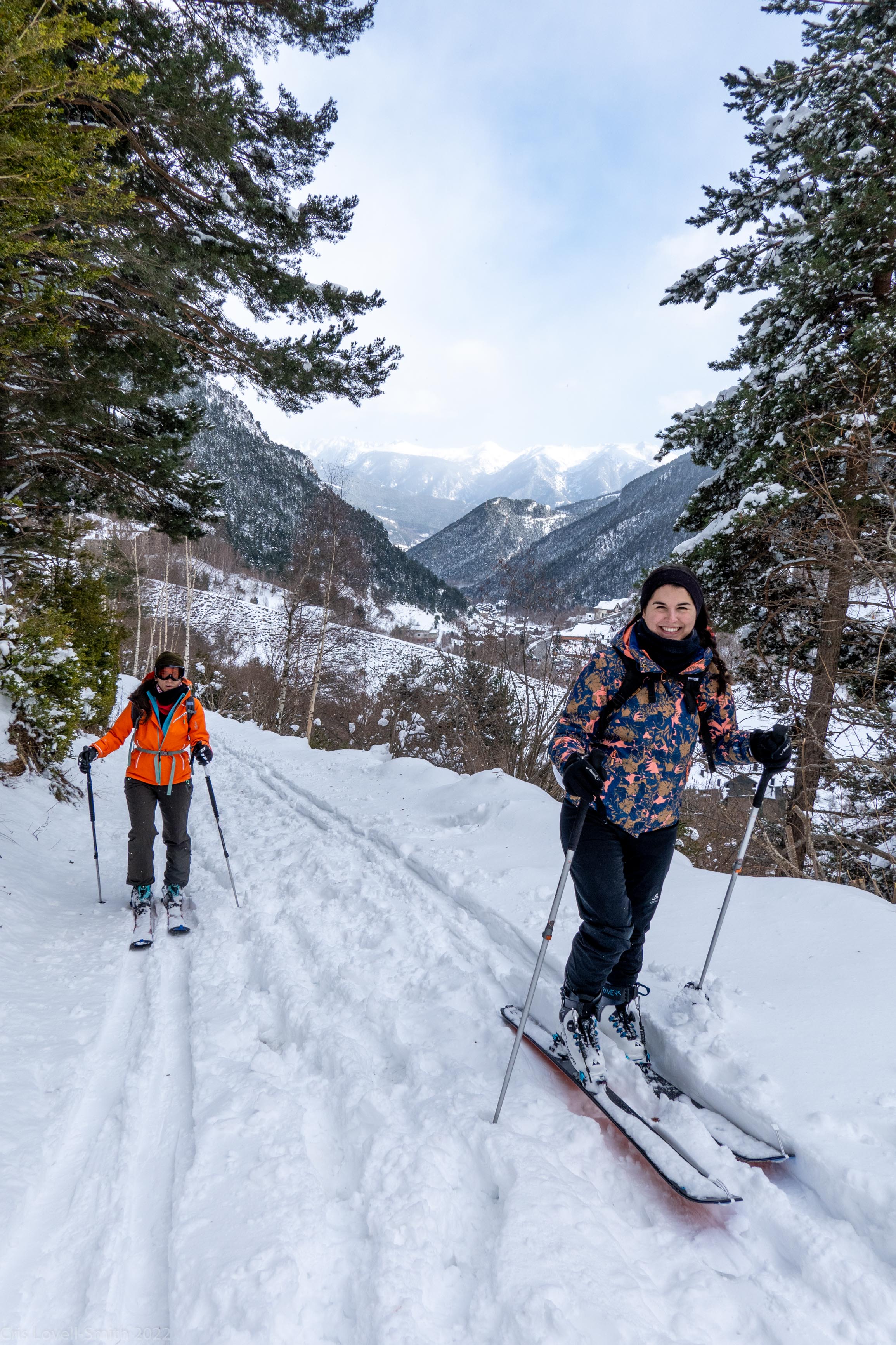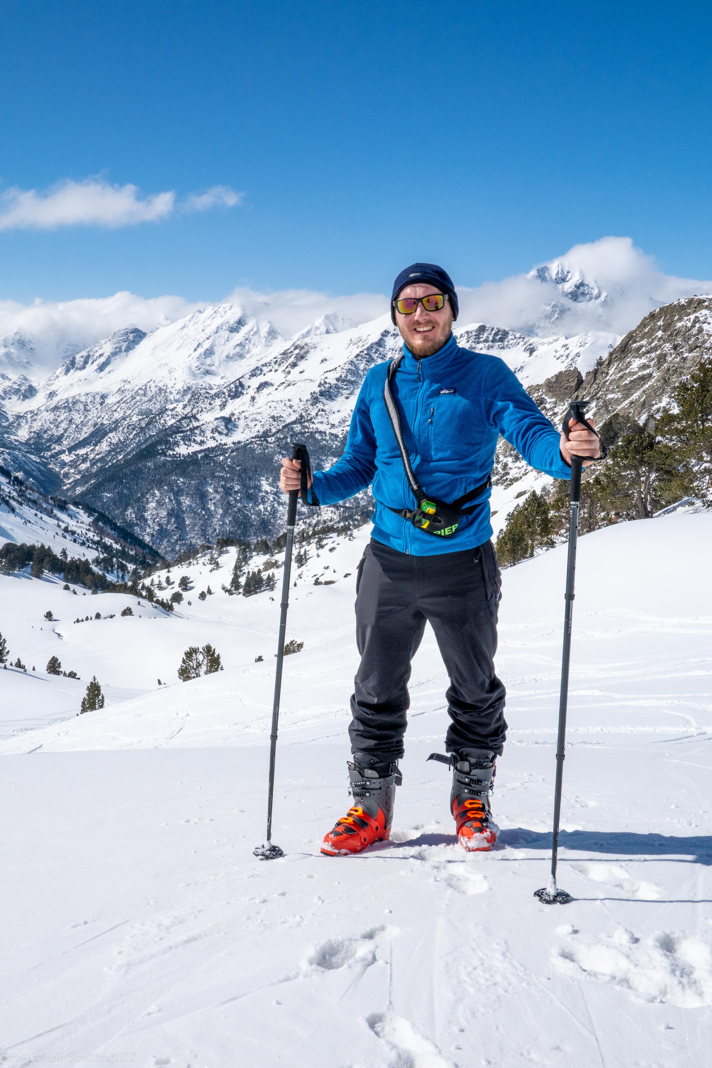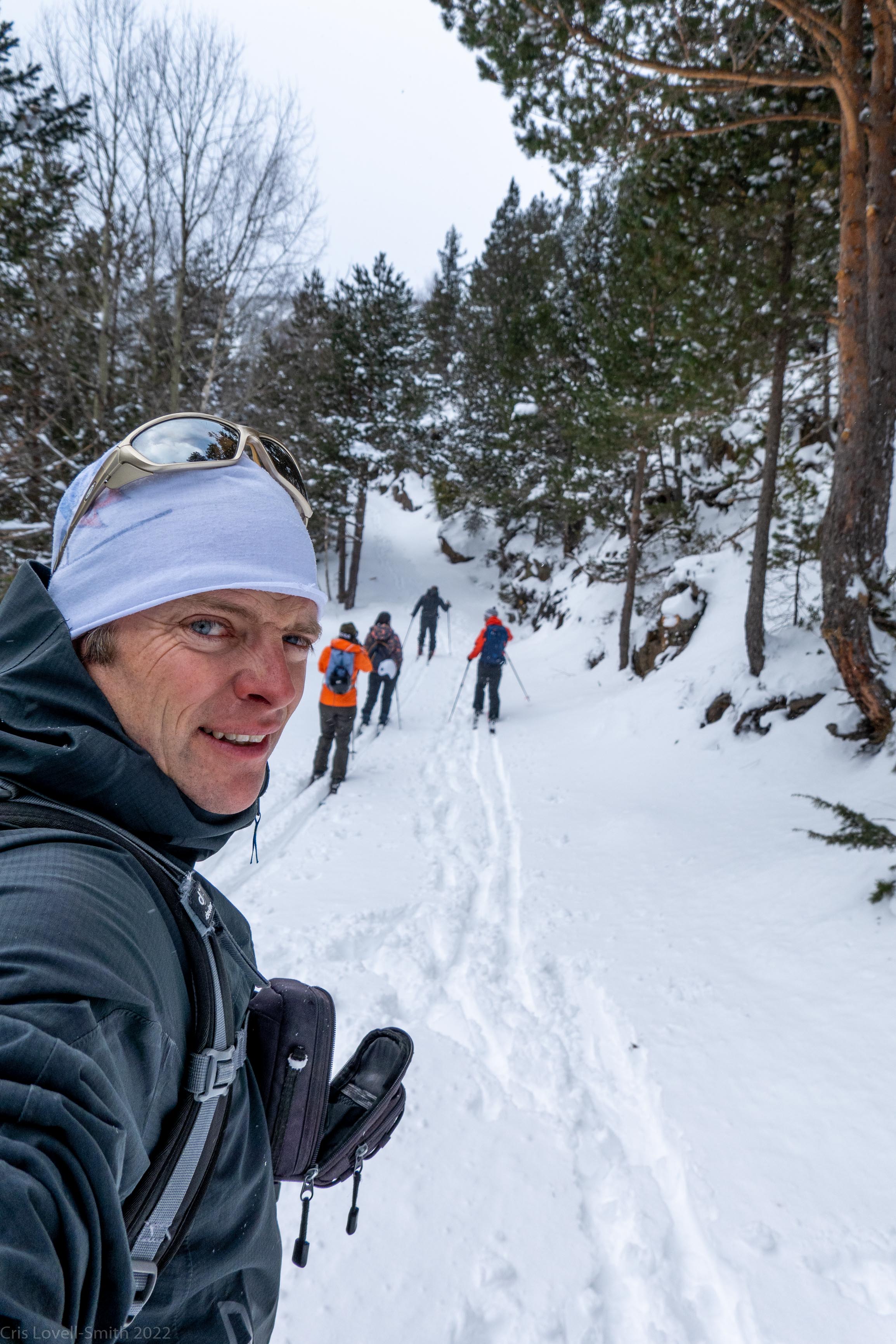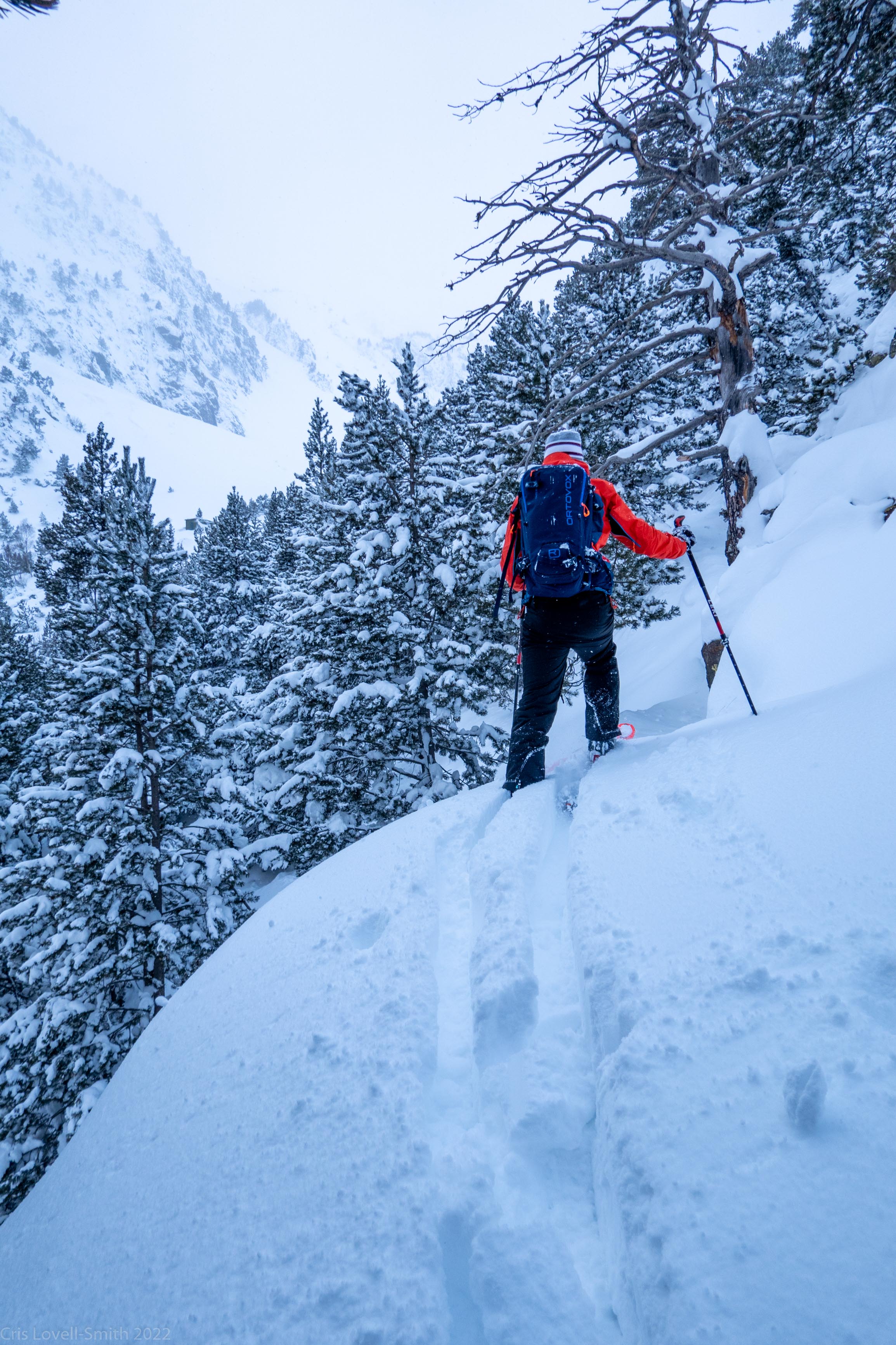 The weather was much much better. With the help of the mountain guide in the ski rental shop we chose a tour that was avalanche safe. We skinned up along a snow covered access road to a mountain hut (Refugi Borda de Sorteny) where we stopped for lunch. The snow was still soft, powdery and perfect. Johannes and I went ahead dropping down to the river from the hut and crossing a small bridge. We toured up through trees following fresh tracks. Leaving the forest, we skinned up slowly towards a frozen lake. We turned around above the lake and had a great powder run back down towards the forest. We picked our way down through the forest doing sharp turns through the trees until we were out onto a gentle slope that took us back down to a small stream. Crossing at the bridge we skied back down the snow covered vehicle track to the cars. We practiced avalanche rescues at the car park with Ari and Anaïs once they returned. Johannes hid a transceiver and we tried to find it and rescue it quickly. There was a fair bit of chaos involved.