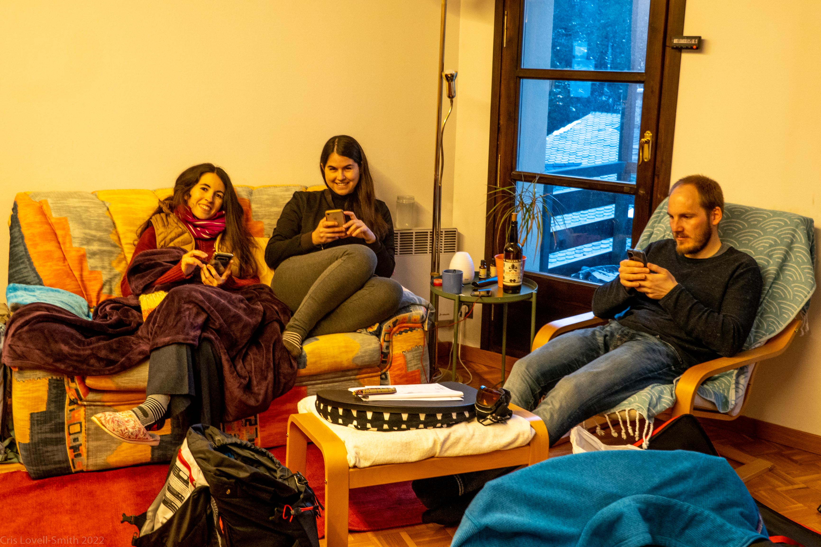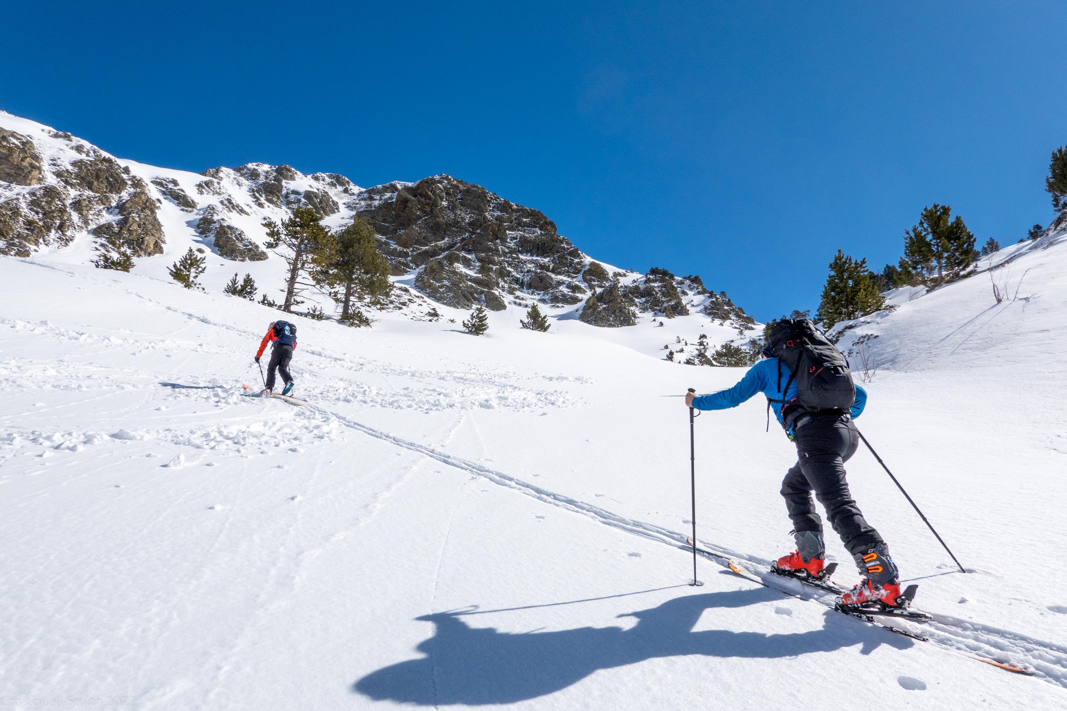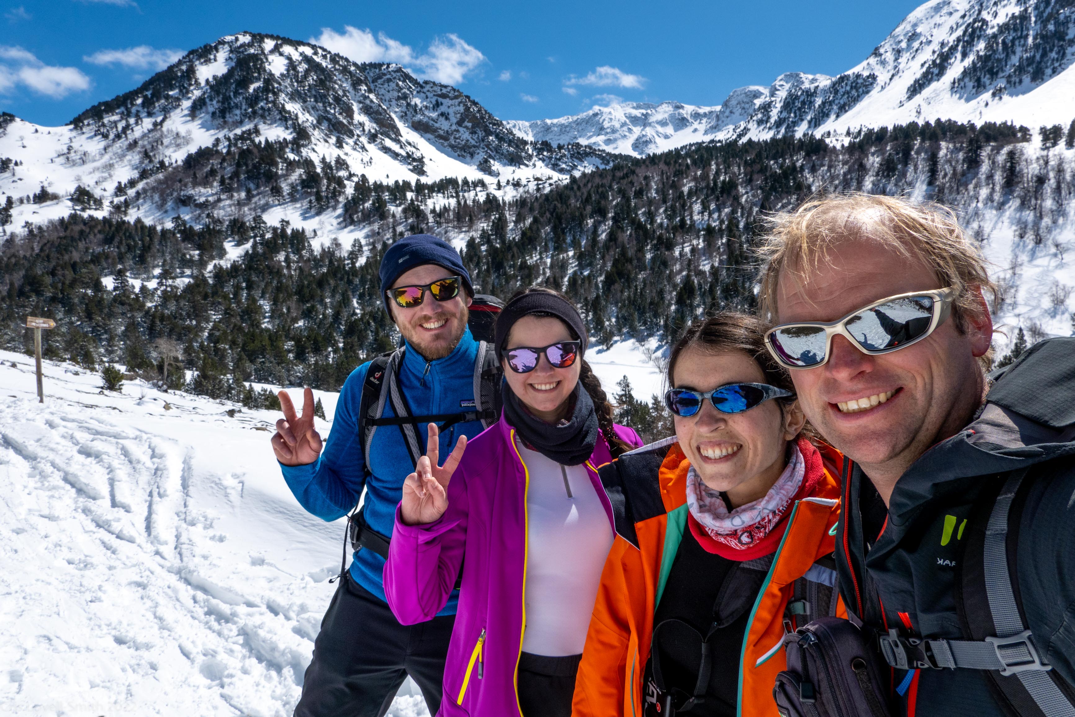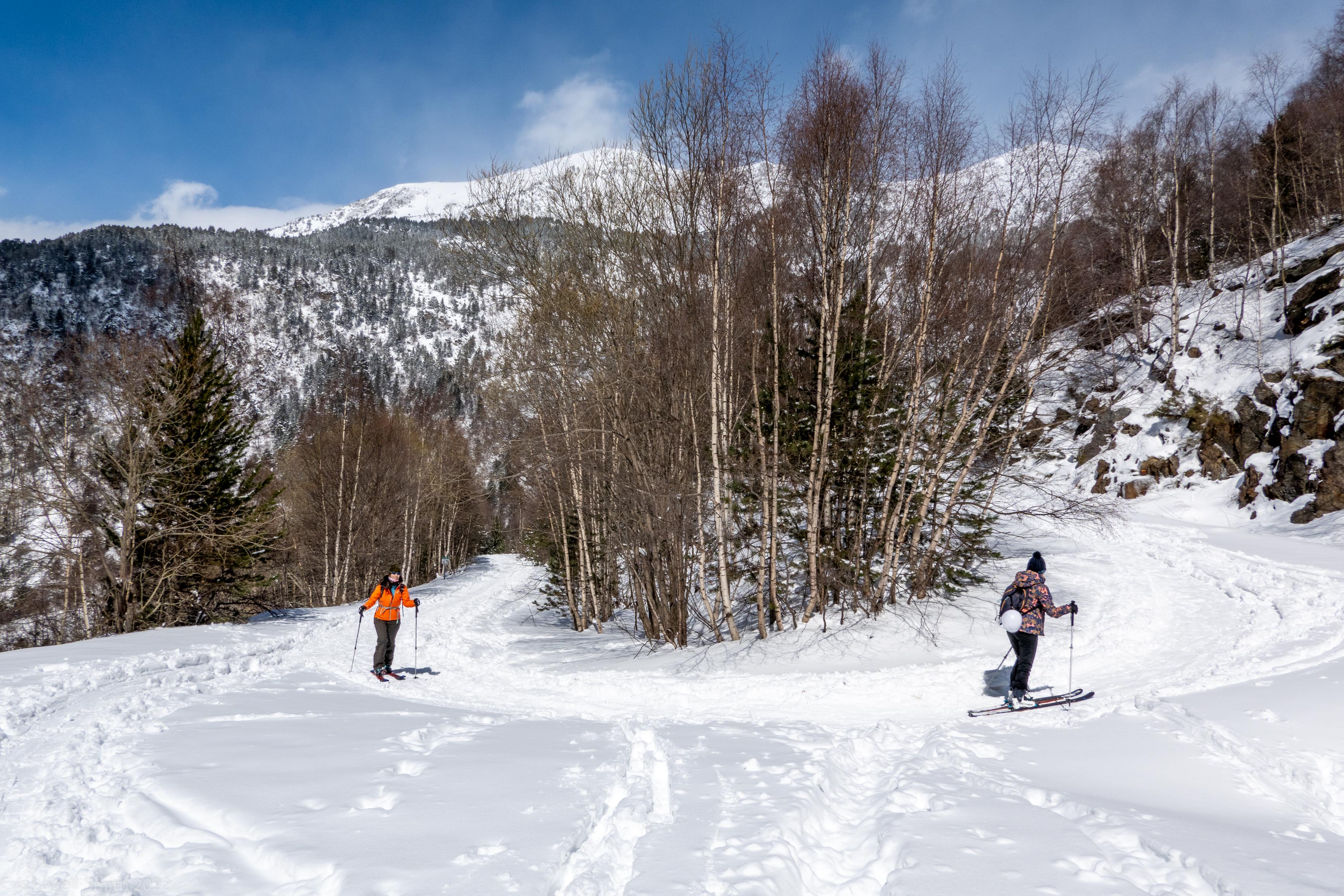 The weather was much much better. With the help of the mountain guide in the ski rental shop we chose a tour that was avalanche safe. We skinned up along a snow covered access road to a mountain hut (Refugi Borda de Sorteny) where we stopped for lunch. The snow was still soft, powdery and perfect. Johannes and I went ahead dropping down to the river from the hut and crossing a small bridge. We toured up through trees following fresh tracks. Leaving the forest, we skinned up slowly towards a frozen lake. We turned around above the lake and had a great powder run back down towards the forest. We picked our way down through the forest doing sharp turns through the trees until we were out onto a gentle slope that took us back down to a small stream. Crossing at the bridge we skied back down the snow covered vehicle track to the cars. We practiced avalanche rescues at the car park with Ari and Anaïs once they returned. Johannes hid a transceiver and we tried to find it and rescue it quickly. There was a fair bit of chaos involved.