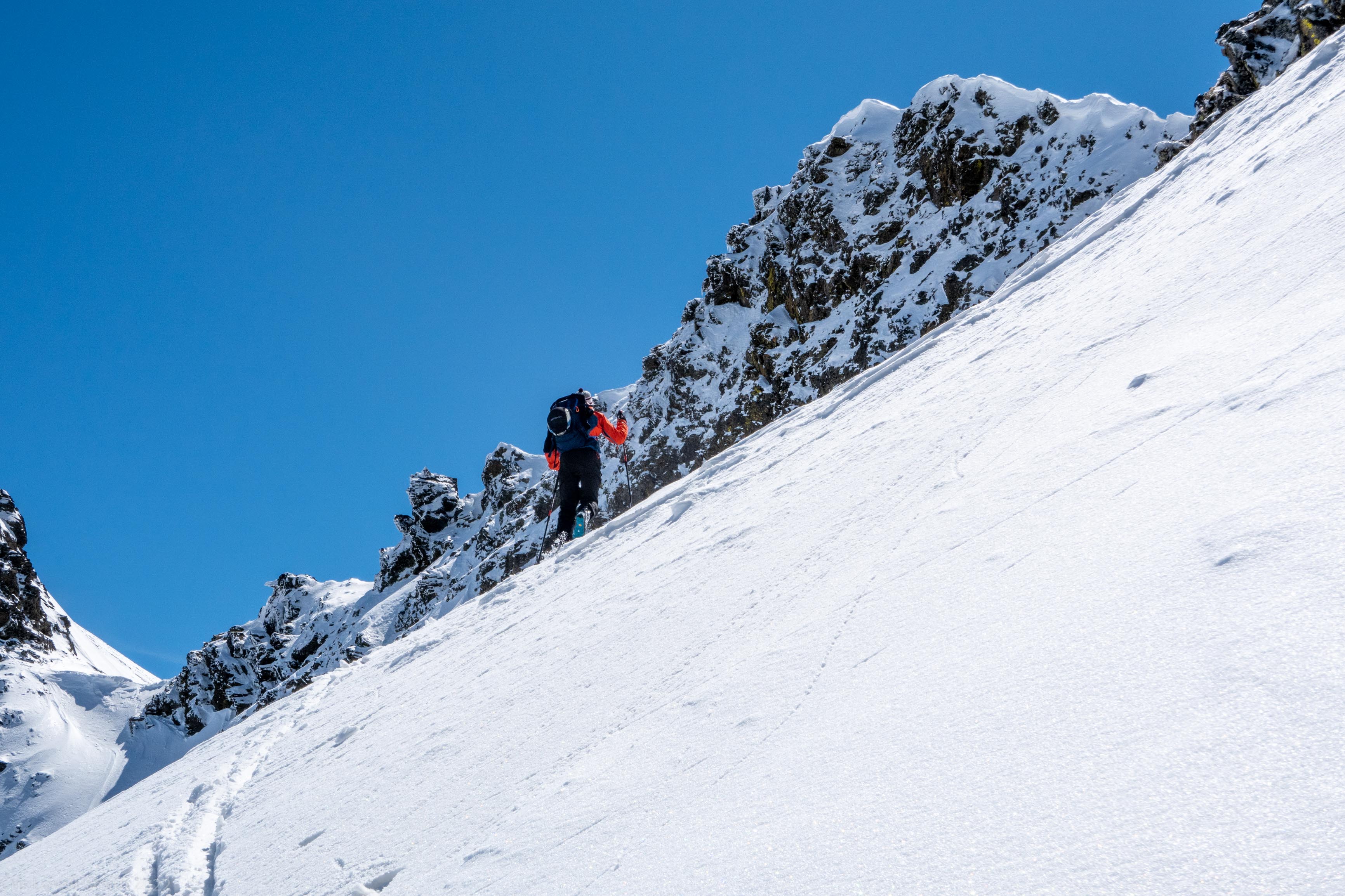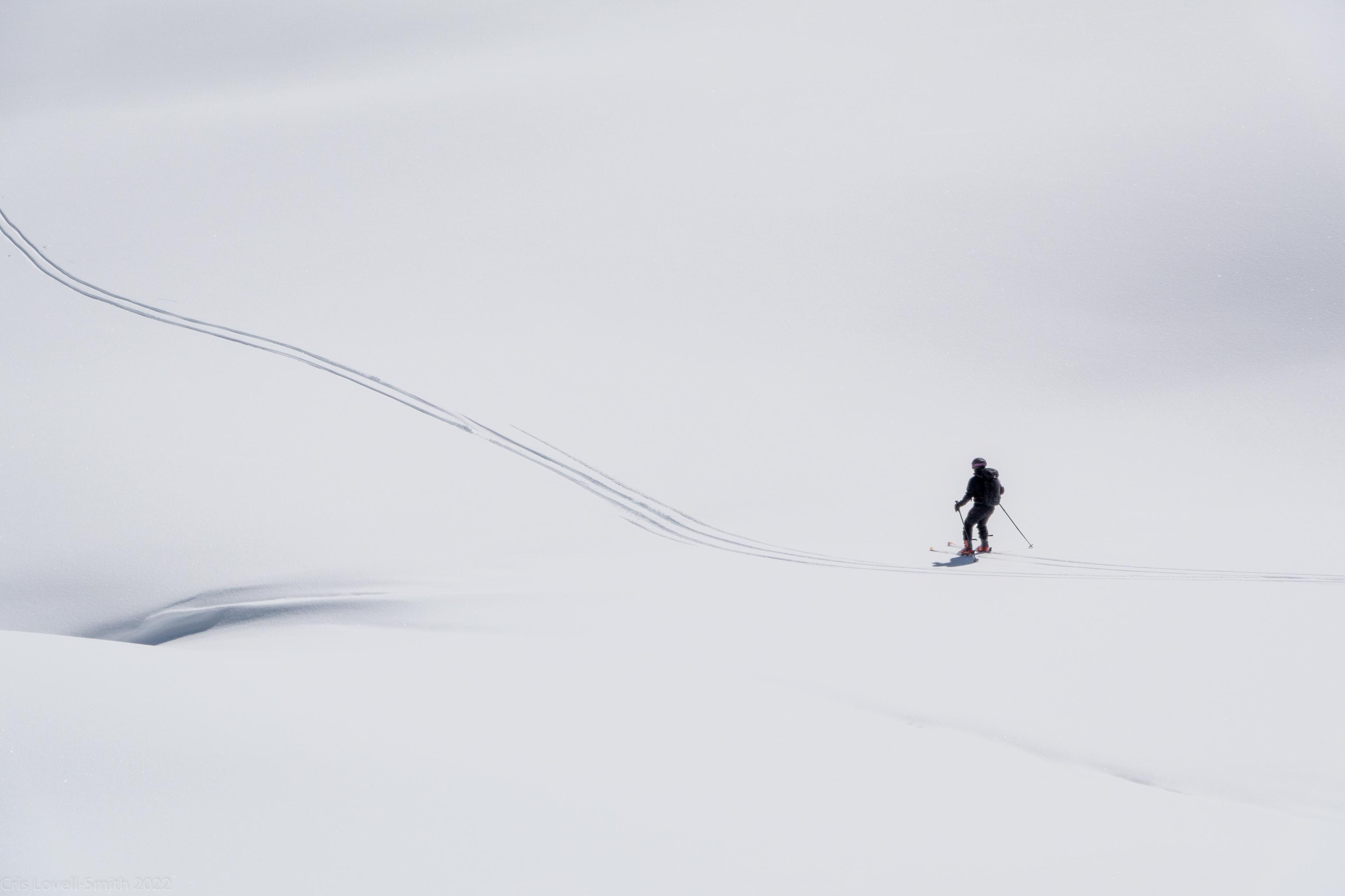 We carefully got out our shovels while Johannes waited on the slope further back. We’d been keeping a distance from each other, not for covid reasons but in an attempt not to load the snow pack. It was avalanche level 3 and until now the slopes had felt safe. Milan managed to get his skis onto his bag and started up the steep slope ramming his shovel into the snow for grip. I dug a hole and very carefully took my skis off my feet making sure they didn’t vanish off down the side of the mountain and then maneuvered them around onto my back pack. I moved off letting Johannes approach and I helped him sort out his gear from the relative safety of the hole. Johannes wasn’t sure about this.