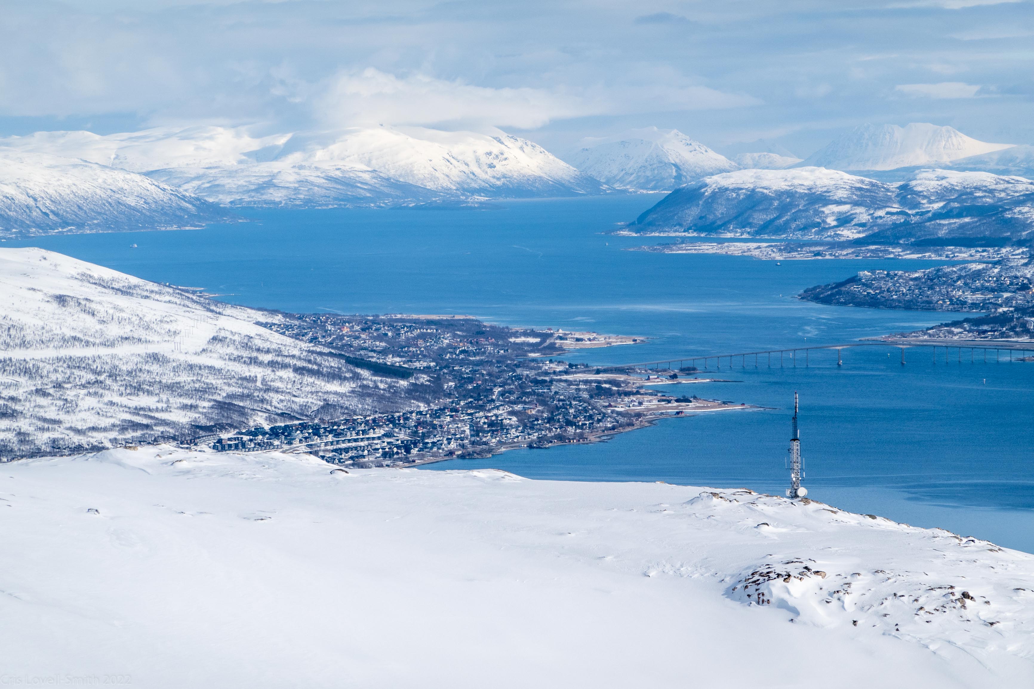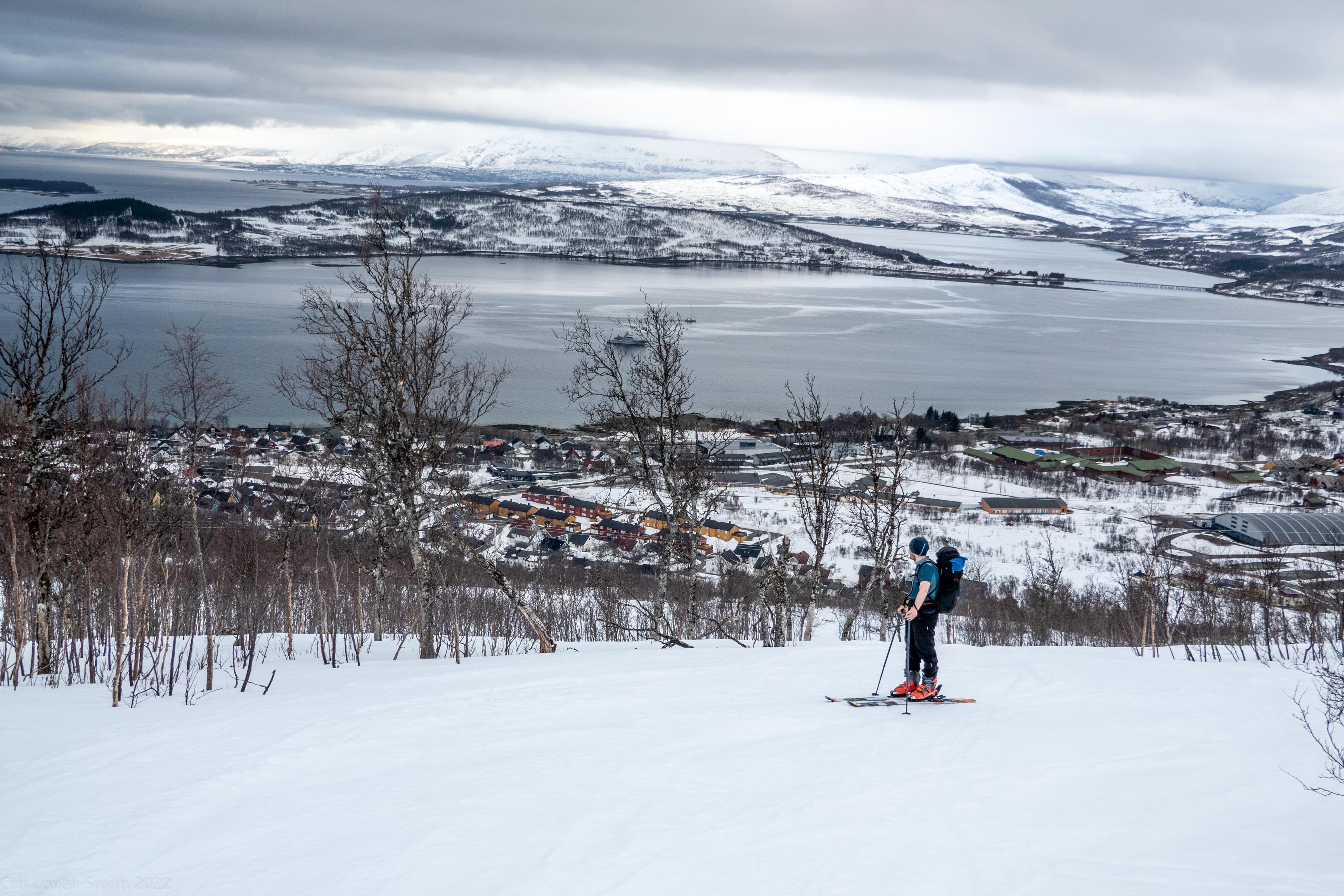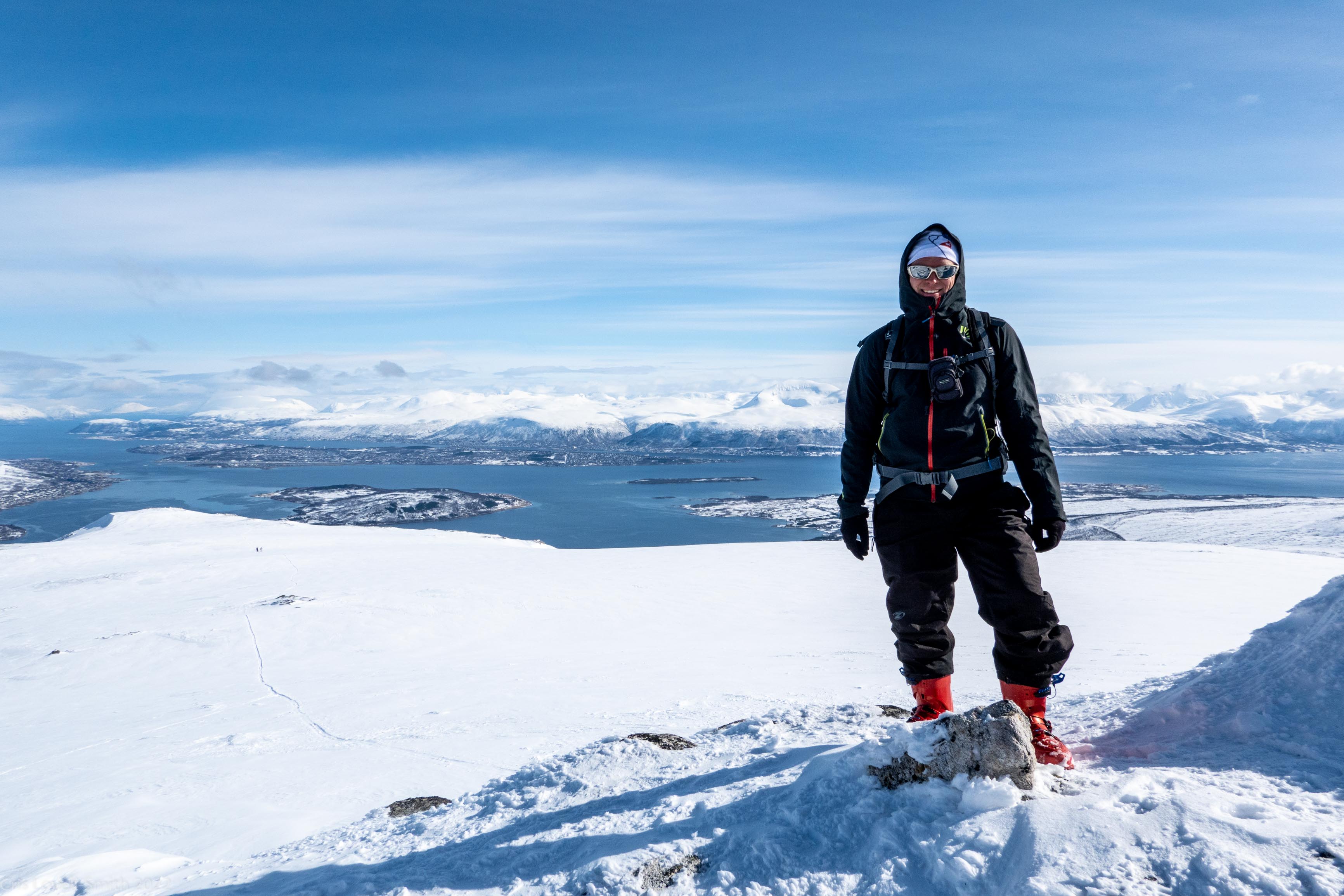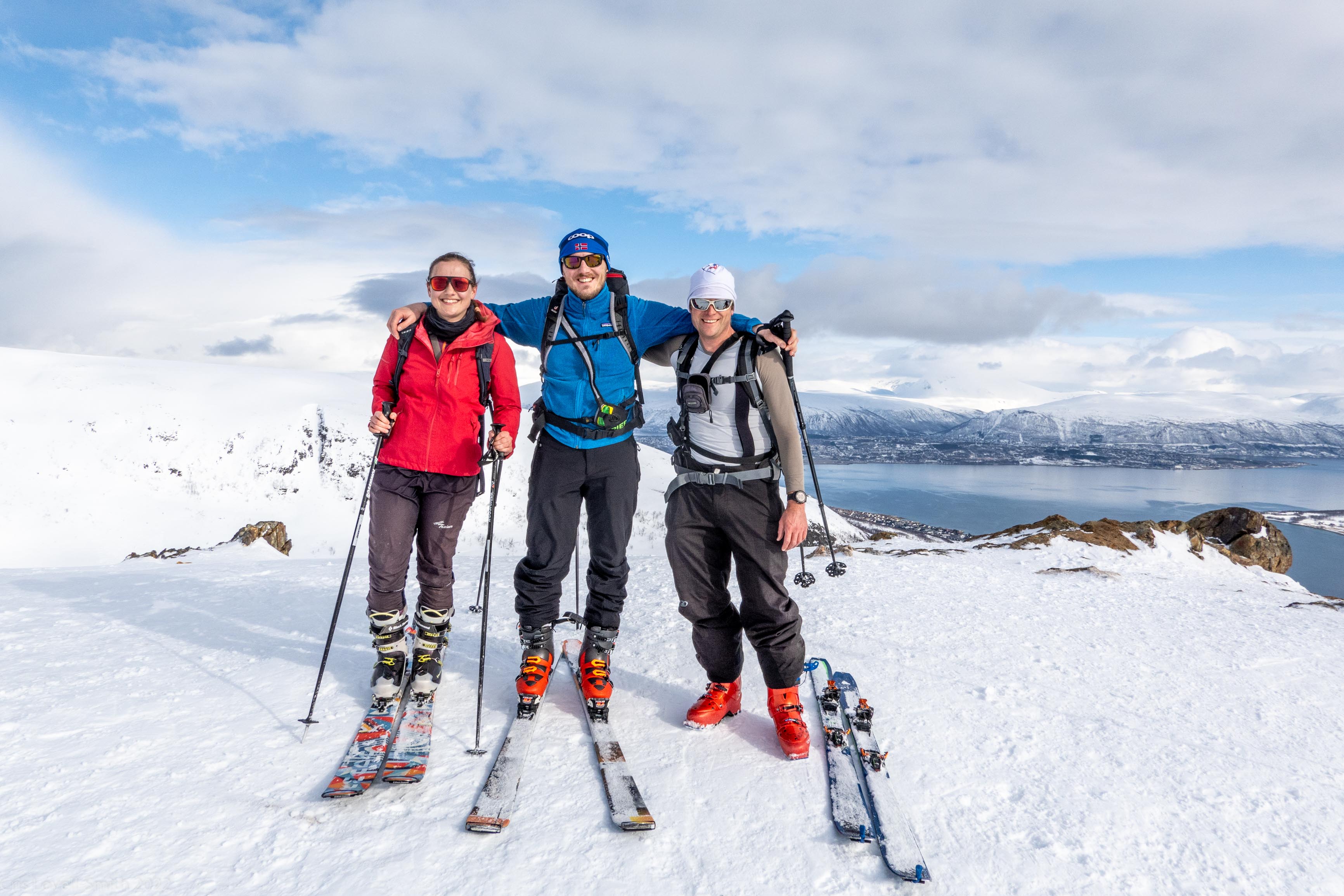 It was our last day and we didn’t have a lot of time. The weather was still fantastic though so we got up early despite our evening tour and subsequent late night. We headed around to the next fiord named Ersfjord and parked at the end of the road. The plan was to head up to the peak named Hatten. It was looking very much like spring time. The snow was looking very patchy at the bottom and we weaved our way up, connecting the patches of still remaining snow and navigating around trees and rock. The snow cover increased as we ascended and the last third, at least, of the ascent was with good cover. We took photos at the top and then had a really nice descent, cutting turns in the spring snow. It looked pretty amazing with the snow and the blue fjord below. We scraped our way down the last part, again weaving between rocks and trees, joining the patches. We stopped for a coffee at a small café at the edge of the fjord and enjoyed the view of the snowy peaks above the sea. Then it was back to the Air BnB, a quick tidy and we were heading to Tromsø for lunch and then on to the airport.
