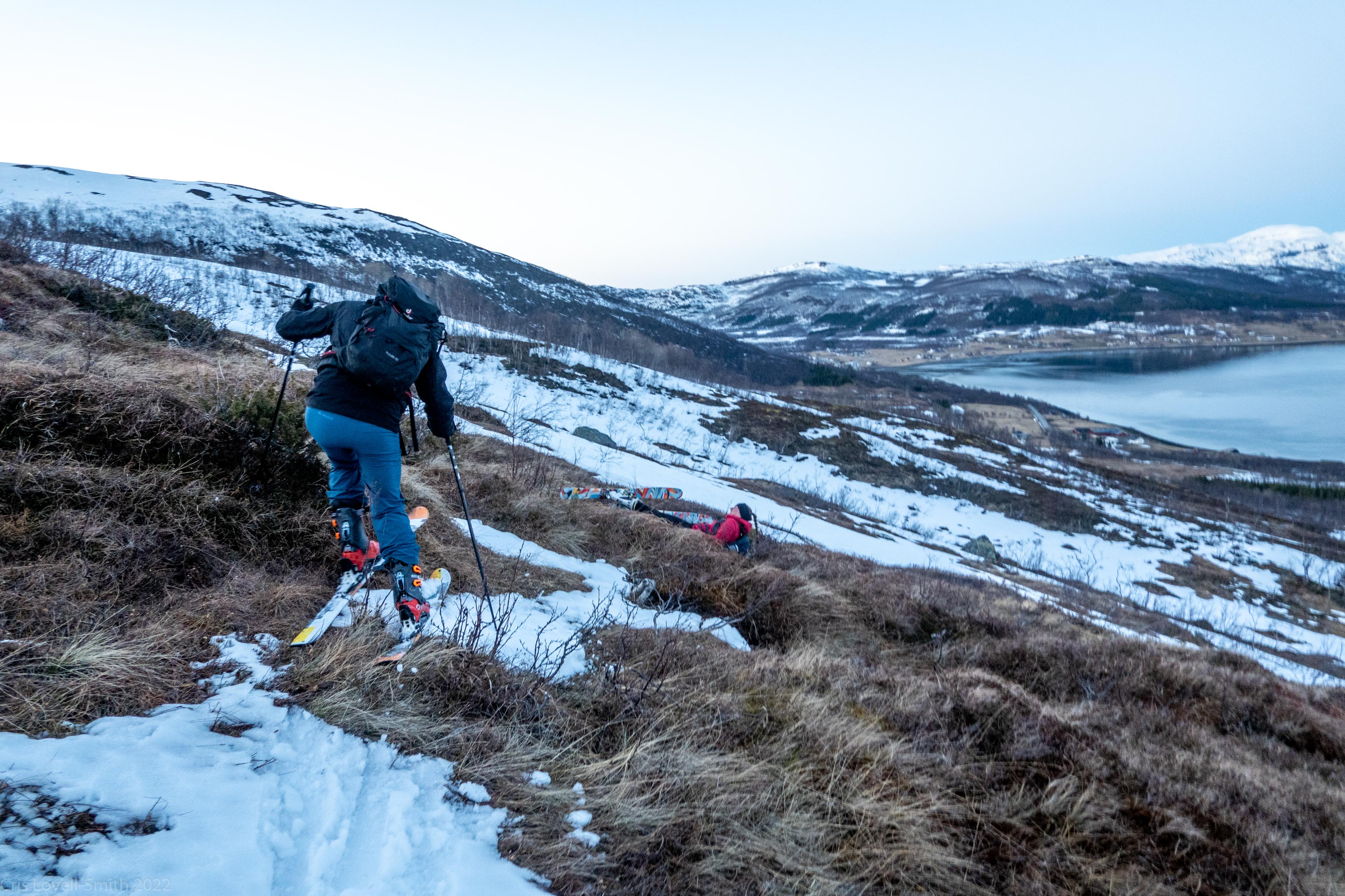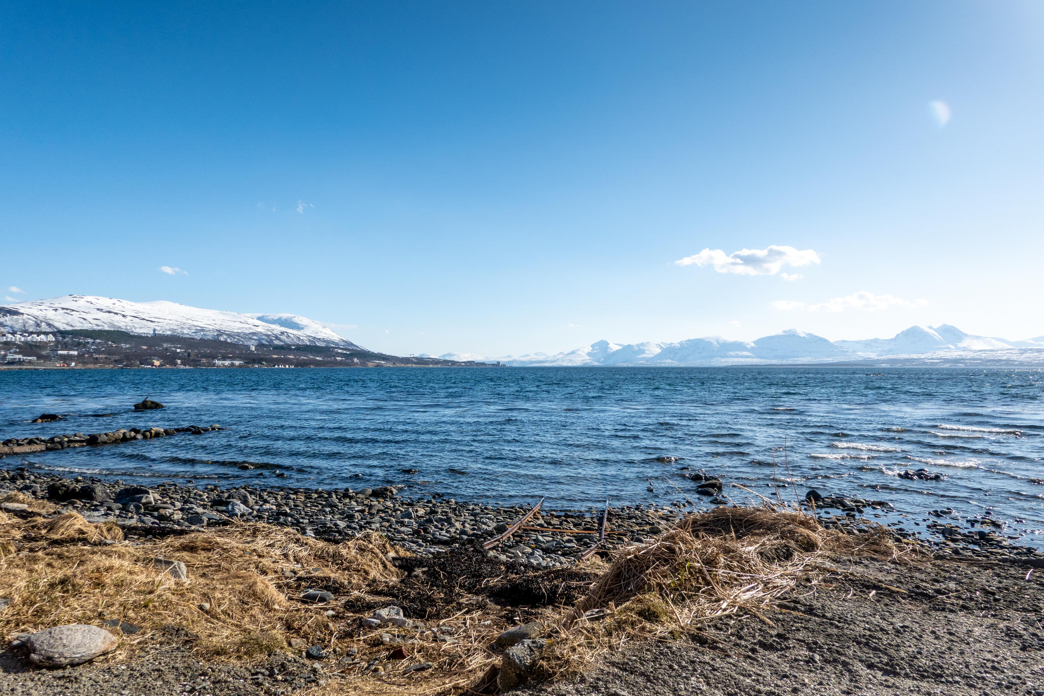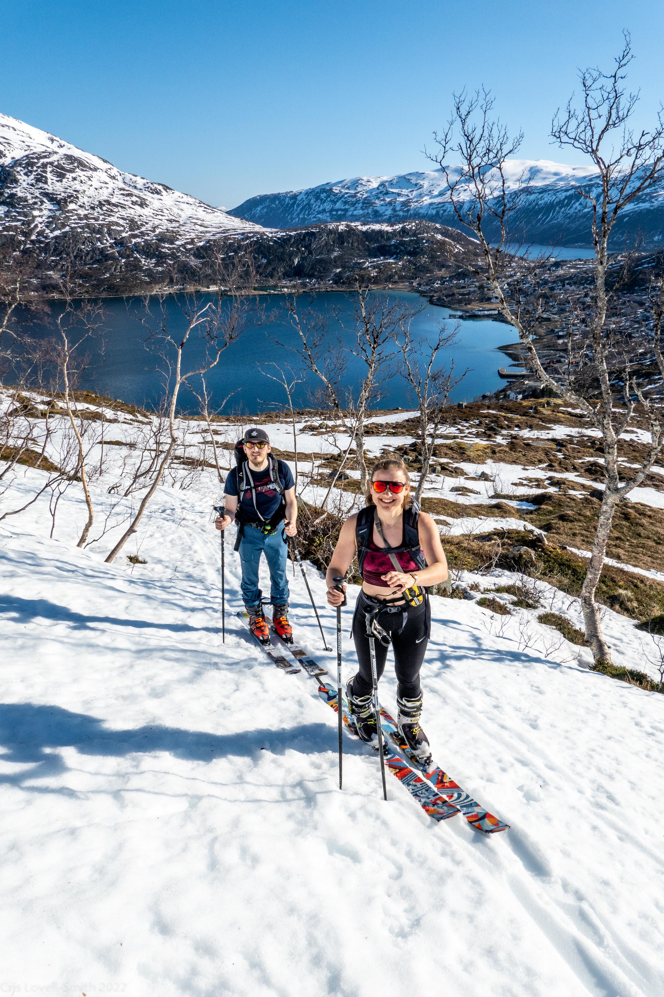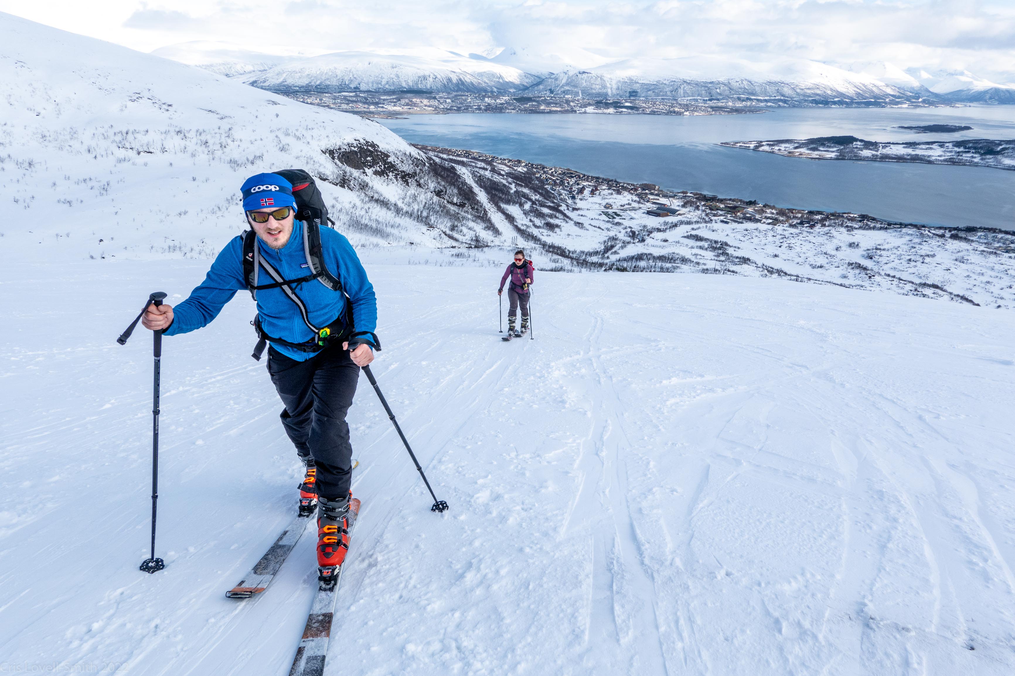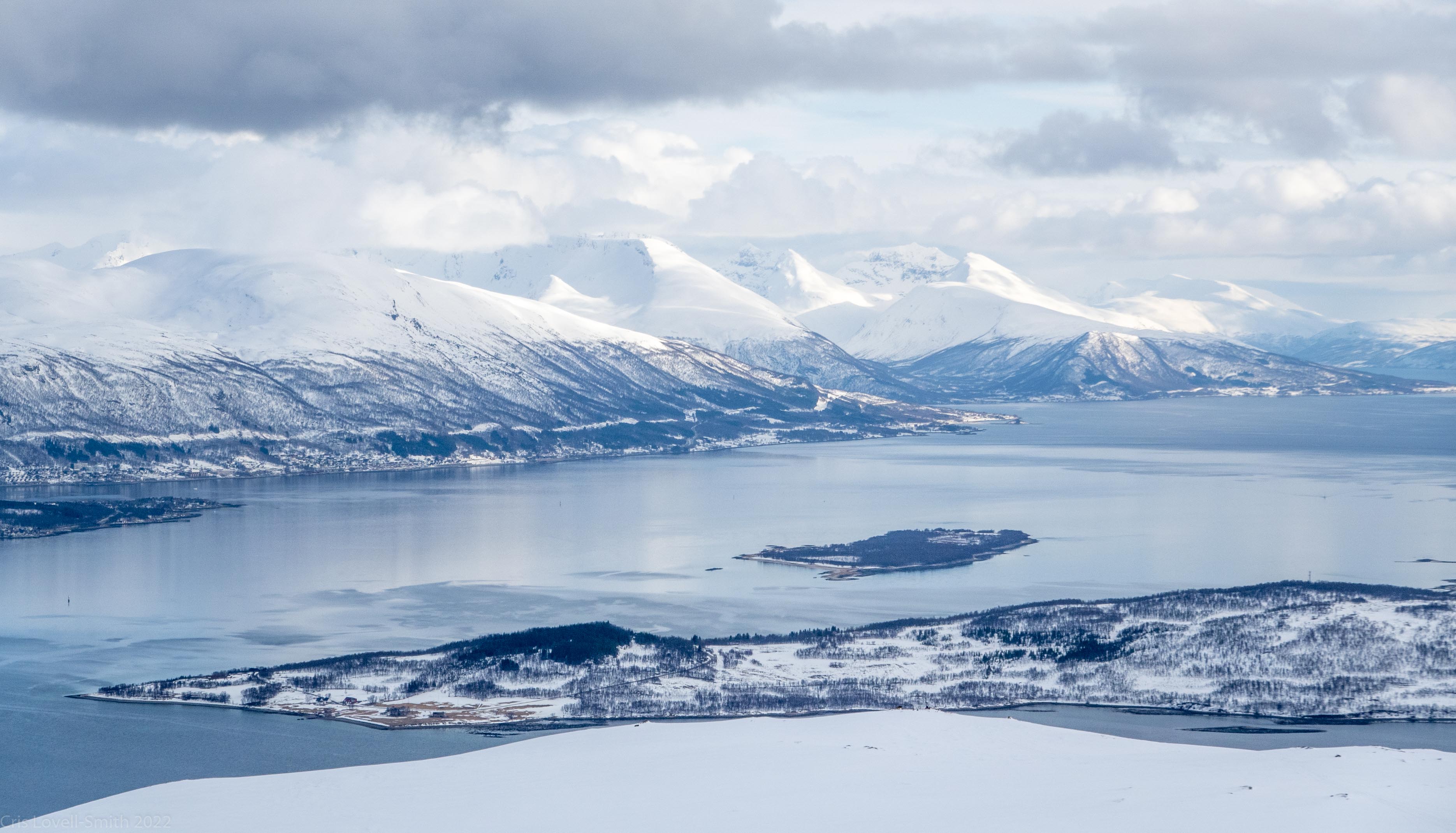 It was our last day and we didn’t have a lot of time. The weather was still fantastic though so we got up early despite our evening tour and subsequent late night. We headed around to the next fiord named Ersfjord and parked at the end of the road. The plan was to head up to the peak named Hatten. It was looking very much like spring time. The snow was looking very patchy at the bottom and we weaved our way up, connecting the patches of still remaining snow and navigating around trees and rock. The snow cover increased as we ascended and the last third, at least, of the ascent was with good cover. We took photos at the top and then had a really nice descent, cutting turns in the spring snow. It looked pretty amazing with the snow and the blue fjord below. We scraped our way down the last part, again weaving between rocks and trees, joining the patches. We stopped for a coffee at a small café at the edge of the fjord and enjoyed the view of the snowy peaks above the sea. Then it was back to the Air BnB, a quick tidy and we were heading to Tromsø for lunch and then on to the airport.