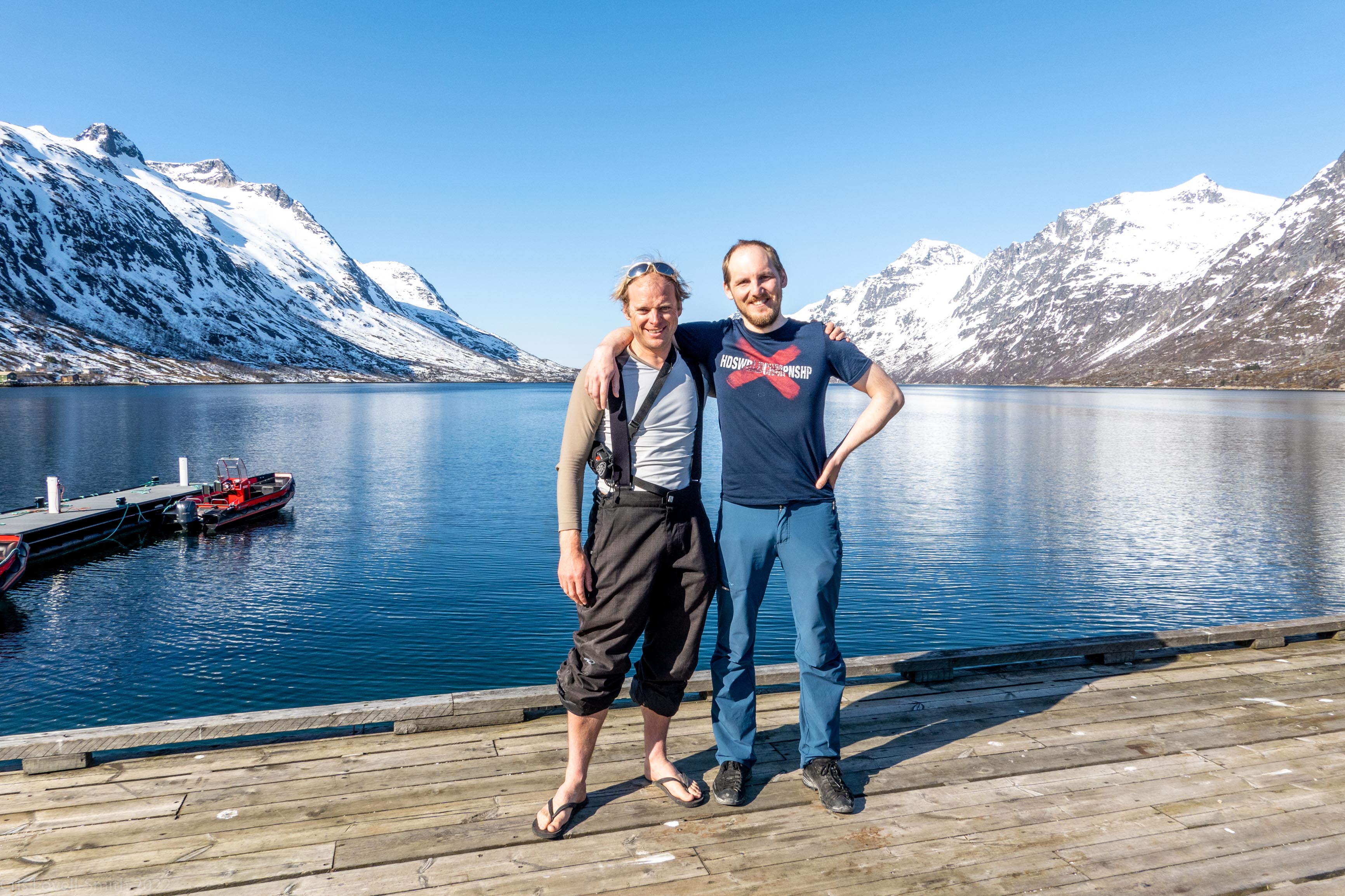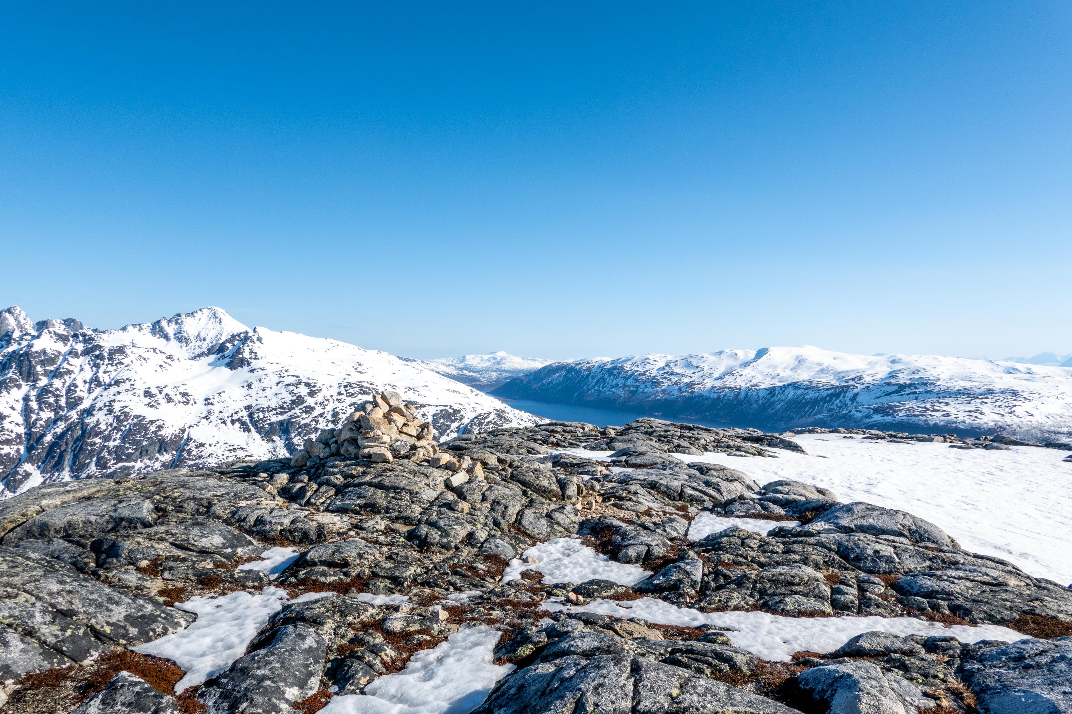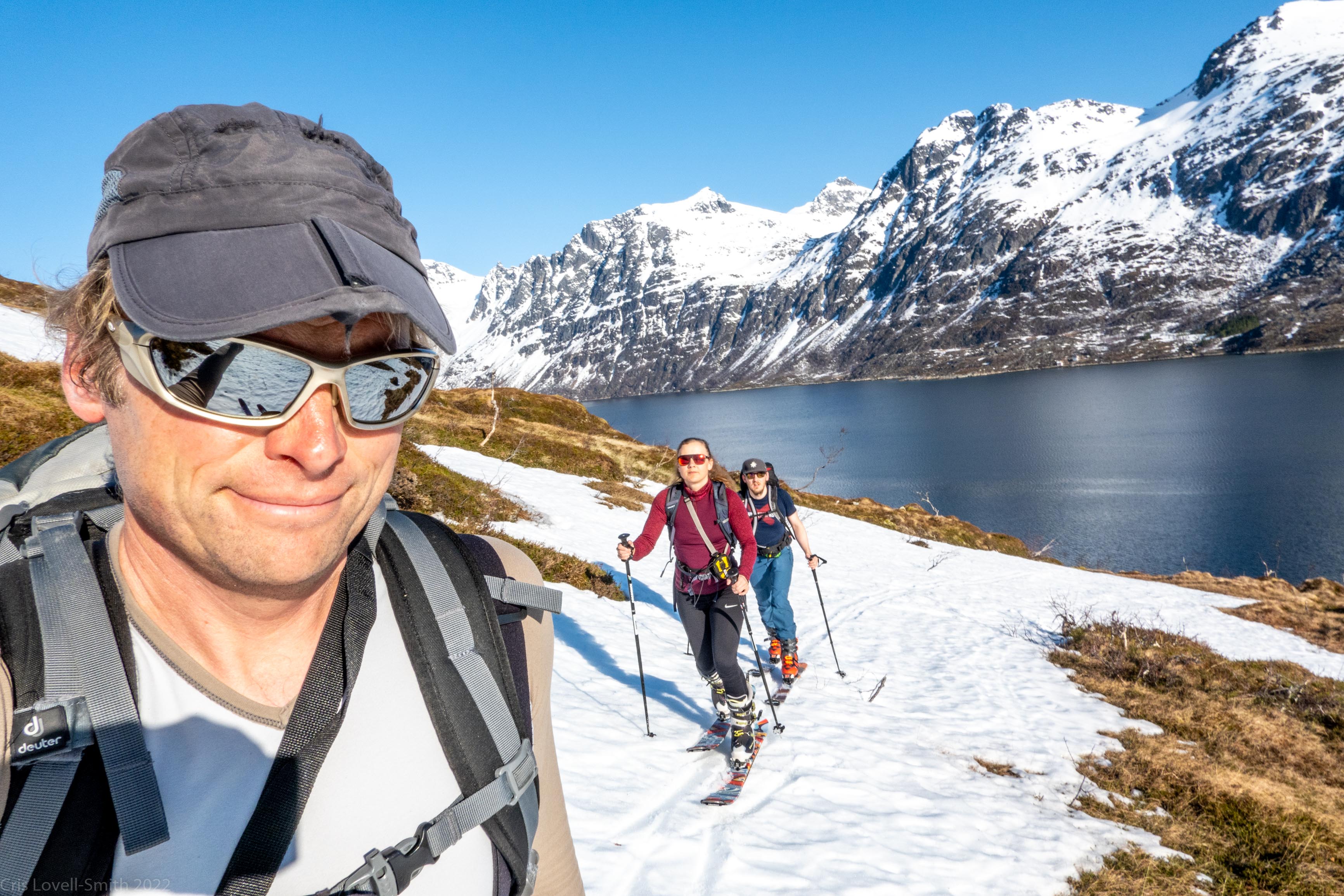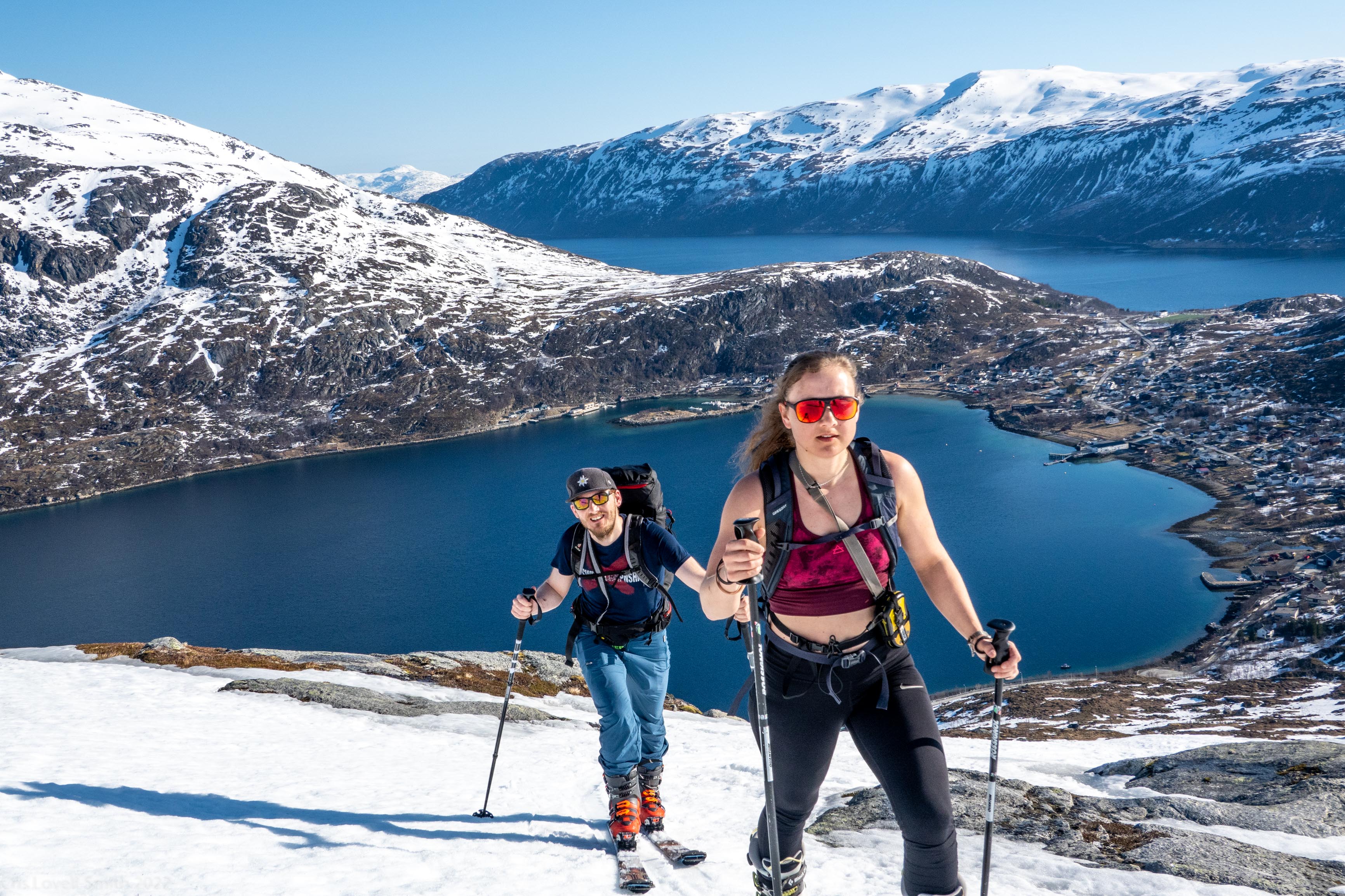 It was our last day and we didn’t have a lot of time. The weather was still fantastic though so we got up early despite our evening tour and subsequent late night. We headed around to the next fiord named Ersfjord and parked at the end of the road. The plan was to head up to the peak named Hatten. It was looking very much like spring time. The snow was looking very patchy at the bottom and we weaved our way up, connecting the patches of still remaining snow and navigating around trees and rock. The snow cover increased as we ascended and the last third, at least, of the ascent was with good cover. We took photos at the top and then had a really nice descent, cutting turns in the spring snow. It looked pretty amazing with the snow and the blue fjord below. We scraped our way down the last part, again weaving between rocks and trees, joining the patches. We stopped for a coffee at a small café at the edge of the fjord and enjoyed the view of the snowy peaks above the sea. Then it was back to the Air BnB, a quick tidy and we were heading to Tromsø for lunch and then on to the airport.