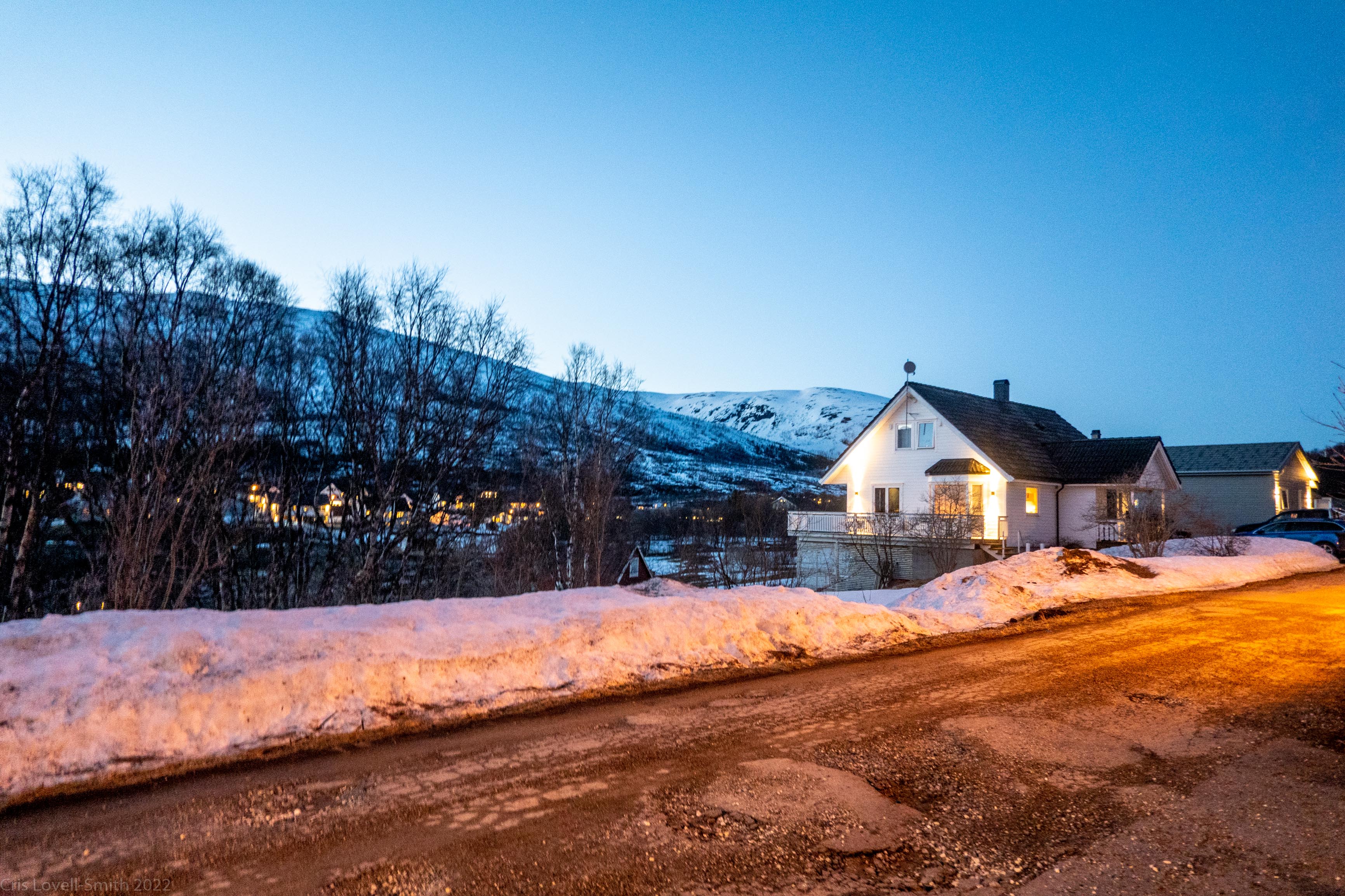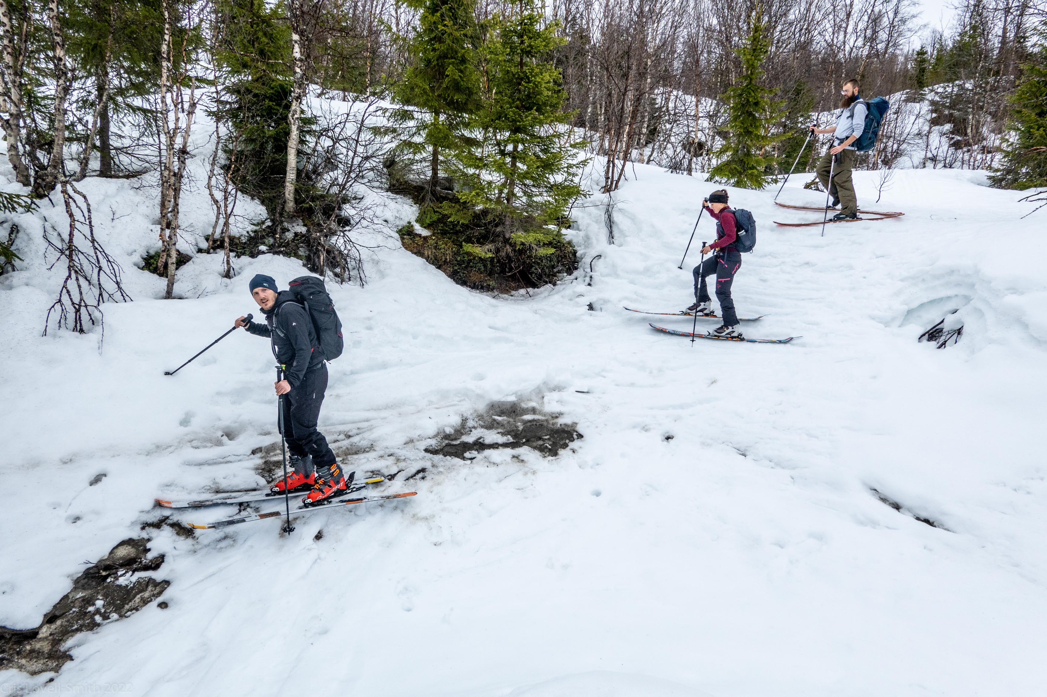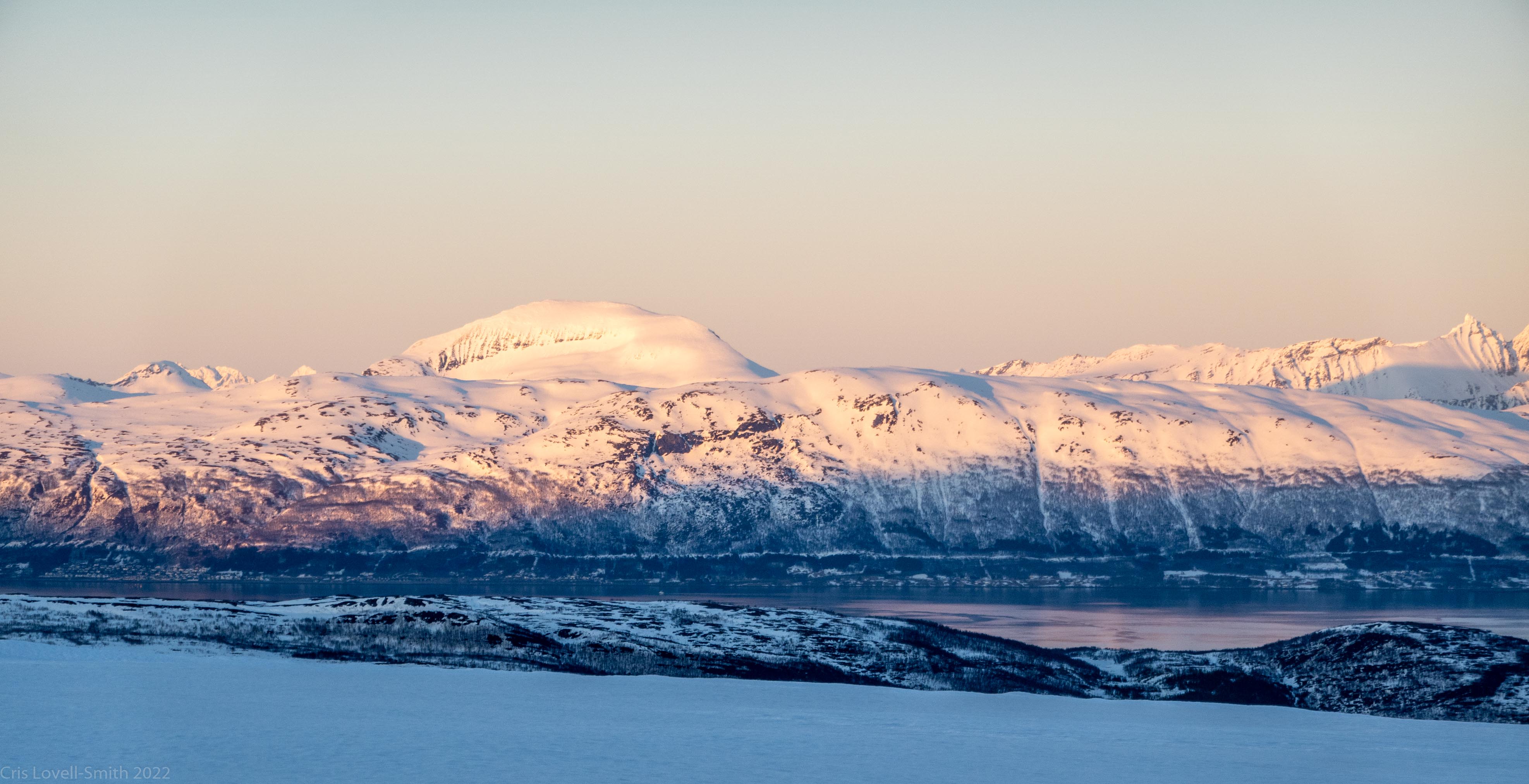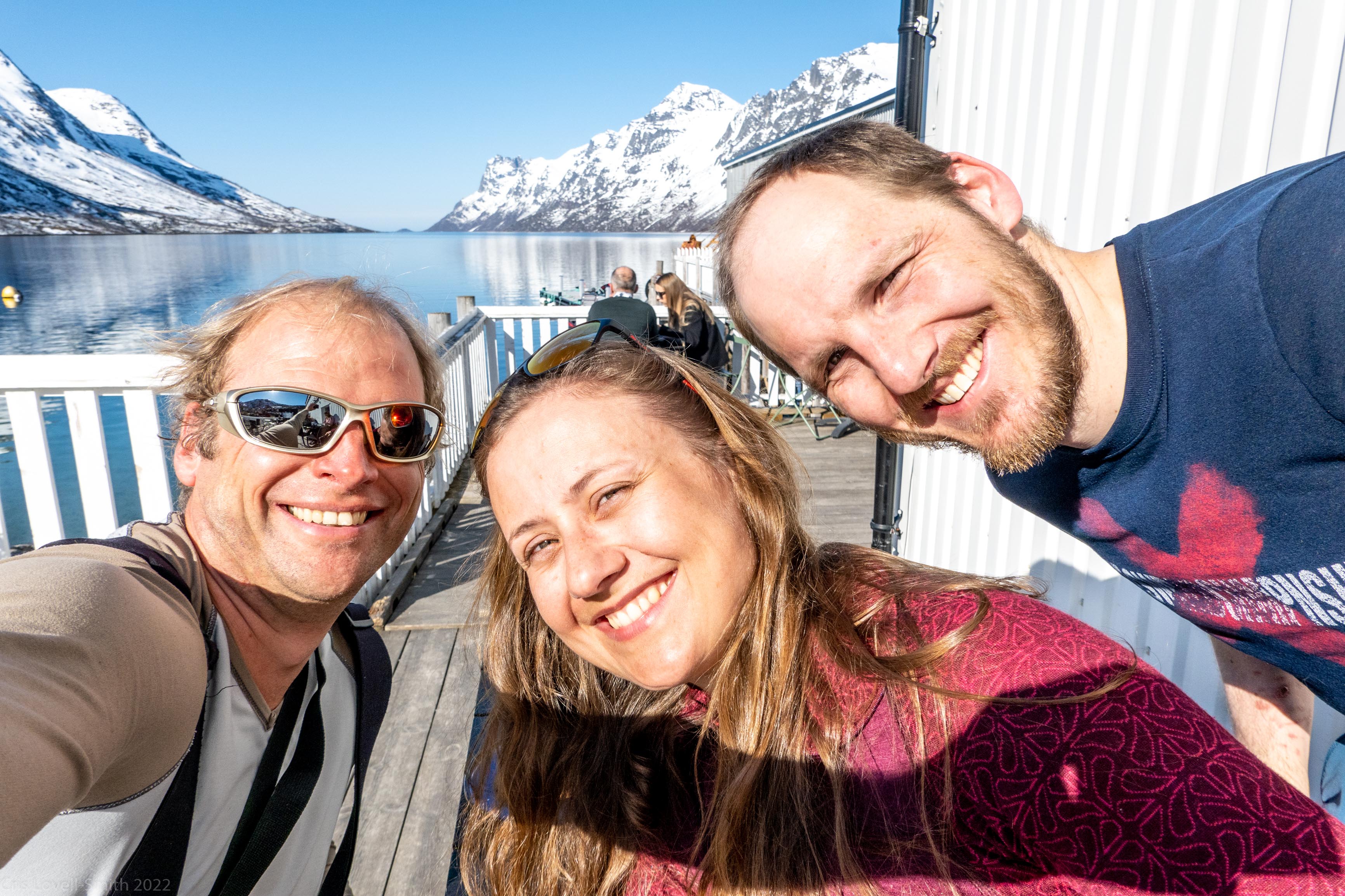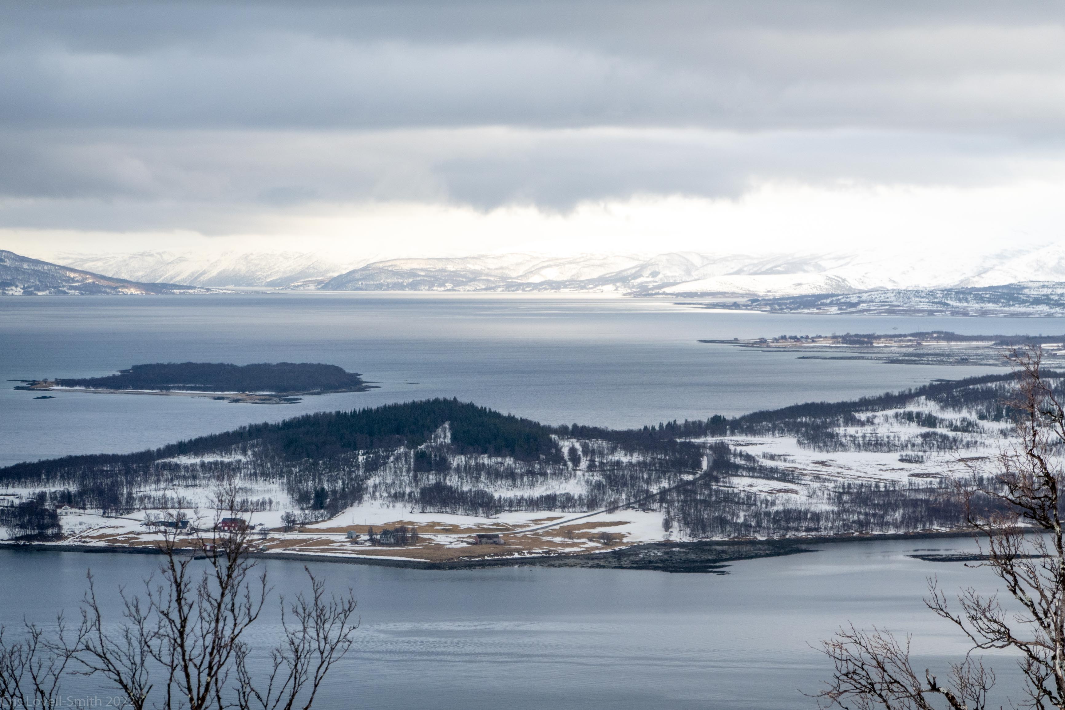It was our last day and we didn’t have a lot of time. The weather was still fantastic though so we got up early despite our evening tour and subsequent late night. We headed around to the next fiord named Ersfjord and parked at the end of the road. The plan was to head up to the peak named Hatten. It was looking very much like spring time. The snow was looking very patchy at the bottom and we weaved our way up, connecting the patches of still remaining snow and navigating around trees and rock. The snow cover increased as we ascended and the last third, at least, of the ascent was with good cover. We took photos at the top and then had a really nice descent, cutting turns in the spring snow. It looked pretty amazing with the snow and the blue fjord below. We scraped our way down the last part, again weaving between rocks and trees, joining the patches. We stopped for a coffee at a small café at the edge of the fjord and enjoyed the view of the snowy peaks above the sea. Then it was back to the Air BnB, a quick tidy and we were heading to Tromsø for lunch and then on to the airport.