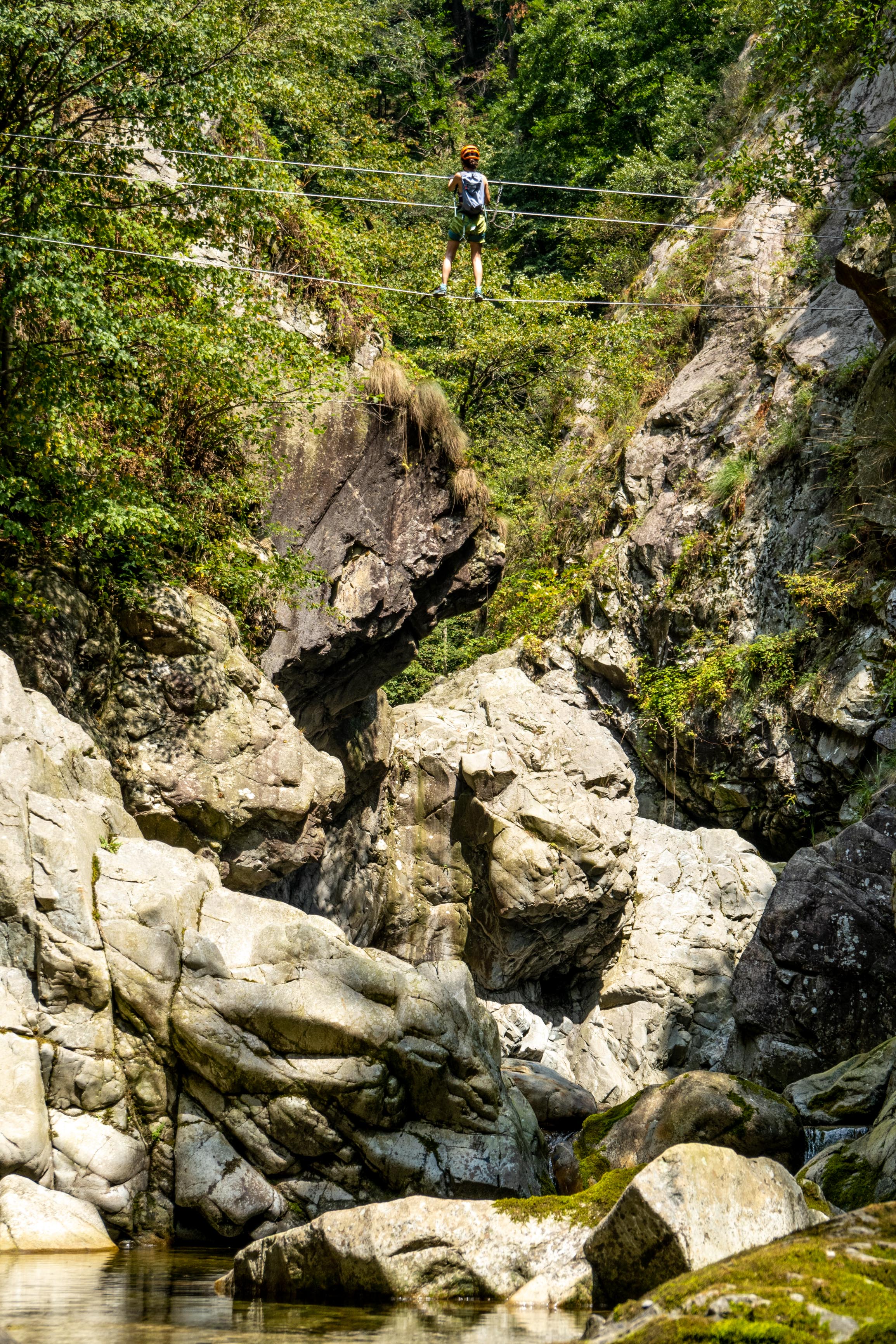 We left Ticino in the morning and drove the busy road that runs along the side of Lake Maggiore. We were heading to the Aosta Valley in Italy but had planned a stop along the way at a ferrata that runs along the inside of a canyon. It was another 30+ degree day and I was happy to jump in the river at the start of the ferrata. The route was the Ferrata dell’Infernone. We followed the river upstream, sometimes walking, sometimes scrambling up sections with steel rope. We crossed on a wire bridge with a great view of a waterfall. After the first section we stopped at a refugio for a cold drink after being tricked by signage indicating that the ferrata route went past the refugio. It didn’t of course but they surely get some good business out of their cunning redirection of foot traffic.