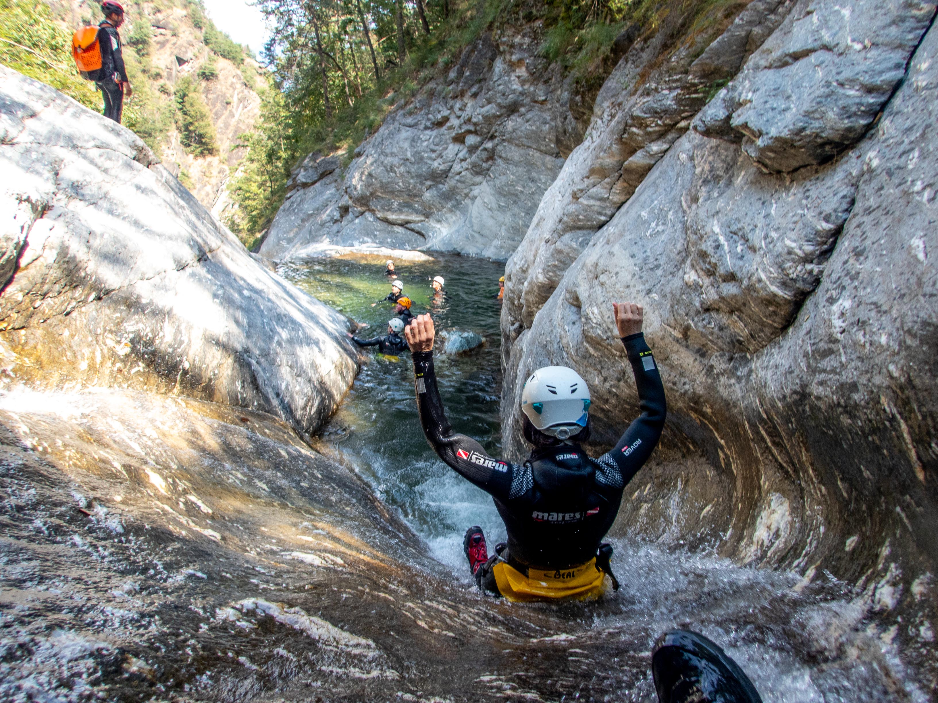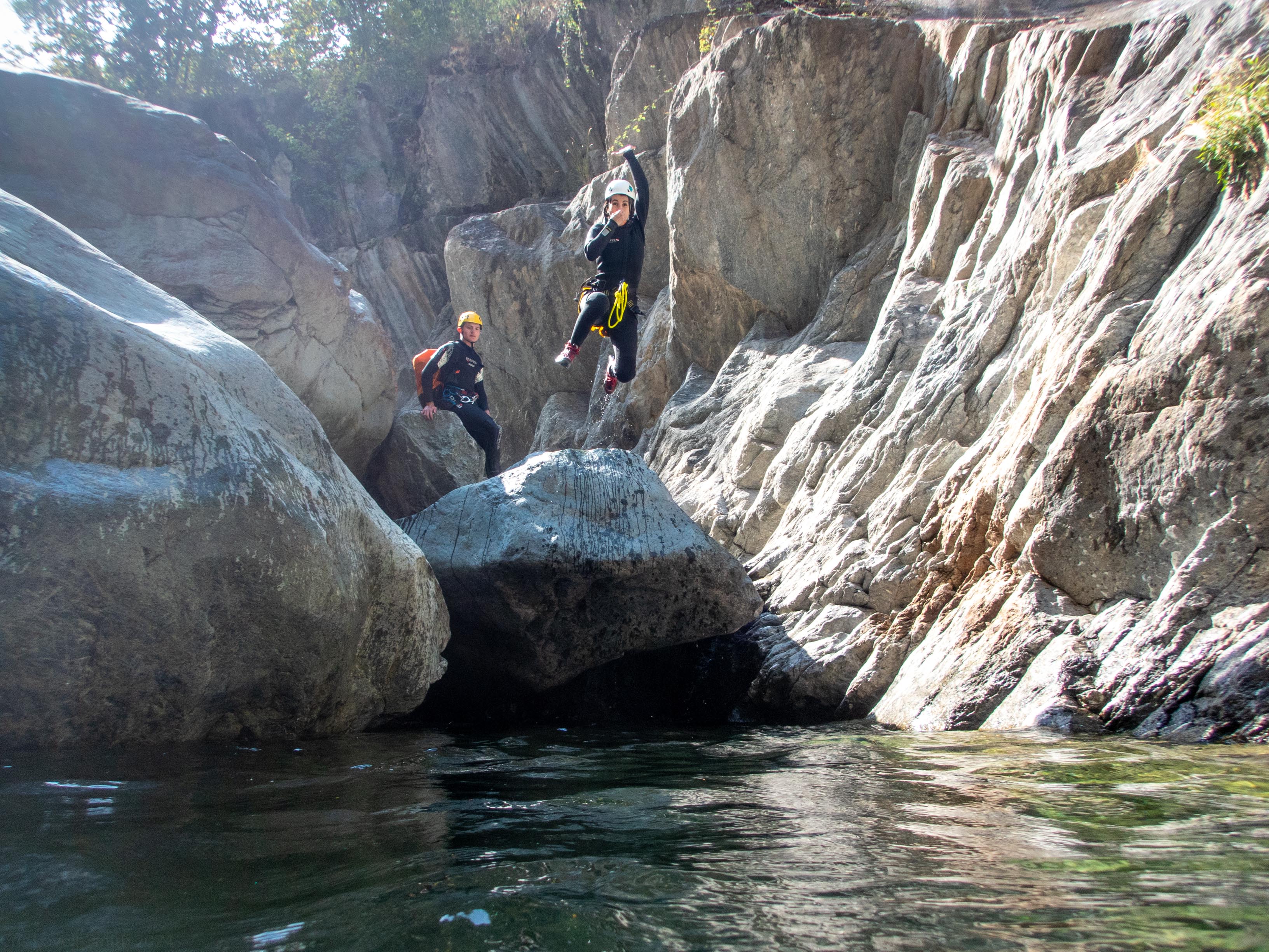In the afternoon we went canyoning with a commercial guide. We didn’t have our own canyoning gear with us or Craig to lead the way so it was pay a guide or nothing. Given that it was very hot again we decided a guide would be ok. We chose a canyon in the same area where we’d been yesterday, the Chalamy canyon. It begins from the river that flows out of the regional park where we’d done the ferrata. We had a short walk up the true right of the river before abseiling down 20 metres or so into the river. When I say abseiling, the guide lowered us down into the river. We were quite a big group at about 10 people, but it was just us and an extended family from the Netherlands. The canyon was quite enjoyable. The water was quite warm. We did a number of slides and jumps including a 10 metre one near the end of the canyon, which was quite exciting.