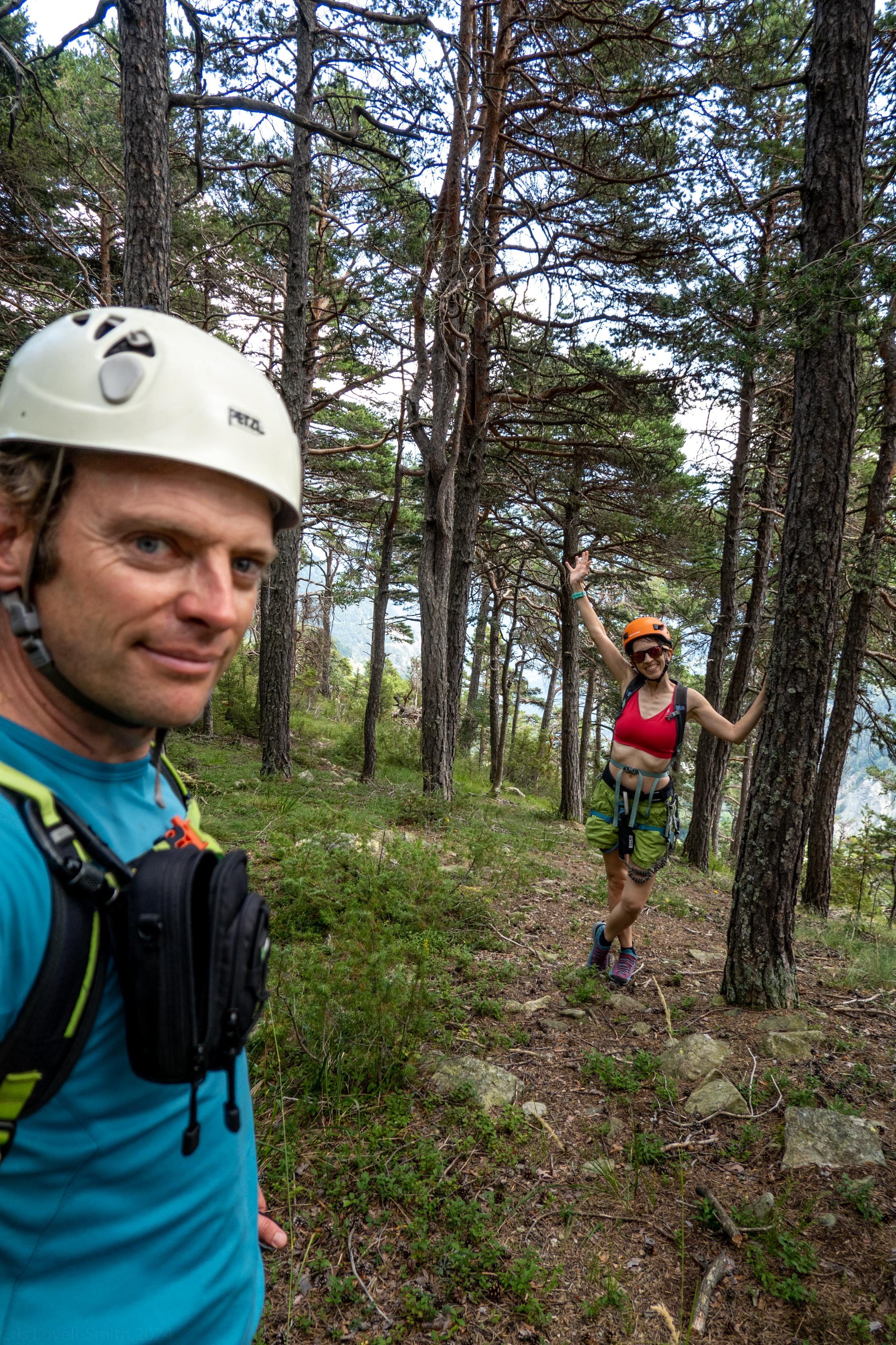 To avoid the worst of the heat we drove up into the hills to a regional park. It was a little cooler and we set off to do the Ferrata Covarey. It took us a while to find it as the signage was almost non-existent, just some faded signs near the car park mentioning the route. We found a track online though and navigated to the start. The ferrata was supposed to be easy with a couple of wooden ladders for something different but there were no wooden ladders to be seen. Instead there was a long ladder of sorts constructed from steel cable. This proved a little difficult to climb as it wobbled around a lot. The next sections proved much harder than I’d expected. They were all quite doable but not super easy. Unlike ferratas in Austria where the cable is taught and there are plenty of metal stakes for your feet we had to use the rock much more. There were also bolts in places with suspicious bits of cord and steel cable loops, which we decided after finishing must have been attachments for the wooden ladder.