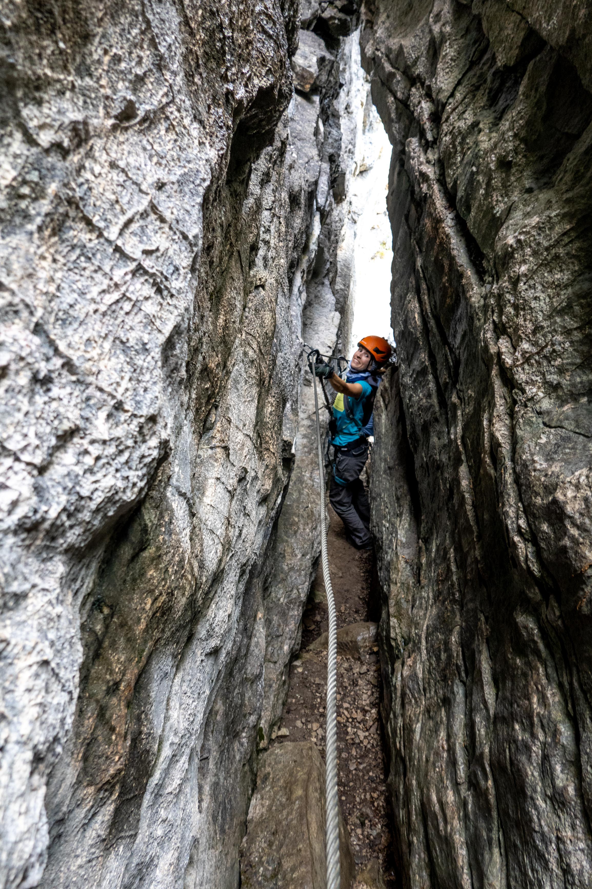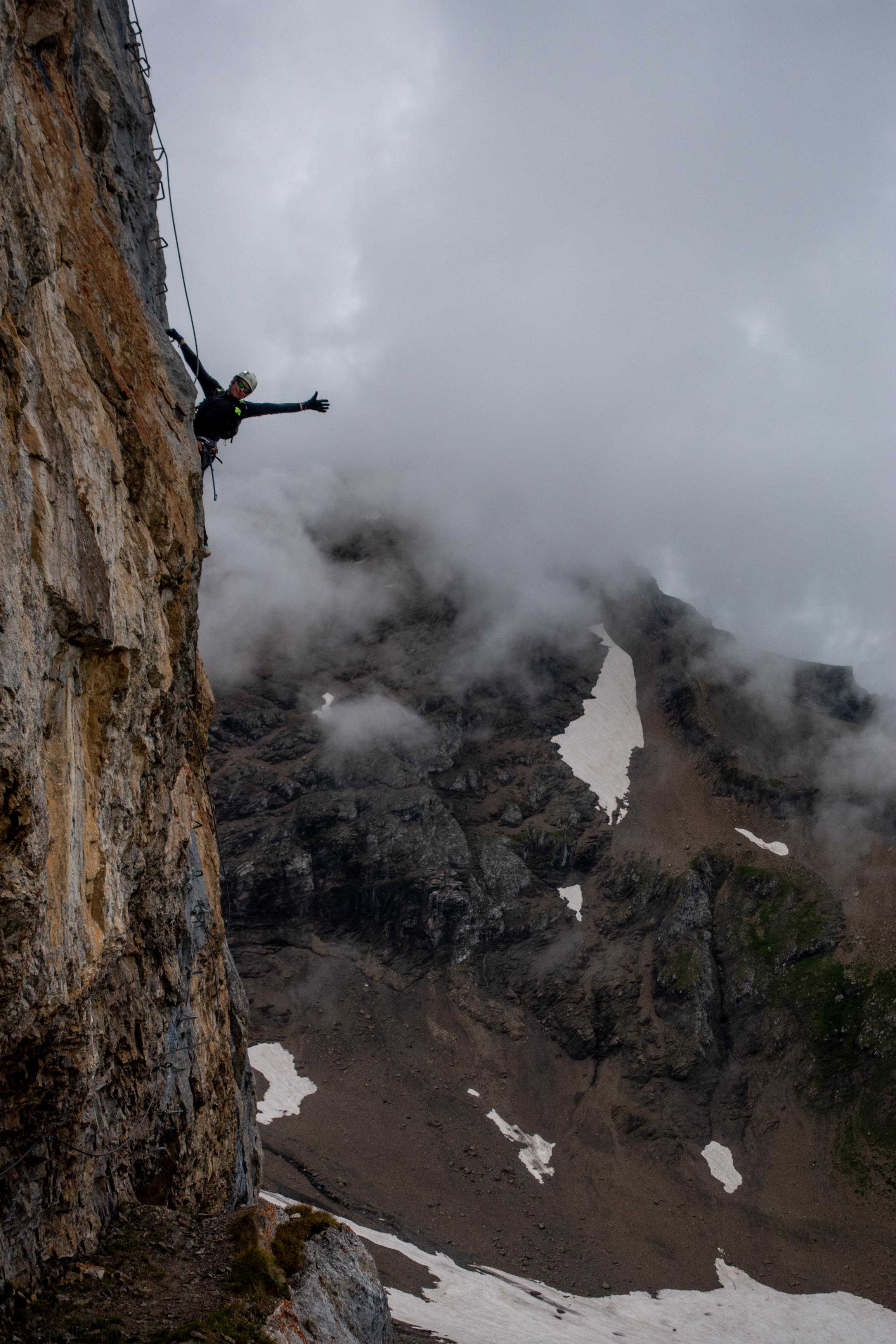 We went for a walk up to the very touristy Glacier3000 area and walked around on the slowly disappearing glacier for a bit. We then headed back down to the hut. The sun vanished on the way down and it became cloudy and grey. We geared up to do the ferrata that extends around the cliffs below the hut (Ferrata de la Tête aux Chamois). I’d seen the ferrata and the hut years ago with Leonie and had though it would be nice to stay there one day and do the ferrata. It was quite airy feeling as the cliff sits far above the valley and you feel quite exposed. Ari didn’t like the feeling too much and was keen to get it finished. I enjoyed it and got some nice pics along the way.