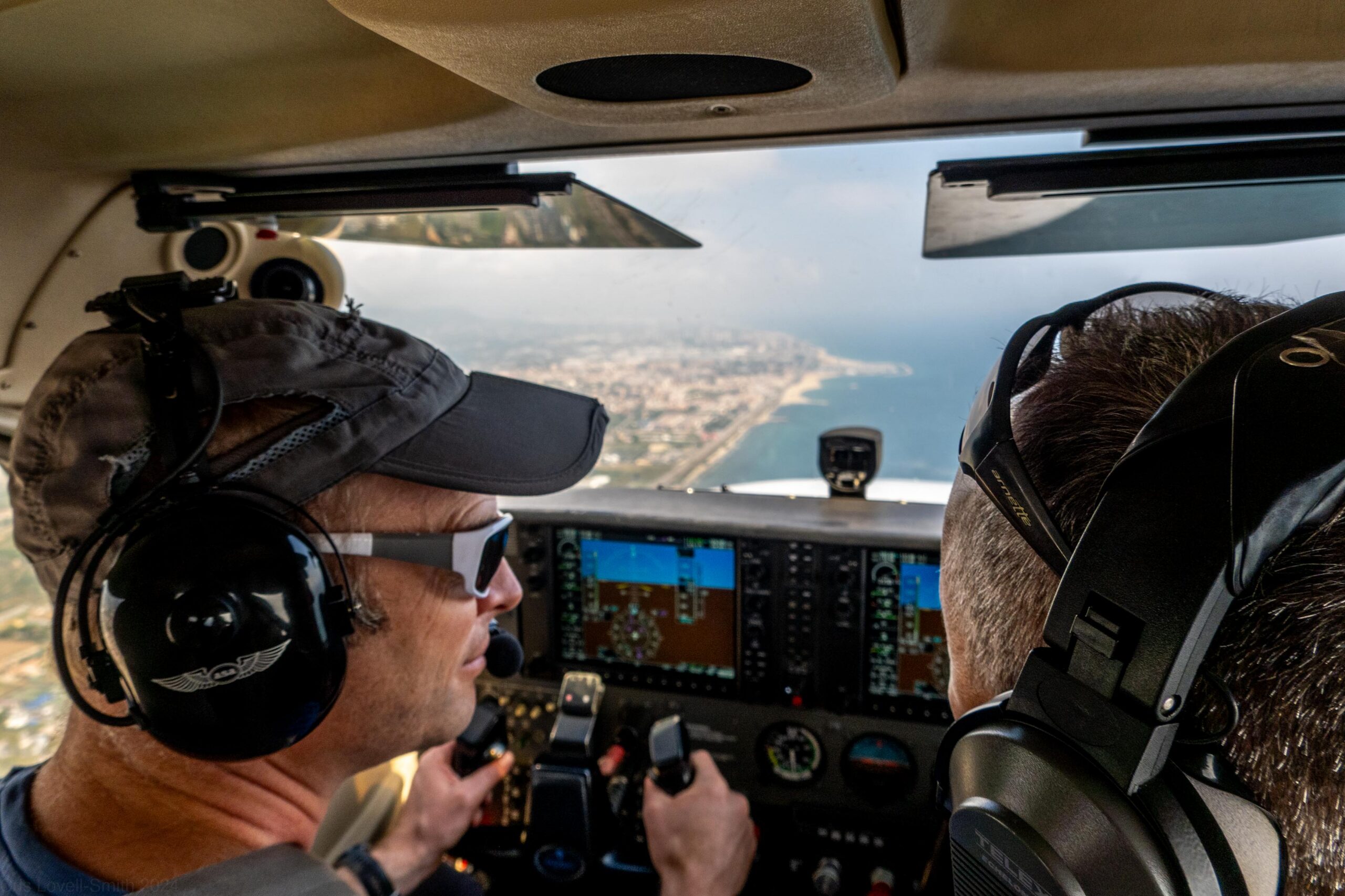 But this wasn’t quite it either. I laughed and said a few times that Joan should be up the front instead of me. Francesc started to tell me a few things about how the plane worked, strictly informational, I thought. It wasn’t until we’d already taken off and were flying for a few minutes that it finally clicked that I was expected to be flying the thing. It turned out Francesc was a flying instructor and this was my first lesson!